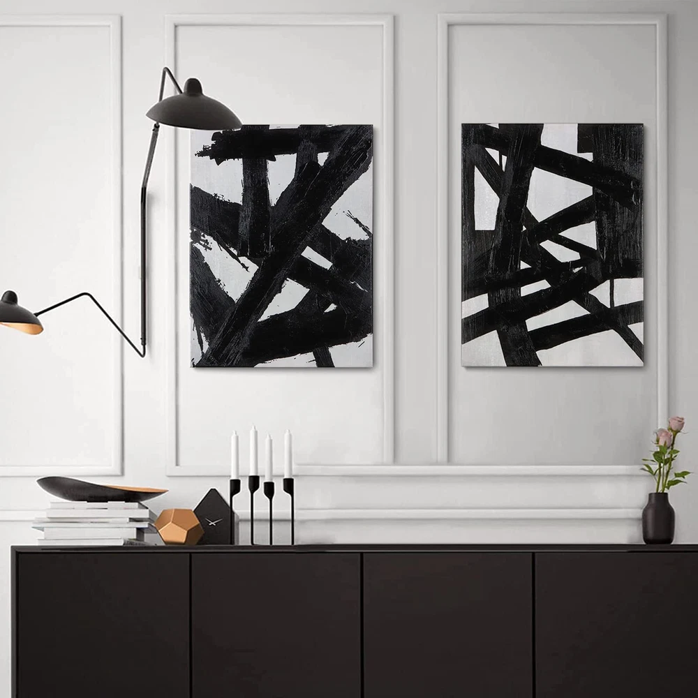 Description: Abstract Canvas Wall Art The abstract wall art create a free feeling for your space, moreove, it hand-emblished with rich texture by artist on a high definition print canvas. The embellishement made it a real painting. It's so modern looking and brightens up the room, perfect important days gifts for yourself or someone special. Artwork Width: 23.6 inch for set Artwork Height: 15.7 inch Artwork Depth: 0.8 inch 11.8*15.7*0.8 inch for each panel Number of Wall Art Pieces: 2 Weight: 1.8 lb Property: Wall Art Theme: abstract Artwork Style:Modern, Contemporary, Artwork Frame Type: No Float Frame,But Solid wood stretch frame inside Artwork color: Black Artwork coloring: Black Artwork Medium: oil Wall Art Surface Material: Canvas Abstract Wall Art: This abstract wall decor of black bolded strokes will add a modern and elegant charm to your home or office High Quality:The black abstract wall art printed on canvas with rich embellishment and stretched over the solid wood bar, vibrant, sturdy and shrink-resistant Easy to Hang: The black canvas wall art comes with bracket and accessories, very light weight, a breeze to hang. Note: Due to monitor display issues, actual colors may slightly differ from pictures Note: Due to monitor display issues, actual colors may slightly differ from pictures Free to Purchase: The abstract canvas wall art are well packed with corner guard, would delivered safely to your doorstep. If there are any problems with your order, no hesitate to us