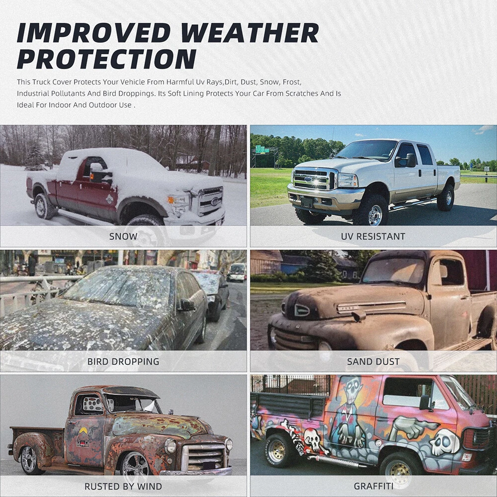 This full cover is a game-changer for my Tundra! The all-weather protection holds up perfectly against sun, rain, and dust while staying lightweight. Fits snug without scratching, and the waterproof feature actually works—no more wet seats after storms. Blocks UV rays like a champ and resists wind surprisingly well. Installation takes seconds, and the material feels durable yet breathable. Keeps my truck spotless between uses—worth every penny for outdoor parking!