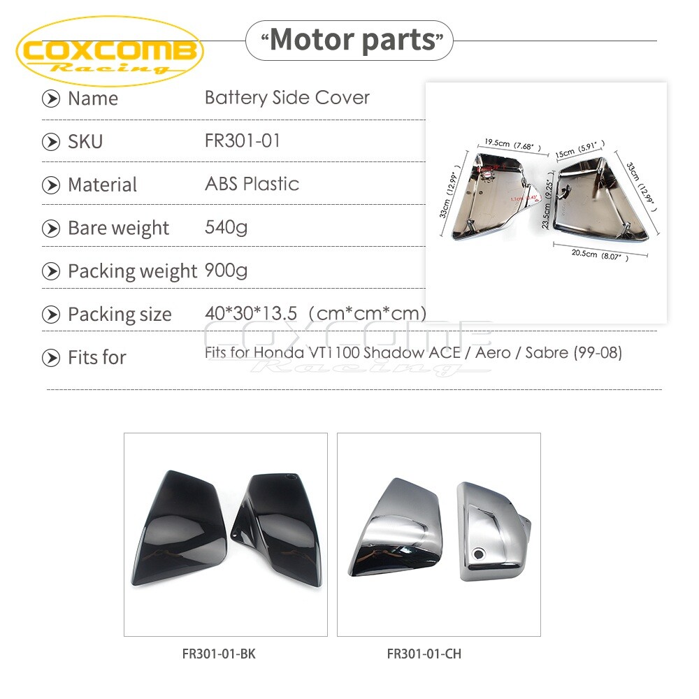Features: Protect your motorcycle battery, extend battery life. Enhancing the design of your motorcycle. Aftermarket parts, for modify use. Easy to install. Specifics: Condition:100% Brand New Material: ABS Plastic Type: Side Battery Cover Placement on Vehicle: Left,Right Fitment: For Honda VT1100 Shadow ACE / Aero / Sabre (99-08) Note: 1. Please allow 1-3mm difference due to manual measurement. 2. Please confirm whether suitable for your motorcycle before buying. Package Included: 1 Pair Side Battery Cover(Left&Right) Black Battery Side Fairing Cover for Honda VT1100 Shadow ACE AERO VT1100 C2/C3 Features: Protect your motorcycle battery, extend battery life. Enhancing the design of your motorcycle. Aftermarket parts, for modify use. Easy to install. Specifics: Condition:100% Brand New Material: ABS Plastic Type: Side Battery Cover Placement on Vehicle: Left,Right Fitment: For Honda VT1100 Shadow ACE / Aero / Sabre (99-08) Notes: 1. Please allow 1-3mm difference due to manual measurement. 2. Please confirm whether suitable for your motorcycle before buying. Package Included: 1 Pair Side Battery Cover(Left&Right) Notice: If there is import tax, it is paid by buyers, we are not responsible for the custom duty. Note: coxcombracing2021's parts are not sponsored or endosed by, or affiliated with, KTM and DUKE. Payment Delivery details Return About us Feedback Payment 1. Please pay within 3 days from close of auction. 2. We only accept Paypal payment. 3. Buyer needs to responsible for any import tax, duty, VAT, if your country required. Delivery details Shipping Time: Sometimes shipping time may has a little delay, such as Customs check packages strictly ,bad weather,holidays. USA, UK, Canada, Australia and Singapore need around 7-18 working days(Excluding weekend and Holidays).Other countries need around 2-4 weeks.We strive our best to provide you the most reliable way of shipping service. If you do not receive your item on time, please contact us immediately for further assistance.Thank you for your understanding. International Taxes And Duty Fees: Import duties, taxes and charges are not included in the item price or shipping charges.We will mark "Gifts" on custom form. The buyers are fully responsible for any international taxes & duty fees, which may be charged upon delivery.Please check with your country's customs office to determine what these additional costs will be prior to bidding/buying. Packaging: 1.All items are checked before dispatch and are carefully hand-packed by our in-house team. 2.We always taking great care packaging every item to ensure safe and perfect condition to you. 3.We will make every effort to prevent damage in transit. Please Note: Please note your Telephone when your payment.Telephone are must for international express shipping. Return Return Details: 1. If you are not 100% satisfied with the item, please let us know the detailed problem.We will help you resolve the problem as soon as possible. 2. If you received an incorrect, damaged, defective, or item not as described, please contact us.We will give you a best solution. 3. If you want to return the item,please contact us within 14 days after package received .Return products must also be in its original condition: including box, packaging and all other accessories. Returns that are a result of customer error will be subject to an actual shipping fee deduction from the refund. 4. Buyer should pay for the return shipping fee if All Non-Seller Mistake returns for refund (E.g. you brought wrong size or wrong item). 5. Please make sure the item have NO man-made sabotage. If you broken it , please NOTE that the shipping and handling fee will not be refunded, Buyers are responsible for the postal cost of returning the items Items returned must be in the same condition that they were received. How to return 1. Please contact us for Return Merchant Authorization Number (RMA) and return address . 2. Shipping back the package . The RMA must be clearly written on the return package,Otherwise the package will be refused. 3. Mail us the return tracking number. 4. All returns will be inspected prior to a credit being issued. About us Working Hours From Monday To Friday(Beijing Time 9:00-18:00) 1 . We try our best to reply to your emails as soon as possible, however, due to high volume of daily incoming emails and time zone difference, we may not be able to reply your emails immediately. Please allow 1 business days for us to response. If you do not receive any reply from us, please check your email ensuring your mailbox has not reached full size. 2. Due to some ISP SPAM filter settings, you may not be able to receive our replies; If you have problems receiving our emails, you may need to use a different email account to contact us. 3. Please give us the opportunity to resolve any problem. We understand the concerns and frustrations you might have, and will try our best to resolve the issues. Please email us before leaving any negative feedback or open any dispute on PayPal. 4. We care about our valued customers, and will always try to help you. So if you have any problems, please e-mail us immediately. Feedback 1. We hope to give you a positive eBay experience by working hard, and we expect to receive a positive feedback and Detailed Selling Rating (DSR) of 5 Rating in all of the feedback categories from the buyer upon receiving the item . 2. If you have any problem on our items or service, please don’t hesitate to contact us before you leave any Neutral/Negative feedback, we will try our best to help you resolve the problem. 3. Communication is the best way to solve problem.Thank you for your understanding.