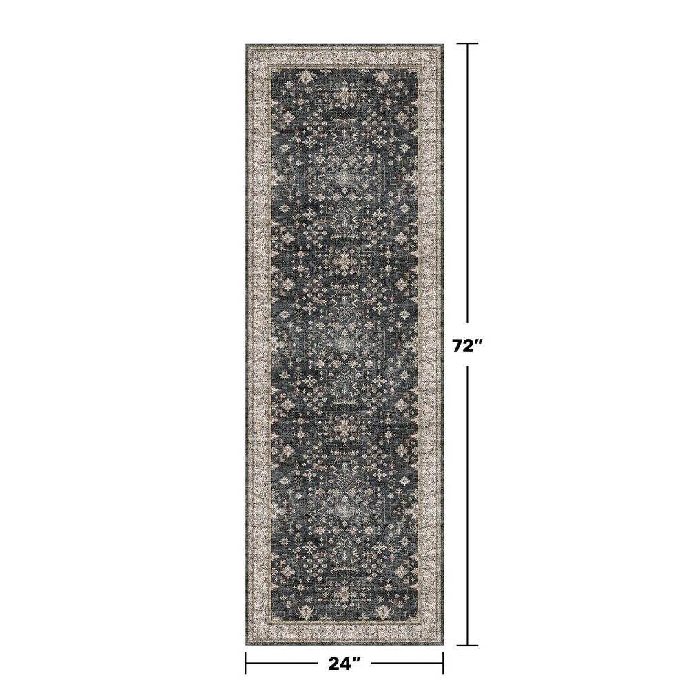 Transform your space with our stunning Oriental-Inspired Area Rug, featuring a backdrop accented by vibrant colors and vivid geometic lines, and intricate floral motifs. This rug brings a perfect blend of tradition and boldness, making it an ideal centerpiece for any room. Crafted with a vintage, distressed finish, it exudes a timeless charm that seamlessly fits into boho, eclectic, or classic decor styles. Key Features: * Versatile Design: Perfect for a variety of spaces, including bathrooms, entryways, hallways, kitchens, laundry rooms, office chair mats, nurseries, dining rooms, bedrooms, and living rooms. * Durable Construction: Made with high-quality materials to withstand daily wear and tear. * Easy Care: Washable and stain-resistant for hassle-free maintenance. * Non-Slip Backing: Provides a secure grip on your floors, preventing accidents. * Low Pile: Ideal for easy vacuuming and cleaning. * Available in Multiple Sizes and Colors: Choose the perfect size and color to match your decor. Available Sizes: 2x3 ft 2x6 ft 3x5 ft 5x7 ft 5x8 ft 6x9 ft 8x10 ft 9x12 ft 10x14 ft Available Colors: Beige / Latte Charcoal / Black Terracotta / Aqua Grey / Sage Parakeet / Green Navy Blue Pink Bring a Bohemian Vibe to Your Home Today! Machine Washable & Easy Care: Keep your rug fresh with ease! Simply vacuum regularly, or for a deeper clean, toss it in the machine. Ideal as long kitchen runner, laundry room decor, entrance and hall way rug, or bathroom carpet. Non-Slip & Safe: Enjoy safety and stability with the rug’s strong non slip rubber backing, designed to stay firmly in place and prevent accidents. Perfect for laundry room runner rug, kitchen mats for floor, entry way rug, or stair runners. Kids & Pets Friendly: Promising a luxurious feel underfoot, this low-pile (0.25") rug resists messes like pet hair, dander, and stains. Gentle on playful paws and claws, it reduces floor scratches and withstands chewing or digging Tribal Distressed Elegance & Versatile Design: Anchored by a deep black base with artfully distressed detailing, this area rug blends vintage motifs with bohemian character. Subtle accents of charcoal, beige, taupe, gold and stone gray add visual depth, cool style, creating a timeless yet expressive foundation. Perfect for inspiring decor ideas in eclectic, modern, or laid-back interiors, it enhances your space with a rich mix of soul and texture. Tips: Folded rugs may have creases when they arrive. Roll out the rug and allow time to flatten and settle.When vacuum, use soft roller cleaner head/ dusting brush only and vacuum on the lowest setting. Machine wash gently in cold water and never bleach. Air dry or dry on air-only cycle without heat.