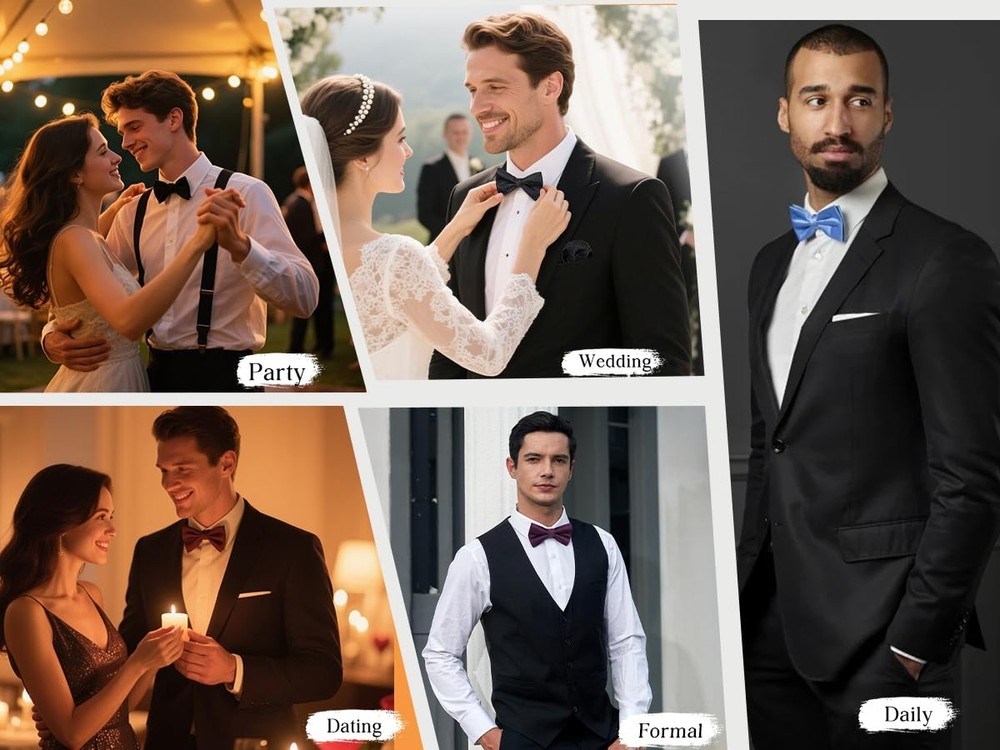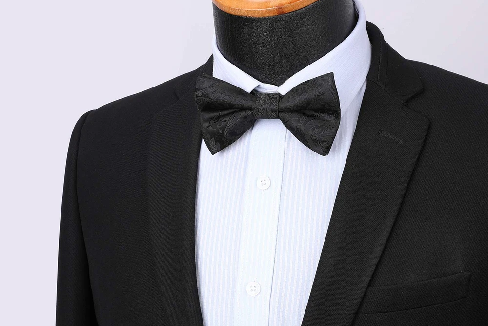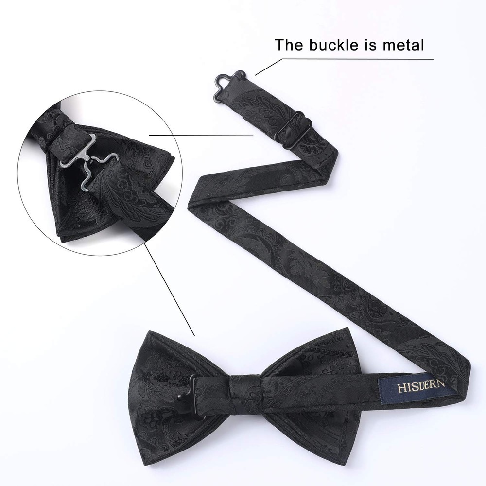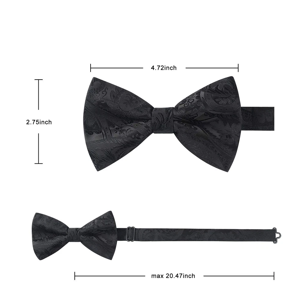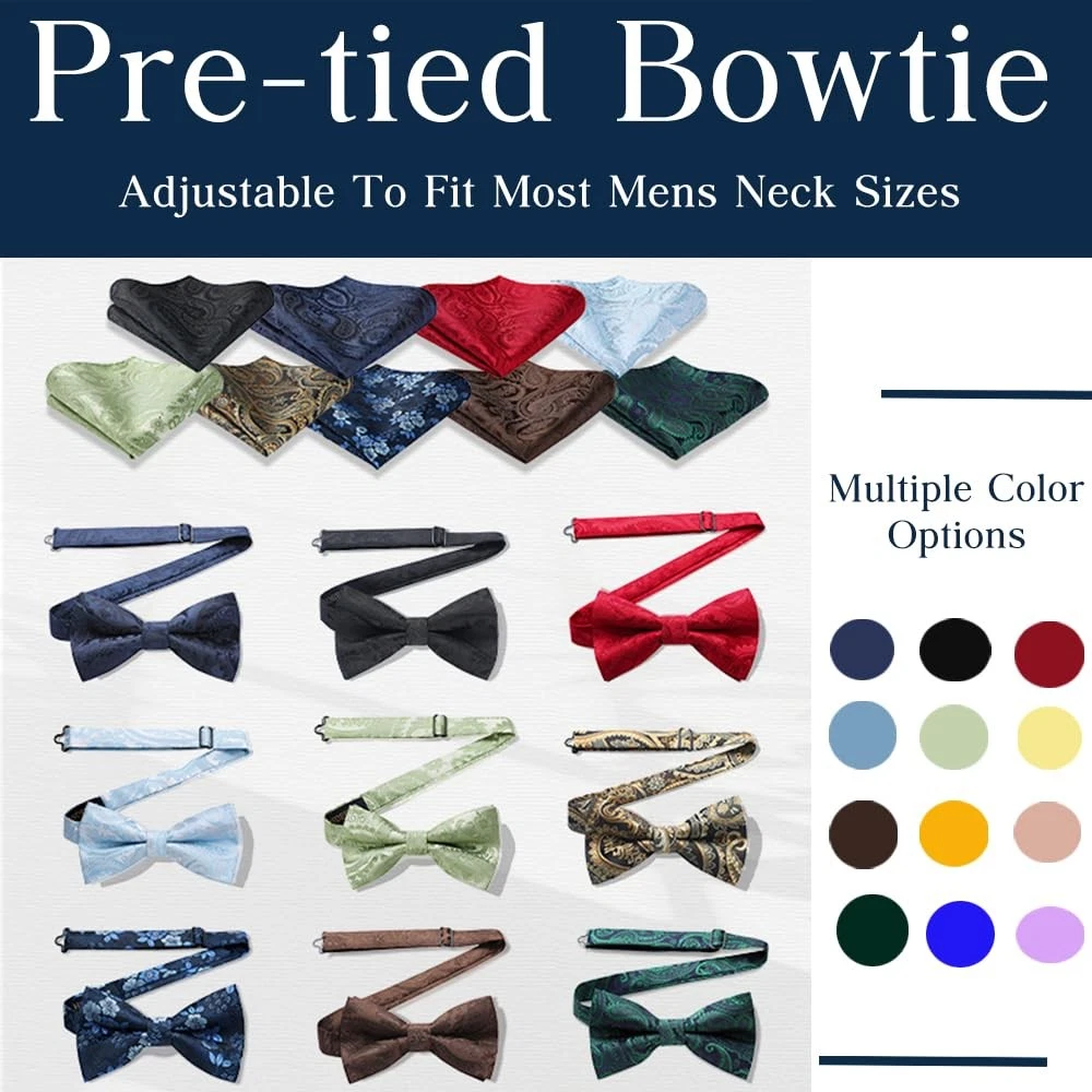 Our pre-tied bow ties are high-end accessories for a variety of special occasions including weddings, proms, parties, funerals, as well as being the supplement to professional attire. They feature diverse patterns like florals and paisleys, elevating your wardrobe's style. These bow ties are versatile for multiple occasions, with floral designs suited for lively daytime events, and paisley for formal or evening affairs. They add a pop of color to any monochromatic outfit and blend well with ensembles that already hint their color. Whether you're looking for a bold statement or a more reserved, elegant look, our range of colors caters to diverse preferences. Our bow ties are meticulously crafted to ensure a comfortable fit and a knot that retains its shape without wrinkling. They are made from superior materials that are long-lasting, easy to care for and wrinkle-resistant. They maintain a fresh look even after long periods of wear or repeated use. The pre-tied bow ties have a reliable fastening. There is no complicated way to tie it, just clip it on. Simple, convenient and time-saving. With stylish and elegant design, they not only enhance your unique look on any occasion, but also your professional image. As a thoughtful and stylish present, they are also very suitable for boyfriend, husband, father on occasions such as Christmas and Father's Day birthday. Pre-Tied Bow Tie: this pre-tied bow tie is incredibly easy to wear, saving you time and effort. An essential accessory for any style-conscious gentleman, it seamlessly complements collared shirts and tuxedos Bowtie Size: the mens black bow tie has a total length of 22 inches and an adjustable collar size of 9.8 to 20 inches. The handkerchief measures 12" x 12". The package includes a Stripe Paisley Floral pre-tied bow tie and pocket square Occasion: This elegant bow tie, both long-lasting and appealing, is great for any occasion - from tuxedo weddings, holidays to festive parties. It serves as a special and thoughtful present for your husband, bridegroom, or boyfriend Superior material: made from 100% polyester, our bow tie offers amazing color options. With over 10 years of experience in designing bow ties, our focus on quality ensures durability. The soft texture of the fabric makes it comfortable to wear and touch Package includes: 1 pre-tied bow tie and 1 handkerchief. Exceptional material, easy to clean. Suitable for most adults. We have paisley/crushes/solid/stripes/floral/polka dots/multi-colour styles to meet your daily matching
