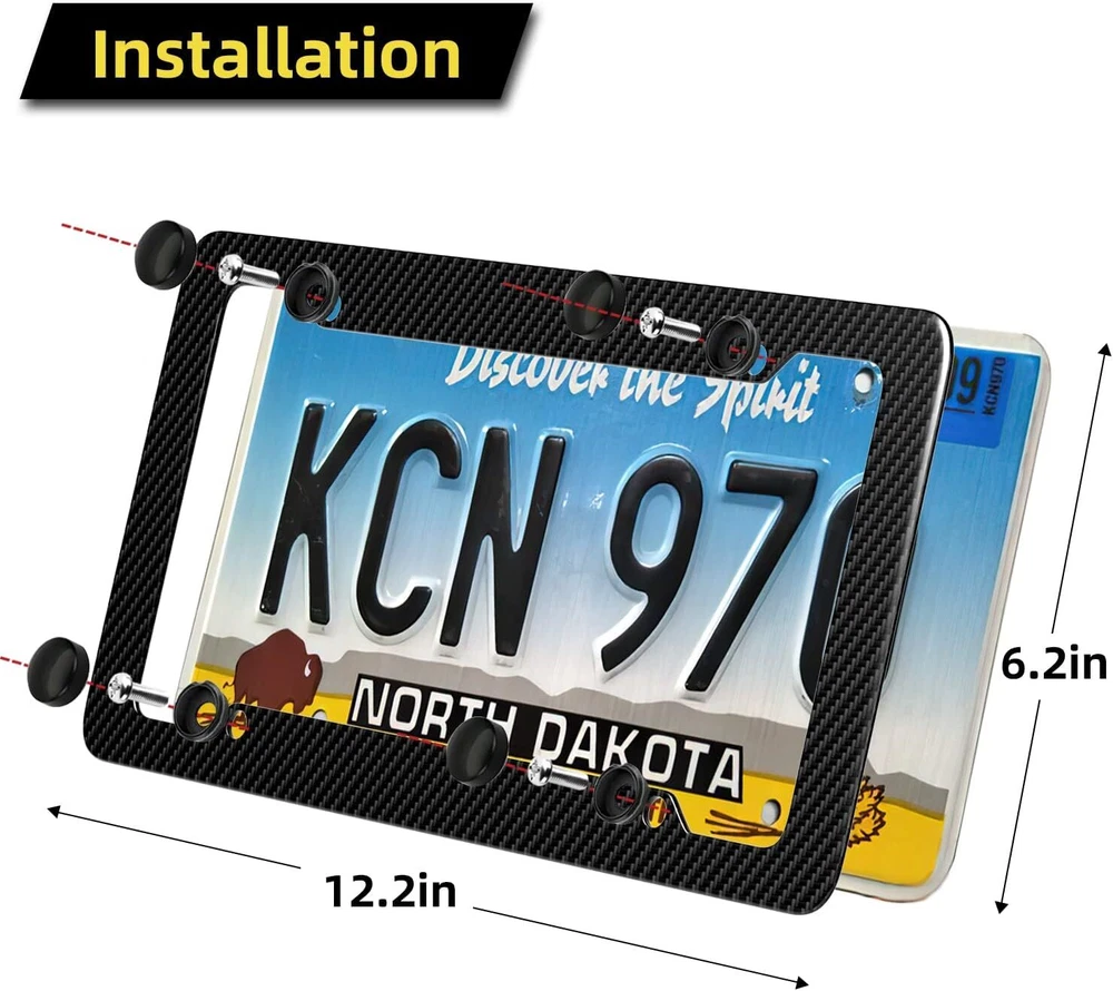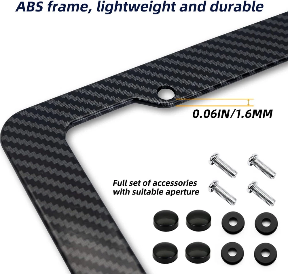 Black Carbon Fiber License Plate Frame, 2 Pack Glossy Waterproof fiber Product Details Color: Carbon fiber Brand: OKLPF Vehicle Service Type: Car Product Dimensions: 6.3"L x 12.2"W Finish Type: Powder Coated Manufacturer: LXCAR Item Weight: 14.1 ounces Item model number: LX0150 Manufacturer Part Number: LX0150 Color: Carbon fiber Brand: OKLPF Vehicle Service Type: Car Product Dimensions: 6.3"L x 12.2"W Finish Type: Powder Coated MaterialFit Type: Carbon FiberStandard Our carbon fiber license plate frame comes with mounting holes and fits most of the standard USA license plate. Use our license frame to make your car looks more elite, modern, and stand out from the mass without breaking the pocket. Why we choose LX license plate frame: We are professional license plate frame manufacturers, we make sure that every license plate frames were passed the qualification inspection. We sell directly form the factory without any middleman, the price will be cheaper and also we can provide excellent post-sales service U.S. standard license plate frame: “12.2”*”6.3” inches license plate frame fit for all America and Canada license plate. The aluminum license plate can be a well protected. NOTE: the license plate frame is designed for most of situations, According to the laws in your state, please make sure our license plate frame will not block out any information of the license plate Special production process: Our license plate frame uses water transfer printing technology to make the surface of the entire license plate frame smoother, the carbon fiber texture is not easy to fall off, and it is more durable Sports style: AS we all know the real carbon fiber is very expensive, the plastic license plate frame printed with carbon fiber pattern is very light and easy to install, you can spend less money to decorate your car whit carbon fiber, it makes your car looks more sport
