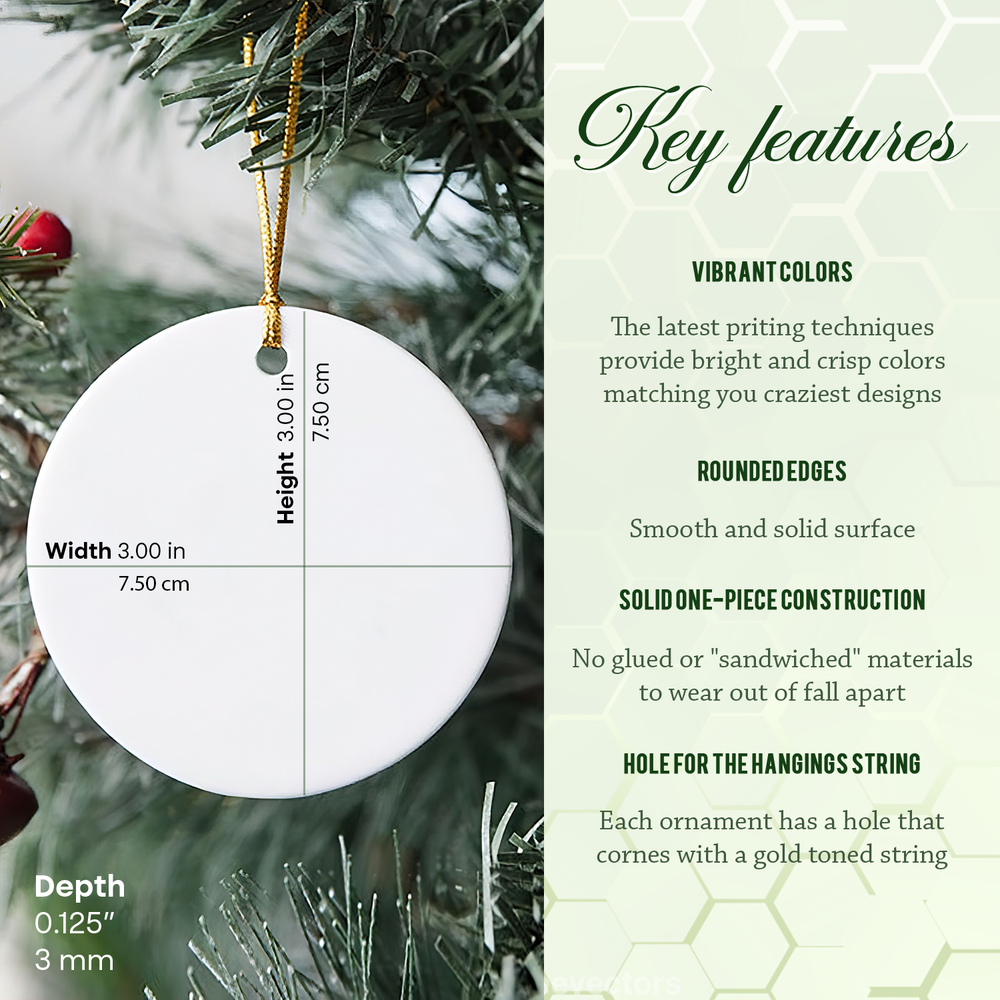 Add a personal touch to your holiday décor with our Ornaments ! These beautifully crafted ornaments are perfect for decorating your Christmas tree, giving as a thoughtful gift, or celebrating special memories. Made from high-quality ceramic with vibrant, fade-resistant printing, they are designed to last year after year. Product Features: High-Quality Ceramic: Durable, smooth, and built to last. Customizable Designs: Personalize with your favorite photos, names, or special messages. Vibrant, Fade-Resistant Printing: Ensures your design stays bright and colorful. Perfect for Any Occasion: Great for Christmas, weddings, anniversaries, or as a unique gift. Includes Hanging Ribbon: Ready to display right out of the box. Size: Width: 3 in Height: 3 in Depth: 0.125 in Why Choose Our Ornaments? Whether you're commemorating a special event or creating a meaningful keepsake, our custom ornaments make every moment memorable. Each ornament is carefully crafted with attention to detail, ensuring high-quality printing and a beautiful finish.