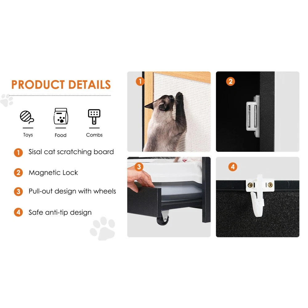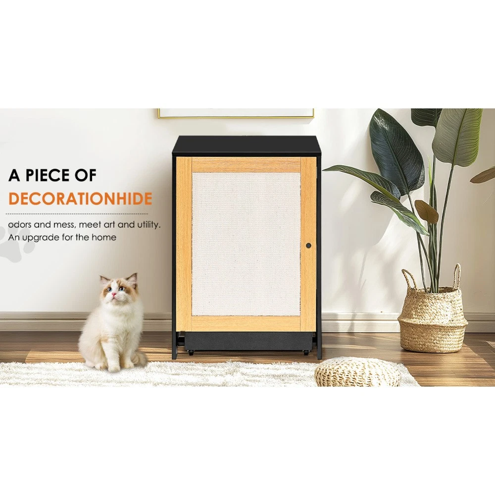 đ Key Features & Why Youâll Love It Sisal Scratching Door Panel The door is covered in sisal cloth, satisfying your catâs scratching instincts while adding a chic touchâboth beautiful and practical. Pull-Out Litter Box Design with Wheels The bottom plate (with 4 wheels) slides out easily, letting you clean the litter box with minimal effortâno more awkward reaching or mess. Built-In Storage Space The upper shelf holds cat litter scoops, cans, toys, and moreâkeep cat supplies organized and your room tidy. Eco-Friendly P2 Particle Board Made with high-standard, non-toxic P2 particleboard, itâs safe for both cats and humansâensure your petâs health and your peace of mind. Discreet & Stylish for Any Room This hidden litter box enclosure doubles as an end table, blending seamlessly into living rooms, bedrooms, or any space. It creates a private, odor-free area for your cat while maintaining your homeâs style. đ Product & Package Details Assembled Dimensions : 22.44â L x 19.69â W x 31.50â H (perfect for integrating into your decor). Product Weight : 42.68 lbs (sturdy yet manageable). Package Dimensions : 36.46â L x 25.83â W x 5.51â H Package Weight : 47.74 lbs (securely packed for transit). ⨠Hassle-Free Shopping Guarantees 1-Year Warranty : We stand behind our product! Enjoy a 1-year warranty against manufacturing defectsâweâll help fix or replace if anything goes wrong. 30-Day Free Return & Exchange : Not satisfied? Return or exchange within 30 days for free (just keep the product in original conditionâno questions asked). đ Perfect Gift for Cat Owners & Home Decor Enthusiasts This litter box enclosure is a thoughtful gift for anyone who loves cats and stylish home solutionsâideal for birthdays, holidays, or as a practical upgrade for pet parents. Order now and transform your beauty space-with our warranty and free return policy, you have nothing to lose!