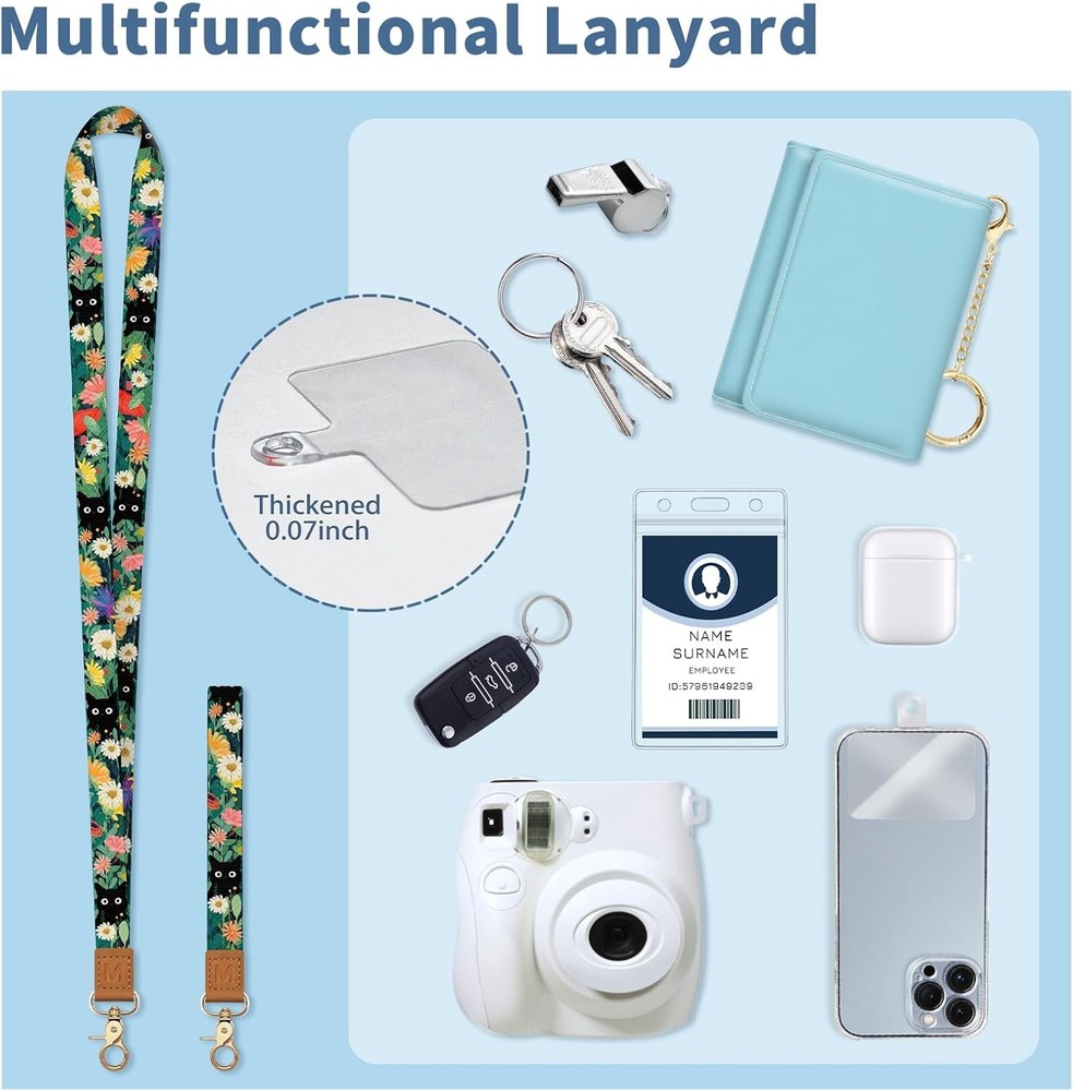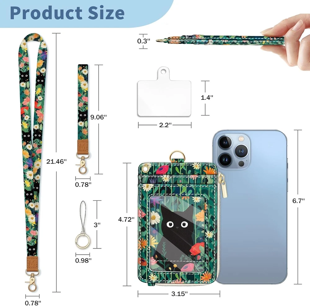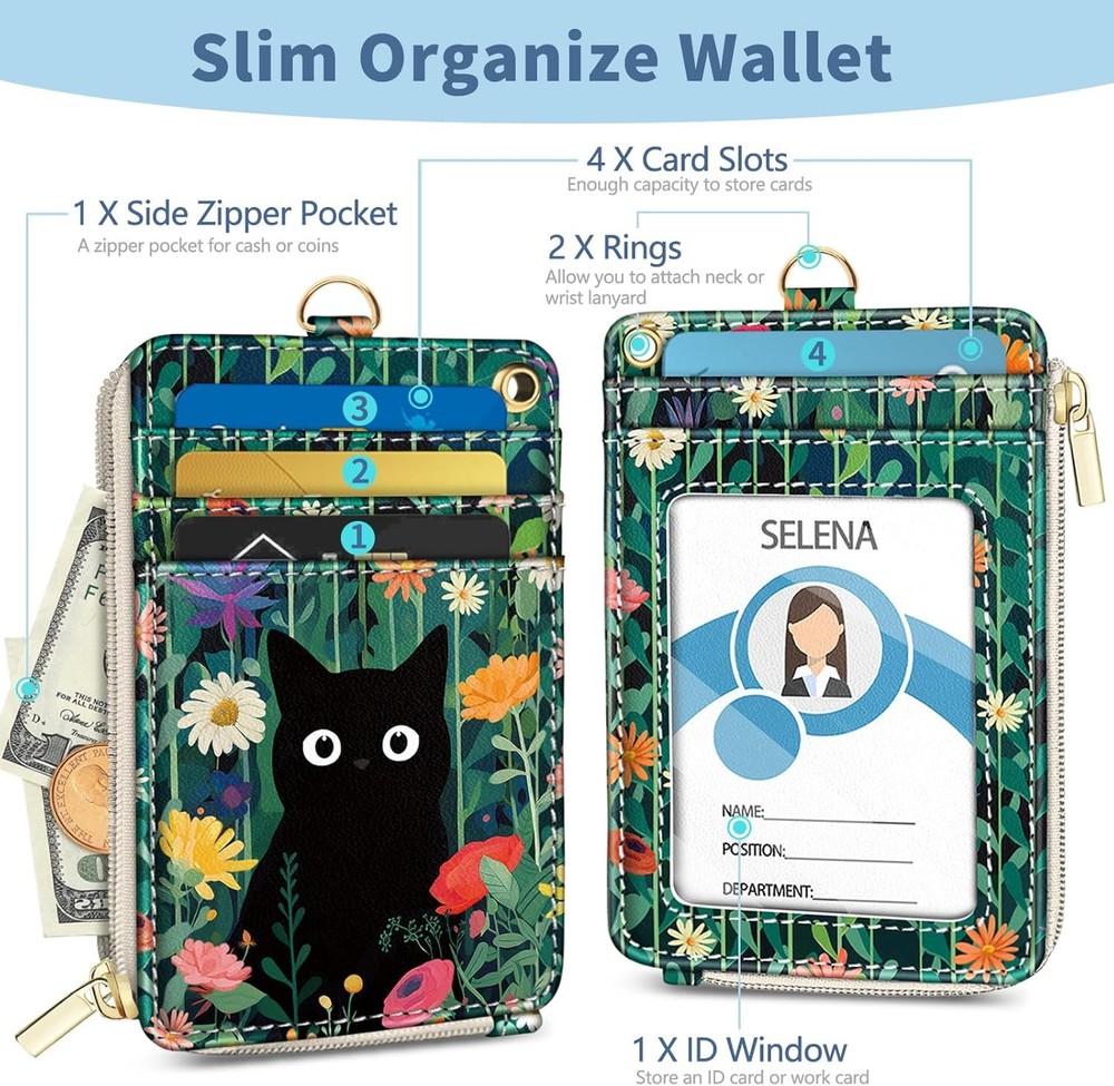 Lanyard Wallet with Id Badge Holder, Black Cat RFID Small Keychain Wallet Women Wristlet, Cute Zipper Credit Card Holder Phone Wrist Neck Strap for Key Name Tag, Teacher Student Office Gifts Lanyard Wallet with Id Badge Holder, Black Cat RFID Small Keychain Wallet Women Wristlet, Cute Zipper Credit Card Holder Phone Wrist Neck Strap for Key Name Tag, Teacher Student Office Gifts FREE AND FAST SHIPPING! About this item Unique Original Design: The 2-in-1 wallet lanyards for id badges feature a unique floral black cat design, letting you showcase your style while keeping your essentials secure, great for adding a playful yet practical touch to your everyday look. Package Included: neck lanyard x1, wrist lanyard x1, zipper id holder wallet x1, key-ring x2, phone tether tab x1 Slim Organizer Wallet: This compact card holder wallet measures just 4.72"×3.15"×0.3", fitting easily in pockets or purses for on-the-go convenience. The small credit card holder features 4 card slots, 1 clear ID window and 1 zippered coin pocket - suitable for organizing credit cards, cash, coins, IDs (including driver's licenses), and other daily essentials Multifunctional Lanyard: This versatile lanyard with id holder provides two convenient wearing styles - choose between the 21.5" neck strap or 9" wrist strap to suit different occasions. You can freely switch between these options according to your needs, whether for work, school, travel or daily activities. This id card holder with lanyard also comes with a cell phone tab and key-ring to keep your belongings safe, including cards, wallet, keys, cell phone and other everyday items RFID Blocking: This slim card holder is made with premium PU leather and tight stitching for tear resistance, featuring built-in RFID protection to safeguard your cards from both physical and digital threats. The badge lanyard is crafted from soft, skin-friendly polyester that's both lightweight and hard-wearing, ensuring comfortable all-day wear Amazing Gift: The id lanyard badge holder for women is excellent for teachers, students, drivers, office workers, nurses, doctors for daily use. Our badge wallet also make great gifts for daughters, mothers, wives, friends, on special days such as birthdays, Valentine's Day, Mother's Day, Christmas, Thanksgiving, or Teacher's Day Product We offer a 30-Day Return Policy on items which you are not completely satisfied with. You have the option for a full-refund or an exchange of the item. No returns are available on items shipped outside of the US . Shipping We offer Free Shipping to the US and ship within 2 business days of payment, usually sooner. We use UPS express shipping. That's why your products are usually delivered within 3 days . Contact We try our very best to make sure every customer is completely satisfied. If there's a problem , message us! We're happy to help. 24/7 live chat available.