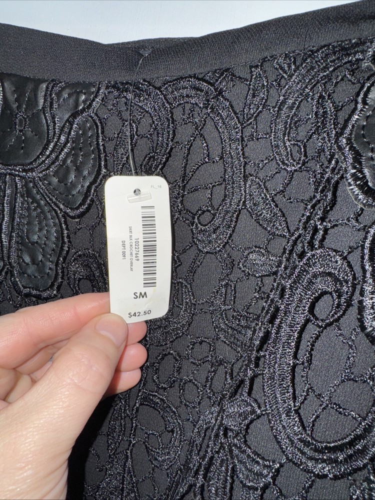 This is a Black Crochet Mini Skirt in size Small, featuring a classic, glam, formal, goth, punk, and fairy style. The skirt has a pull-on closure, is made of lace fabric with crochet and layered accents, and is lined and lightweight. It is designed with a floral pattern and is suitable for occasions like travel, parties, casual wear, workwear, or business attire during the summer or spring seasons.