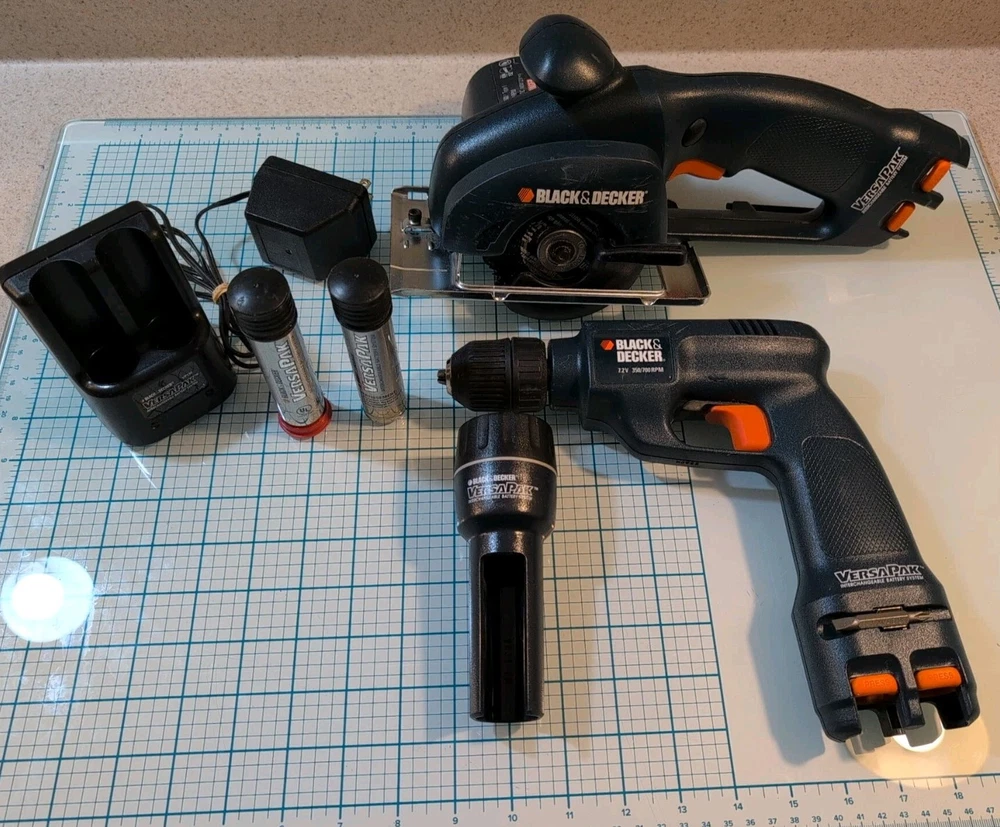 Black & Decker Versapak 3 tool bundle saw, drill, flashlight, 2 batteries, and charger. All item's have been tested and working