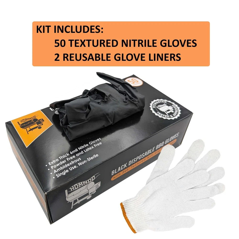 Kit includes 50 outer nitrile black disposable gloves with textured grip plus 2 machine washable and reusable inner cotton glove liners. Great smoker, grill, bbq accessories. Texture provides additional grip on grill tools, cutlery and meats with more surface area than standard black BBQ gloves by channeling away liquid from sauces, oils, rendered fat and more. Heavy duty, industrial 6 mil thickness nitrile black cooking gloves grill accessories provide better puncture and tear resistance and are an excellent barrier against meat, sauces, oils and grease Cotton glove liners under the BBQ disposable gloves are the perfect for BBQ by providing heat resistance handling food over the grates and the convenience of a disposable outer grilling meat gloves Large size grill gloves are free, latex free and food safe black nitrile heavy duty disposable bbq gloves provide extra comfort during heavy duty and extended use