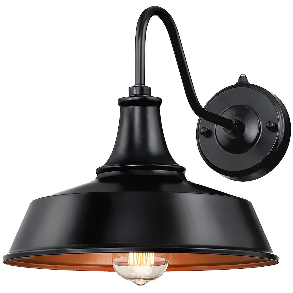 This farmhouse barn style outdoor wall mounted sconce light features a gooseneck and dark sky metal shade, finished in matte black and copper inside, weather-resistant and rust proof. It is an ideal outdoor wall light selection for front doorway, porch, driveway, backyard or garage to enhance vintage, farmhouse, rustic, or even coastal looks. It features a built-in dusk to dawn auto sensor which enables the fixture to automatically light on at dusk and off at dawn ETL listed for wet location. Weather-resistant & Anti-rust. Built-in dusk-to-dawn photocell controller provides nighttime-on, daytime-off for energy saving and convenience. E26 medium base socket, (1) 60-Watt MAX incandescent bulb or DIMMABLE LED bulb(not included) Hardware included for an easy setup Fixture is Free Shipping Over $49.99* Details 1-Light Black Dusk to Dawn Outdoor Wall Sconce Barn Light - 12"W Product Description: This farmhouse barn style outdoor wall mounted sconce light features a gooseneck and dark sky metal shade, finished in matte black and copper inside, weather-resistant and rust proof. It is an ideal outdoor wall light selection for front doorway, porch, driveway, backyard or garage to enhance vintage, farmhouse, rustic, or even coastal looks. It features a built-in dusk to dawn auto sensor which enables the fixture to automatically light on at dusk and off at dawn ETL listed for wet location. Weather-resistant & Anti-rust. Built-in dusk-to-dawn photocell controller provides nighttime-on, daytime-off for energy saving and convenience. E26 medium base socket, (1) 60-Watt MAX incandescent bulb or DIMMABLE LED bulb(not included) Hardware included for an easy setup Fixture is constructed from metal to ensure a long product lifespan Fixture dimensions11.5"H x 12"W x 18"E. Round backplate4.7 in. W Clear glass shade allows for maximum illumination Lantern style offers a transitional look, Ideal for Decks, Porch, Patio and Garage Before cleaning any lamp shade or fixture, disconnect the power source, wipe with a soft, dry cloth, avoid the use of chemicals and household cleaners as they may damage the finish Warranty1-Year limited warranty. Write to us if you need product support or product received defective, we'll response within 24hrs to help troubleshoot and/or provide replacement & satisfying solutions.