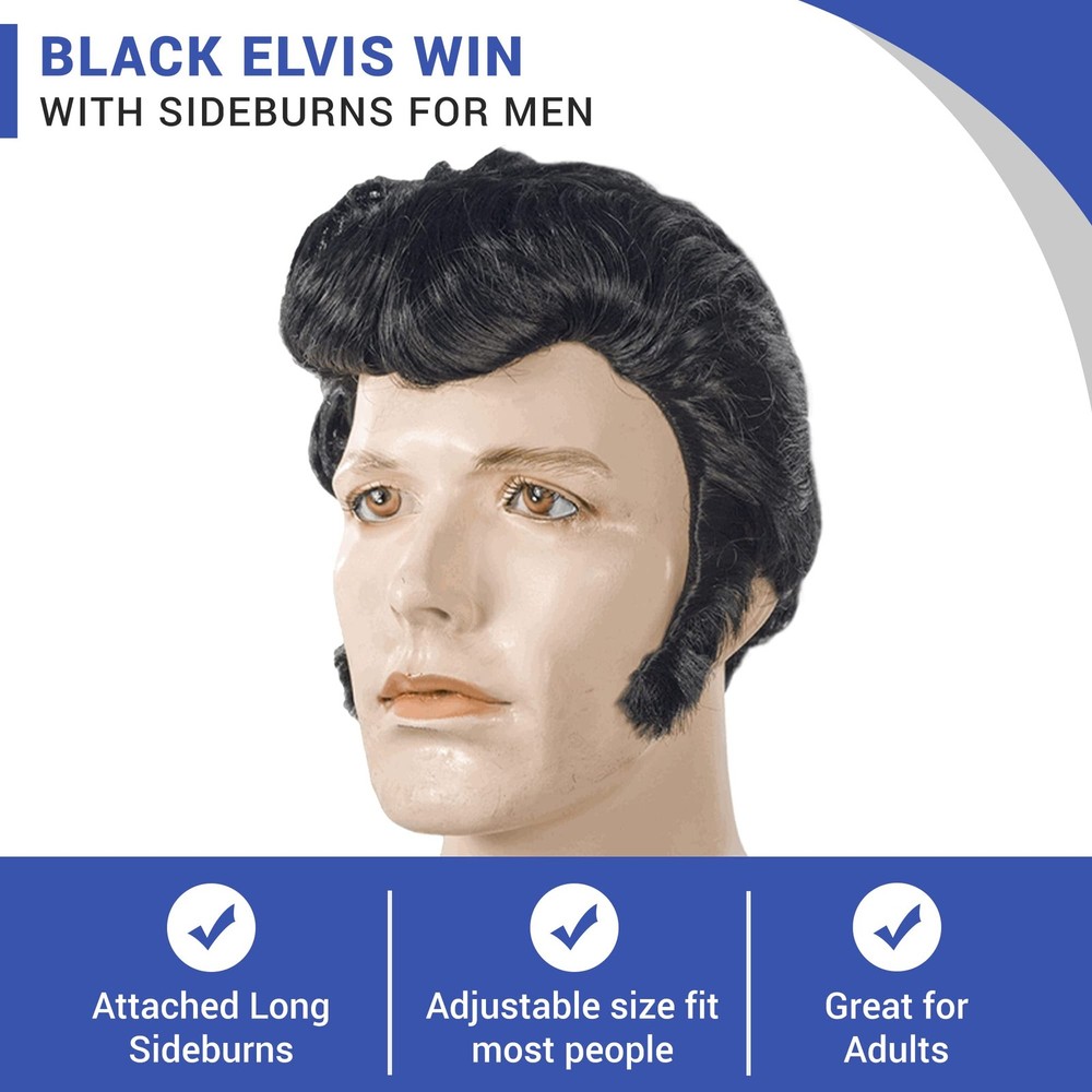 Great Elvis style costume wig for Halloween or having an Elvis celebration Stylish black Elvis wig with Sideburns Attached Long Sideburns Great for Adults Stretch cap that fits most heads For men or boys 12+