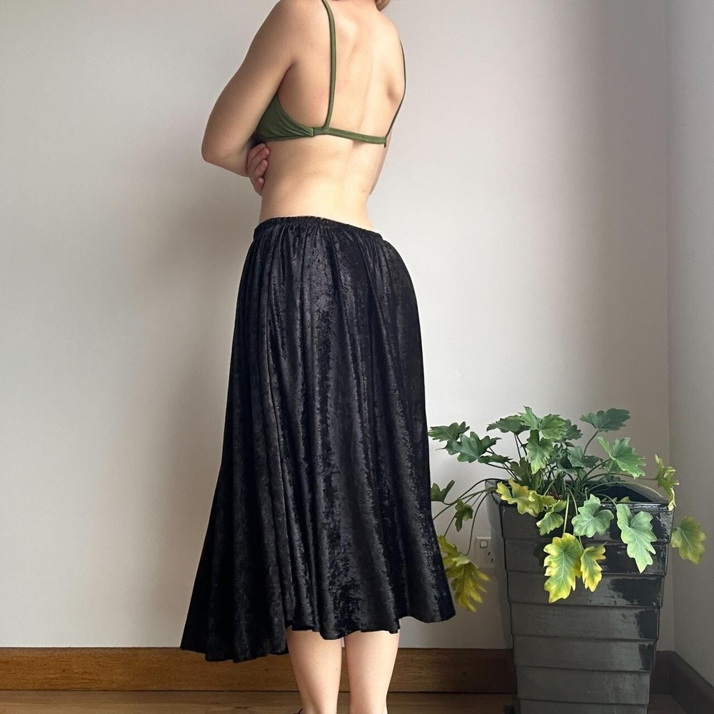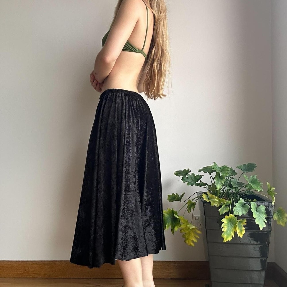 black glittery velvet midi skirt with elastic waistband no brand or size but would best fit approx size medium flatlay measurement (cm) waist: 34-55 length: 76 instant buys are welcome international shipping available eco friendly packaging item modelled on a size 8 who is 159cm tall unpinned 19 .