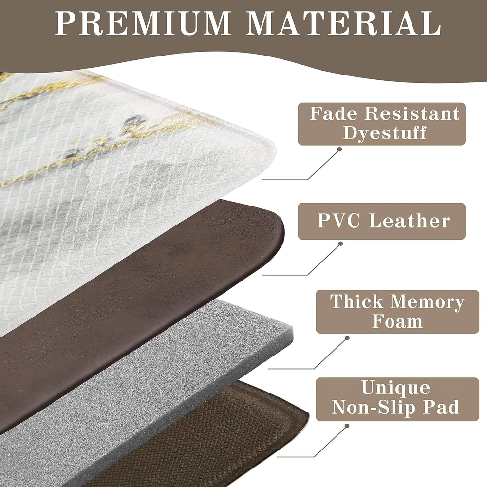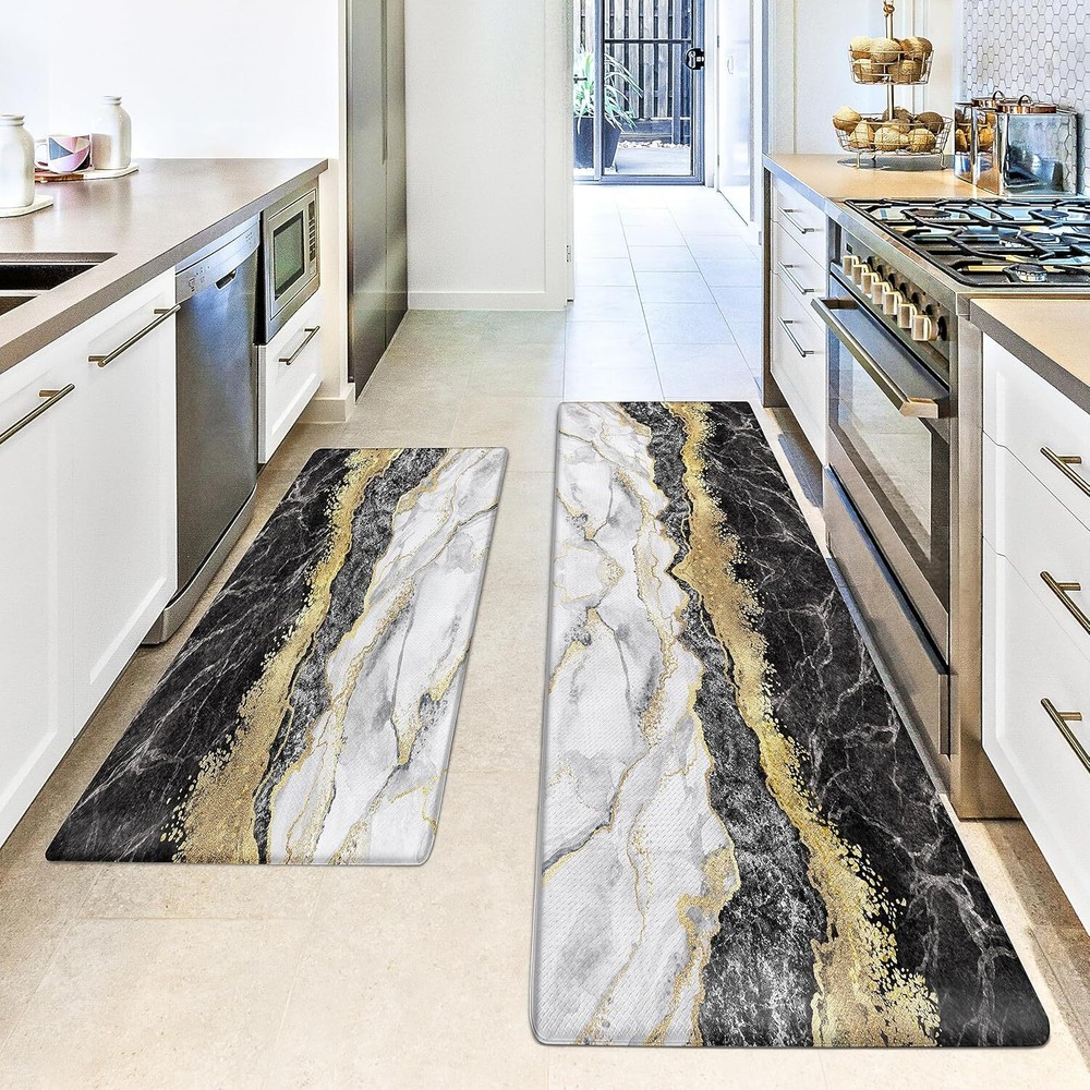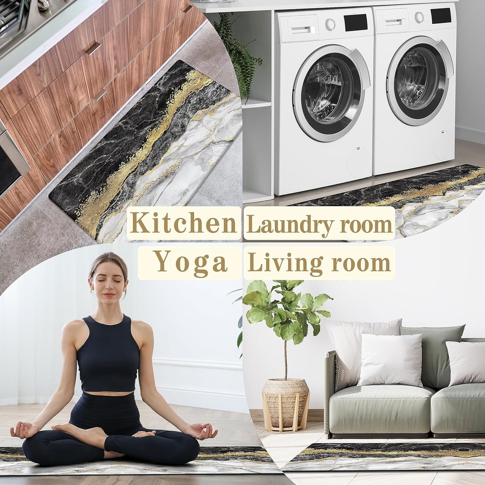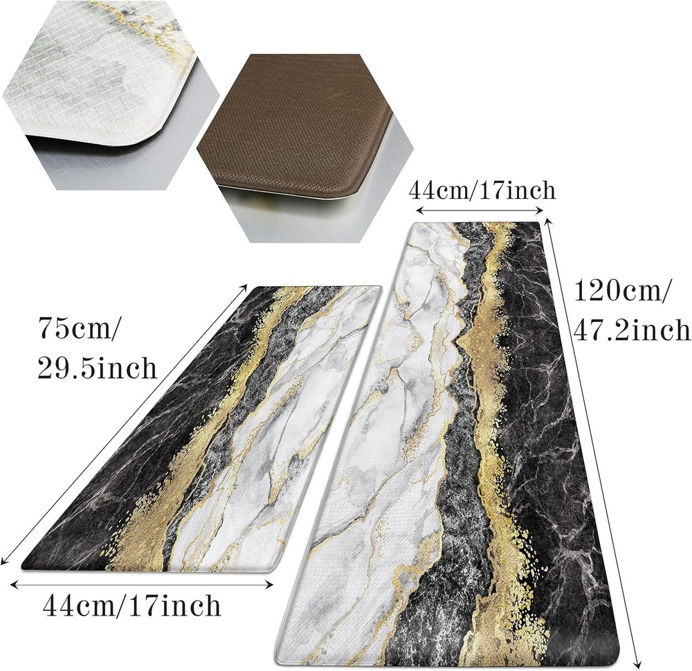 Black Gold Marble Kitchen Mat and Rugs 2 Pieces Anti Fatigue Cushioned Kitchen Floor Mat Non-Slip Leather Kitchen Mats Set for Home Office Laundry Item Description About this item ❤【ANTI FATIGUE KITCHEN MAT】This black and gold marble kitchen mat has a high-density foam layer, soft and comfortable, effectively relieving foot fatigue, which is suitable for long periods of standing on the kitchen floor and standing desks. ❤【PREMIUM LEATHER 】This thick black marble kitchen floor mat is made of leather material that is sturdy and durable. The moderate thickness and good resilience help to relieve foot fatigue. And the leather surface can help keeping the kitchen as clean as possible. The marble kitchen mats set includes 2 rectangular mats in size of 17"x29.5" and 17"x47.2" ❤【 NON-SLIP BACKING】This black and white kitchen anti-fatigue mat has a unique non-slip design on the back to ensure that the mat will not slide easily, effectively avoiding falls due to wet floors. It can be used for kitchen floors of different materials, such as wood surfaces, ceramic tiles material, and marble material, etc. ❤【MARBLE TEXTURE DESIGN】Unlike conventional marble kitchen rugs, this one adopts modern abstract marble elements to provide a comfortable, relaxing, and natural environment for you to enjoy a visual feast while cooking. ❤【CARE TIPS】This black and gold kitchen rug is very easy to take care of, the leather surface is designed to be cleaned quickly by simply wiping with a damp cloth or sponge. Warm tip: Not machine washable. › See more product details Marble kitchen mats with black and gold color collision, and combined with the beautiful marble pattern that brings more color and a sense of seniority to the monotonous kitchen. The right thickness can provide comfortable support to relieve foot fatigue when cooking or continue working after a busy day. A fine quality leather surface with a moderate thickness can effectively relieve the fatigue of the feet and knees. Exquisite edge pressing design effectively increases the durability of the kitchen floor mat. The surface of the kitchen mat is easy to clean, wiping it gently with a wet cloth for quick cleaning. Adopt non-slip rubber backing to keep the mat in place, and effectively avoid the floor mat moving that prevents you from slipping down as well. Suitable size and comfortable foot feeling ideal for various families and occasions, such as kitchen, doorway, outdoor, hallway, bathroom, bedroom, balcony, porch. Exquisite marble patterns can match your floor perfectly for decoration that adds color to your home. Payment We accept payment only through PAYPAL Shipping We ship products worldwide through standard express courier service, it will reach within 7 to 10 days to abroad buyers, we ship the product after recieved clear payment and give full information about shipment to the buyer Return We accept product return within 7 to 21 days from delivery date but product should be in original position and not in damaged condition,the return shipping charges will be buyer responsibility