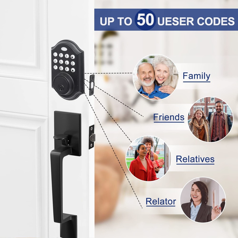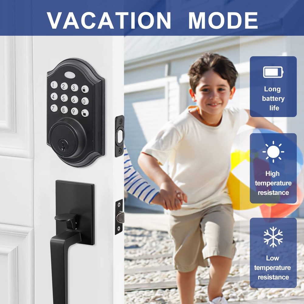 đȘăKeyless Freedom - Free Your HandsăOnly need to enter the set 4-8 password on the keyboard, you can easily unlock the door. There is no need to rummage for keys when you have clutter in your hand, and get rid of the dilemma of being trapped outside the door because you forgot your keys. đȘăOver 50 CodesăYou can set more than 50 codes. When your relatives and friends come to stay for a few days, you can set a special door code for them. You can delete the code after they leave without changing the code all the time. Safe and efficient. đȘăUnique Holiday ModeăThe door latch can be in holiday mode. In this mode, the consumption will be minimized and the battery life will be longer to ensure that you can still open the lock when you come back from vacation. đȘăSound ModesăElectronic Keyless Entry Door Lock has sound modes, you can choose to turn the sound on. If you don't like the beep sound, you can turn off the sound and there will be no sound. And it still works fine in cold weather. đȘăMatch all Kinds of Handles and KnobsăYou could change only the deadbolt on your door, you don't have to change the handle or lever, it will match a lot of handles and knobs. Also has excellent safety, Alloy construction, IP65 weather resistant, durable, safe and reliable to keep you and your family safe.