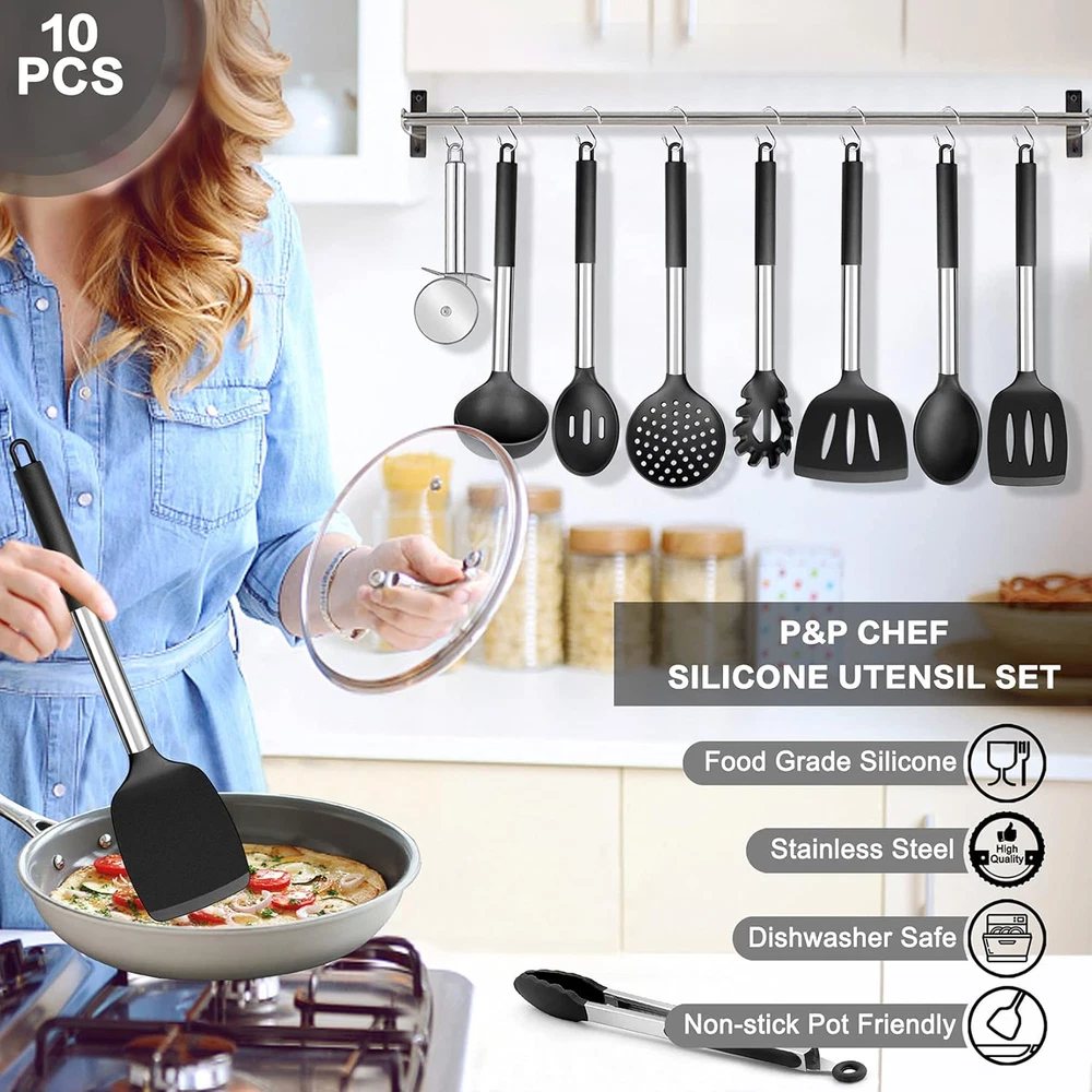 Store New Arrivals Add to Favorite View Feedback Contact Black Kitchen Utensils Set of 10, Heat-Resistant Silicone Cooking Utensil with Stainless Steel Handle, Include Turner,Spatula,Spoon,Tong,Pizza Cutter, Non-Toxic & Non-Stick, Dishwasher Safe Description Item Package Quantity 10 Color Black Material Stainless Steel, Silicone Material Type Stainless Steel, Silicone Is Dishwasher Safe Yes Shape Rectangular Recommended Uses For Product Cooking, Sautéing, Stirring, Scraping Is the item dishwasher safe? Yes Handle Material Stainless Steel Material Type Free Plastic Free 【VERSATILE 10 PCS】 P&P CHEF Kitchen Utensils Set is perfectly fit for various purposes, Include: ●Slotted Spatula, ●Slotted Turner, ●Solid Turner, ●Skimmer, ●Pasta Server, ●Solid Spoon, ●Slotted Spoon, ●Soup Ladle, ●Kitchen Tong, ●Pizza Cutter, This set will bring you excellent using experience 【HEATPROOF MATERIAL】 Our cooking utensils are made of food grade silicone, Will not get musty or produce peculiar smell, Be the greatest for wooden/ plastic cookware, Built to withstand the heat up to 450℉, You can rest assured that it will not melt, warp, discolor or release any toxic substances into your food, Definitely safe and healthy to the human body 【DURABLE &FLEXIBLE】 Featured with heavy gauge stainless steel handle, One-piece seamless design keep it sturdy, Will not break off or fall apart when using, Rust-free and Durable to last for a long service life, Flexible and soft spatula head is great to flip, stir, scrape and fold the most kinds of food without scratching your coated cookware 【EASY USE】 Sturdy handle wrapped in velvety silicone for heat and skid proof grasp, Smooth edge without sharp angles, Prevent cutting you hand, All the utensils are dishwasher safe, Non-stick and stain-resistant attributes make hand-wash in a breeze Big holes at the end of the handles for easily hanging on the kitchen wall 【ECONOMICAL SET】 Save a lot of money than buying them separately, Whether cooking sautéing, stirring or scraping, This utensil set will cater all your needs with their different feature, Best gift idea - Classic color set with a good-looking packaging box, for both aesthetics and practicality, A Ideal present for your friends Product Description P&P CHEF Kitchen Utensils Set of 10 is made of food grade silicone and stainless steel, Will not have any harmful substance into your food, Rust-free and Durable to last for a long service life. Have high-strength flexibility, Corrosion and heat resistance, Bringing you a healthier cooking experience. The 10-Piece cooking utensils will meet all your needs, such as cooking/ serving/ mixing/ preparing, etc. Perfect kitchen tools for your everyday cooking. WARM TIPS: ✔ Please Do Not rub them with a sharp metal. ✔ Please Do Not Directly Flame Fire on the Utensil. ✔ Please don't leave them in the sun for a long time. ✔ Please wash with soft dishcloth in warm, soapy water. ✔ Please dry them after washing, Store in dry place for their durability. SPECIFICATION: Material: Silicone, Stainless Steel Color: Black PACKAGE INCLUDE: ● Slotted Spatula ● Slotted Turner ● Solid Turner ● Skimmer ● Pasta Server ● Solid Spoon ● Slotted Spoon ● Soup Ladle ● Kitchen Tong ● Pizza Cutter ADVANTAGES: Certified Quality - Free from harmful substances, Healthier for daily cooking, Better than typical plastic/ wooden utensils. Dishwasher safe - Dishwasher safe without taking your valuable time, Also easily clean up by hand-wash. Easy Storage - Big hole at the end of the handle, Easy to hang on the kitchen wall, convenient to save storage space and get them when you need. ABOUT US We offer the best prices around on high quality products. Our E-store includes media such as books, movies, music and games while offering electronics, toys, sporting apparel, clothing, tools, general home, garden items and more. SHIPPING We are always working hard to ensure your package arrives as soon as possible. Please understand that some factors like weather, high postal traffic, and the performance of shipping companies are outside of our control. We offer free shipping to the lower 48 states and ship within 2 business days of payment, usually sooner. We do not accept P.O. Boxes. Please provide a physical address. For shipping outside of the continental USA, we only use eBay's Global Shipping Program.The item is shipped to KY and then sent to the rest of the world. International customers are responsible for all duties and taxes. Continue to check out in order to calculate costs for shipping the item to your country. Messages regarding eBay's Global Shipping Program MUST be directed at eBay EXCLUSIVELY. RETURNS We offer a 30-Day Return Policy on items which you are not completely satisfied with. You have the option for a full-refund or an exchange of the item. No returns are available on items shipped outside of the USA. PAYMENT We accept PayPal. CONTACT US This page content is yet to come Please ad us to your favorite seller and visit again later Thank You CUSTOMER SATISFACTION We try our very best to make sure every customer is completely satisfied. If there's a problem, message us! We're happy to help. WE ACCEPT Copyright © 2021 AutoDS. | All Rights Reserved