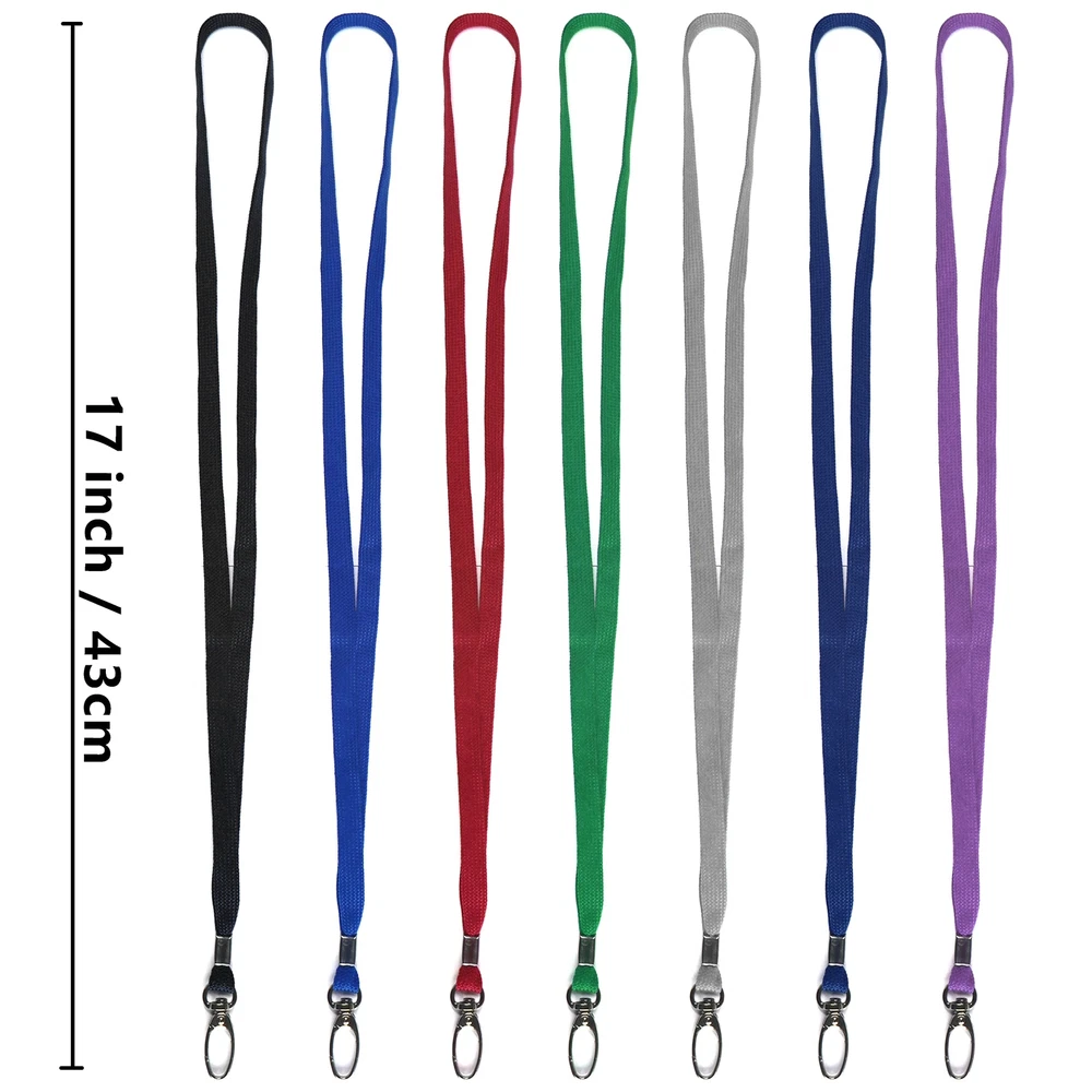 Package includes: 100 Pcs neck lanyards. Neck strap is 17 inches hanging. Width is 3/8 inch/1cm. Lanyards for name id card holders is made of nylon, washable, non-fading, wear no irritation to the skin, rope with the buckle is a metal buckle Lanyards clip rotation hook in order to wear comfortable,we use a slightly wider similar products on the market, while in order to consider the practicality, we use a metal buckle, it can be repeatedly pressed without deformation damage Bulk lanyards are widely used for hanging keys,Women,Badge Holders,work permits, student IDs,credit cards,If you need Badge Holders packages. Convenient to use: 360° Lanyard swivel hook. Easy to clip and untangle things with lanyard holes. Perfect for ID cards, work cards, student cards, credit cards, membership cards, exhibition cards, hotel key cards and cruise cards etc