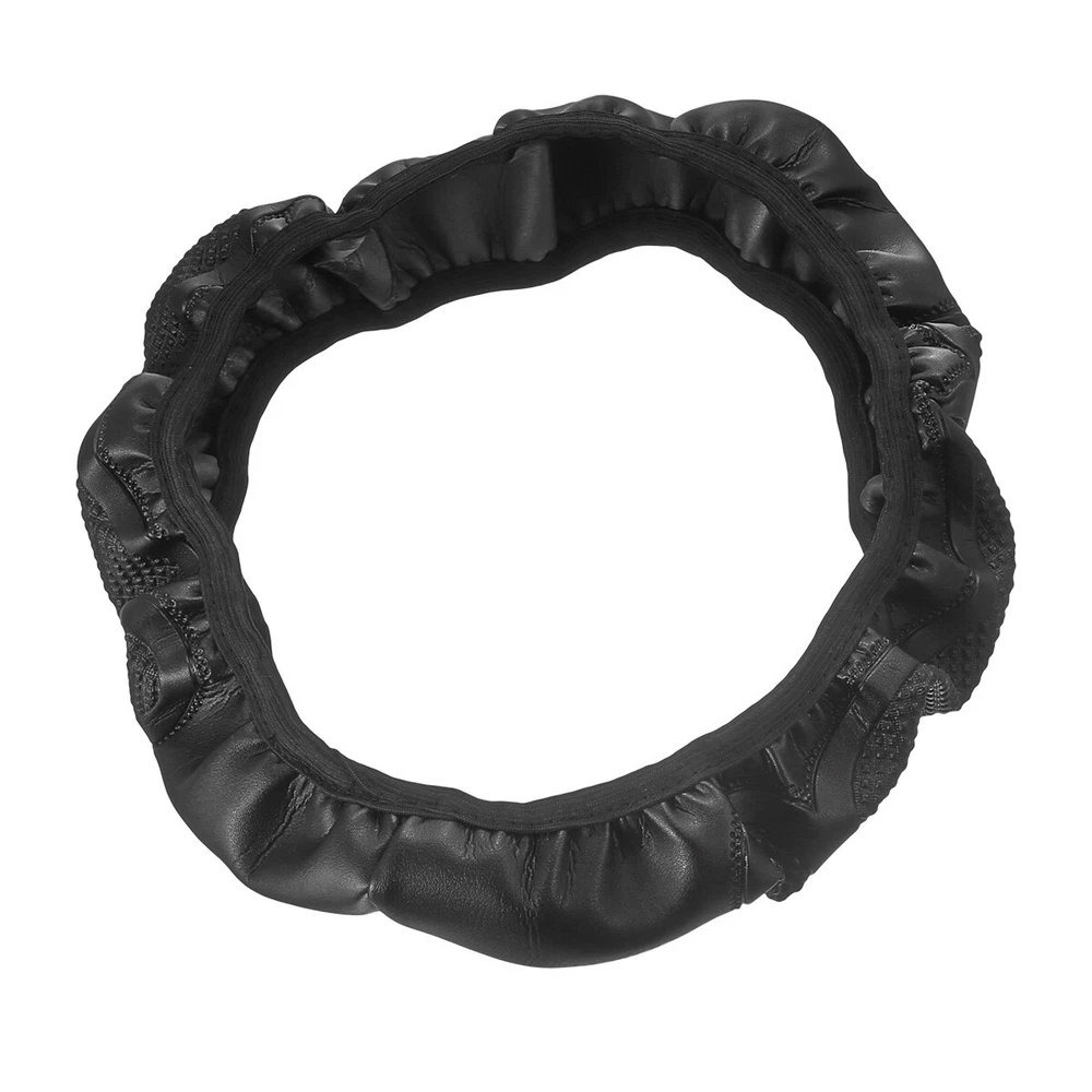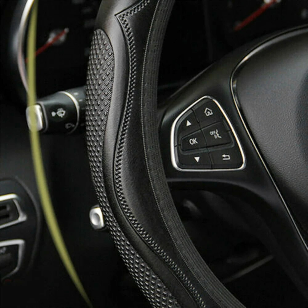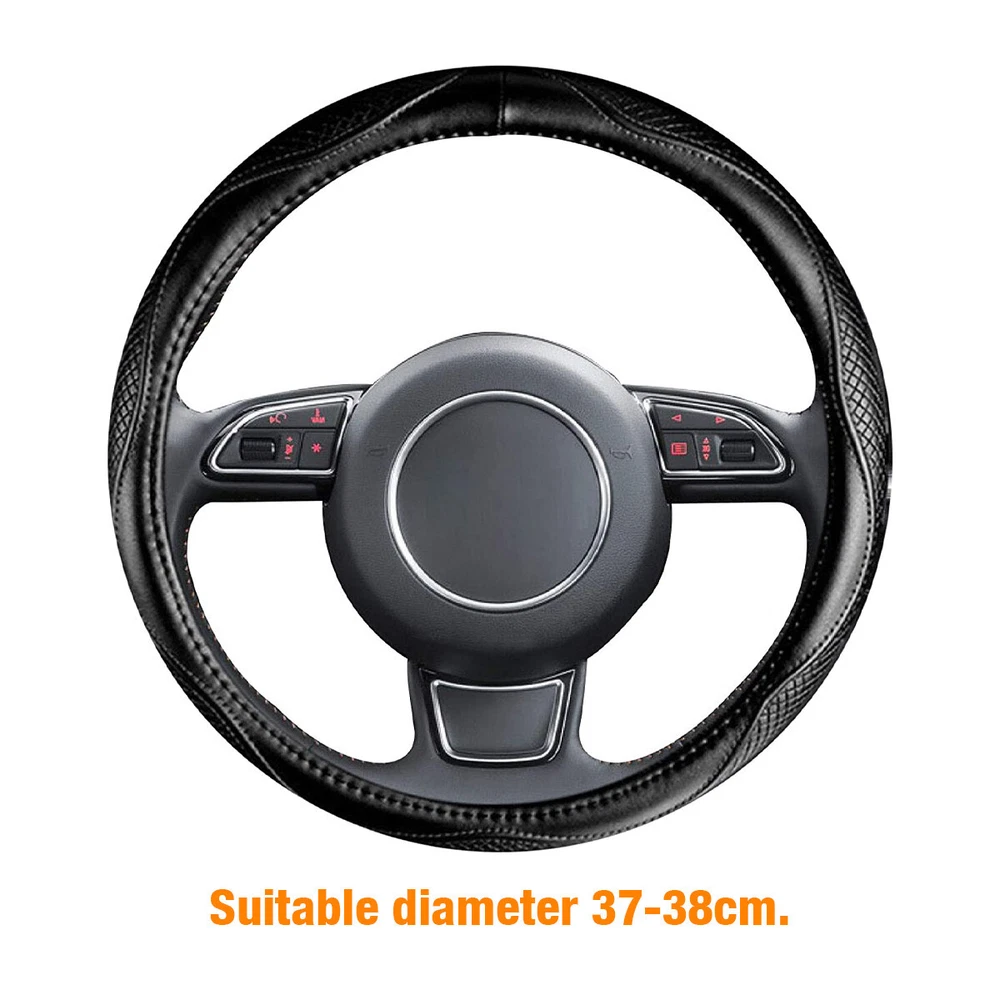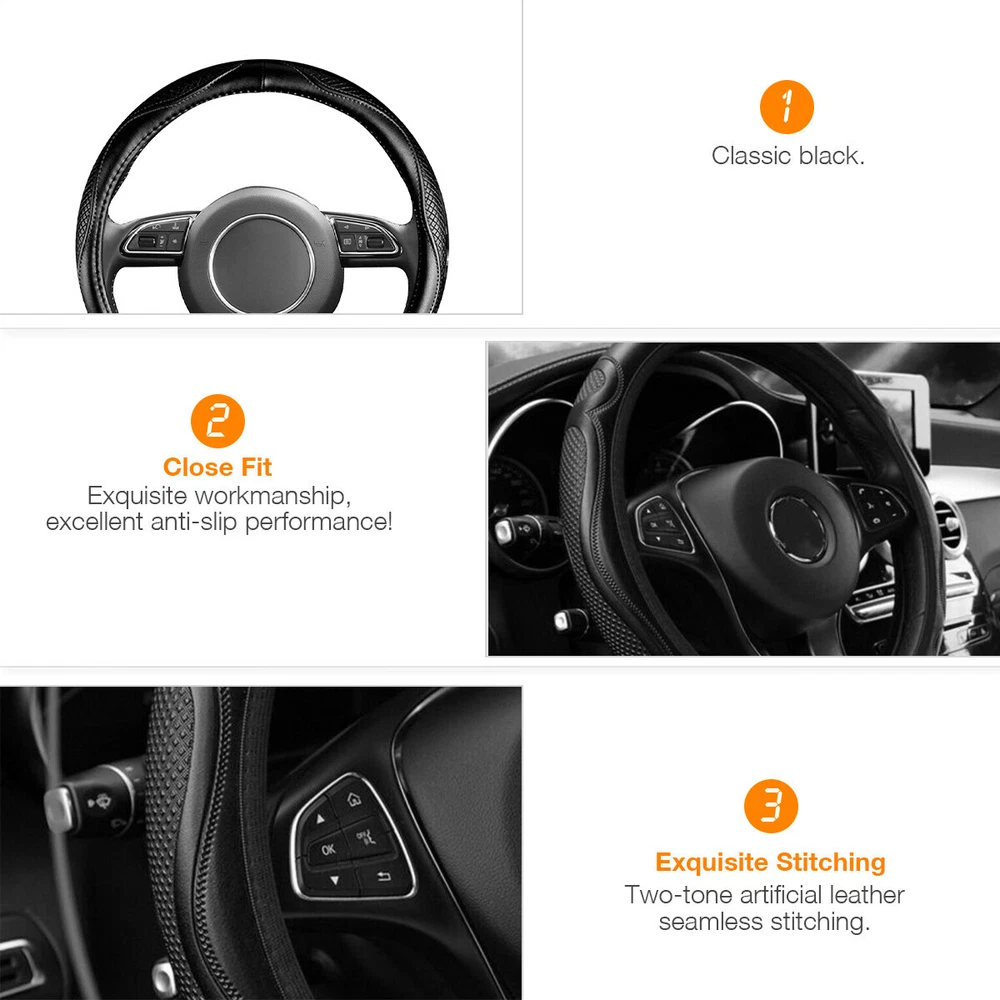 Features: Car Interior Protection & Decoration: The steering wheel cover is designed to protect steering wheel from stain or scratches. Made of PVC black leather with embossed patterns, it fits the car interior decoration styles well, protective and decorative. Soft to Touch & Waterproof: Made of high-quality PVC leather, the steering wheel cover is soft and comfortable to touch, making your hands less tired during long time driving. Also it is waterproof and easy to clean, just wipe the water drops or stains with dry cloth. Besides, it is whole year available, saving troubles of replacement. Stylish & Non-slip & Manage Function: With three-dimensional embossed patterns on it, the steering wheel cover looks stylish and is non-slip, allowing you to better control the steering wheel. Moreover, it can massage your palm, make yours hands feel comfortable. Wide Compatibility: The steering wheel cover is suitable for 98% car models on the market, suitable for 37-38cm/14.6-15in steering wheels. Please measure your car steering wheel before purchase. Easy to Install: Place the upper steering wheel cover on the top of steering wheel, hold down the four parts of the steering wheel and gradually use both hands to tighten it to any side under the steering wheel. If the cover is difficult to fix, ask another person to pull it down to the proper position. The bottom cover should be firm and non-slip after installed. and not sliding. Adjust slightly and the installation is complete. Easy to install. Specifications: Name: Car Steering Wheel Cover Color: Black Material: PVC embossed leather Application: Suitable for 37-38cm/14.6-15in diameter Steering Wheel Notes: Please allow a slight dimension difference due to different manual measurements. Due to the light and screen setting difference, the item's color may be slightly different from the pictures. Package Contents: 1 x Car Steering Wheel Cover
