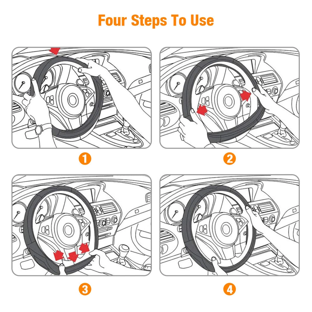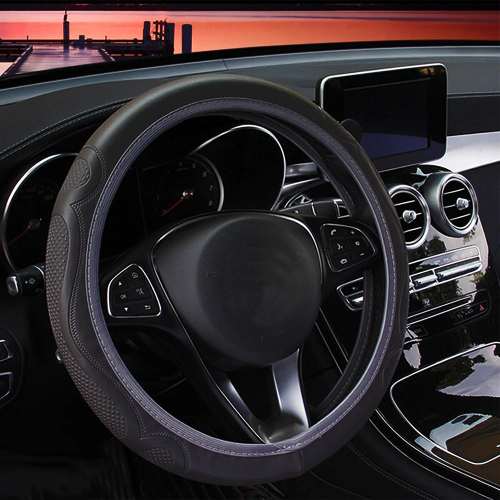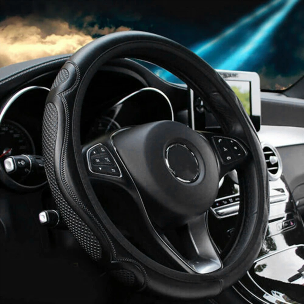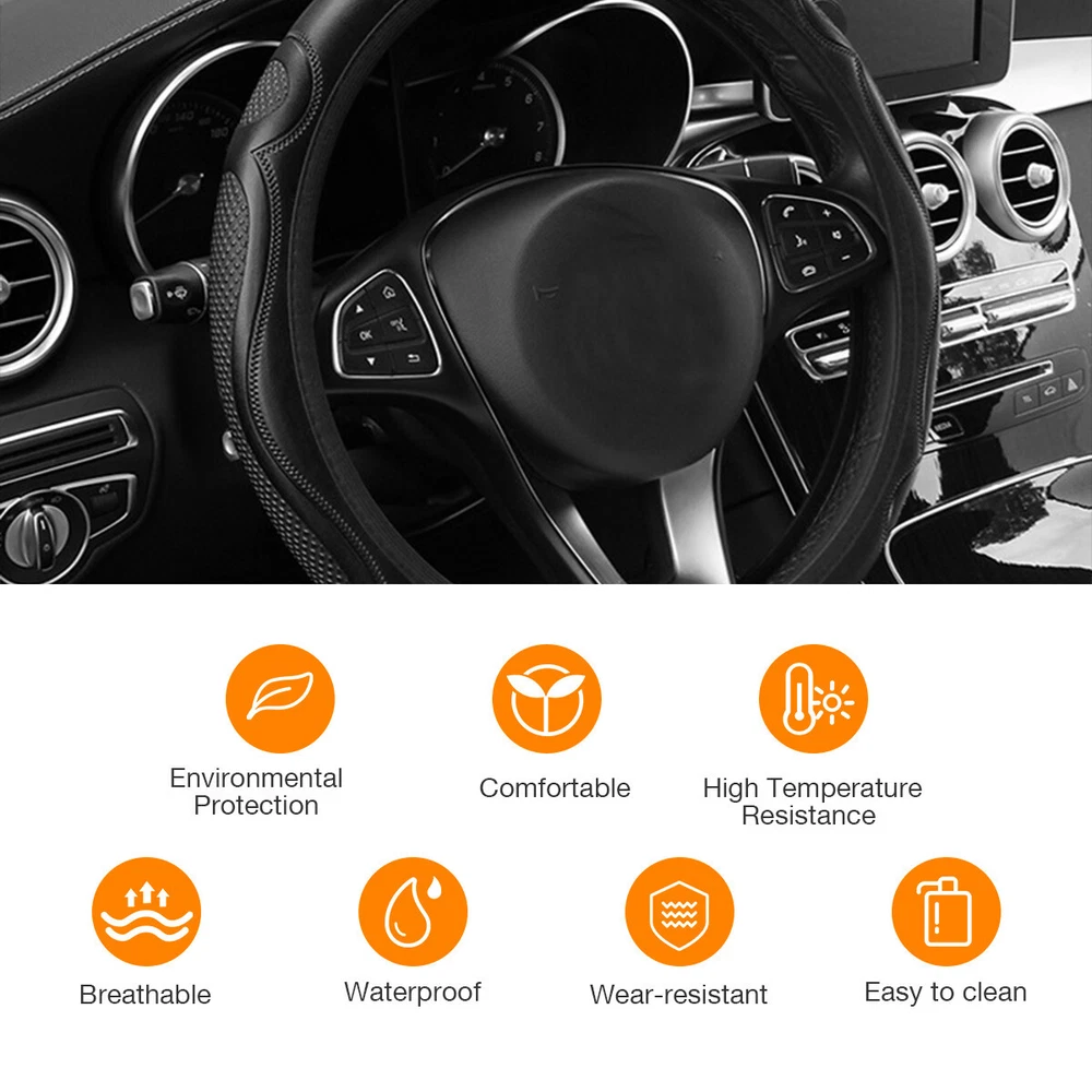 Features: Car Interior Protection & Decoration: The steering wheel cover is designed to protect steering wheel from stain or scratches. Made of PVC black leather with embossed patterns, it fits the car interior decoration styles well, protective and decorative. Soft to Touch & Waterproof: Made of high-quality PVC leather, the steering wheel cover is soft and comfortable to touch, making your hands less tired during long time driving. Also it is waterproof and easy to clean, just wipe the water drops or stains with dry cloth. Besides, it is whole year available, saving troubles of replacement. Stylish & Non-slip & Manage Function: With three-dimensional embossed patterns on it, the steering wheel cover looks stylish and is non-slip, allowing you to better control the steering wheel. Moreover, it can massage your palm, make yours hands feel comfortable. Wide Compatibility: The steering wheel cover is suitable for 98% car models on the market, suitable for 37-38cm/14.6-15in steering wheels. Please measure your car steering wheel before purchase. Easy to Install: Place the upper steering wheel cover on the top of steering wheel, hold down the four parts of the steering wheel and gradually use both hands to tighten it to any side under the steering wheel. If the cover is difficult to fix, ask another person to pull it down to the proper position. The bottom cover should be firm and non-slip after installed. and not sliding. Adjust slightly and the installation is complete. Easy to install. Specifications: Name: Car Steering Wheel Cover Color: Black Material: PVC embossed leather Application: Suitable for 37-38cm/14.6-15in diameter Steering Wheel Notes: Please allow a slight dimension difference due to different manual measurements. Due to the light and screen setting difference, the item's color may be slightly different from the pictures. Package Contents: 1 x Car Steering Wheel Cover