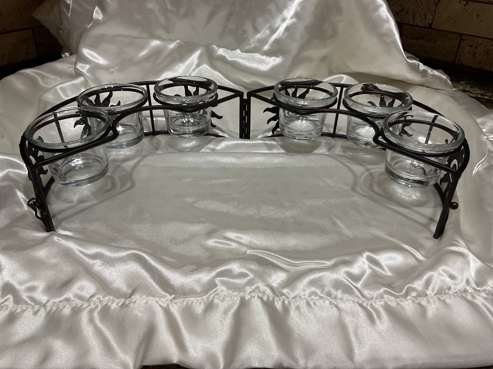 Add a touch of celestial charm to your outdoor patio with this elegant black metal candle holder. Its round design features a unique umbrella shape, adorned with six glass holders perfect for housing votive candles. The farmhouse style complements any patio table, creating a warm and inviting atmosphere for your gatherings. Crafted from durable metal and glass, this unbranded candle holder is a blend of functionality and decoration. The decorative features include a rustic finish that adds to its rustic appeal, making it an ideal choice for those who love to host dinners or late-night barbecues under the stars.