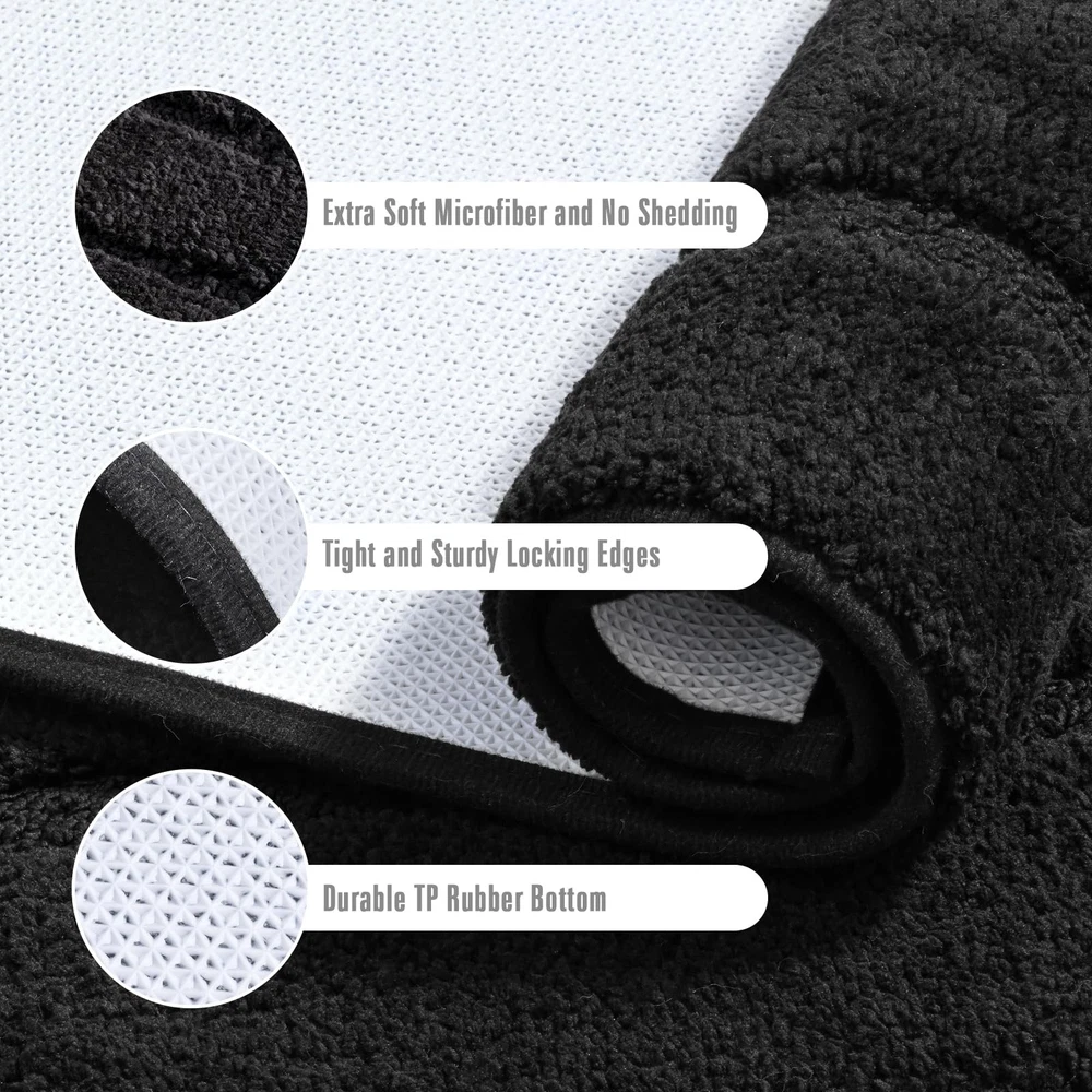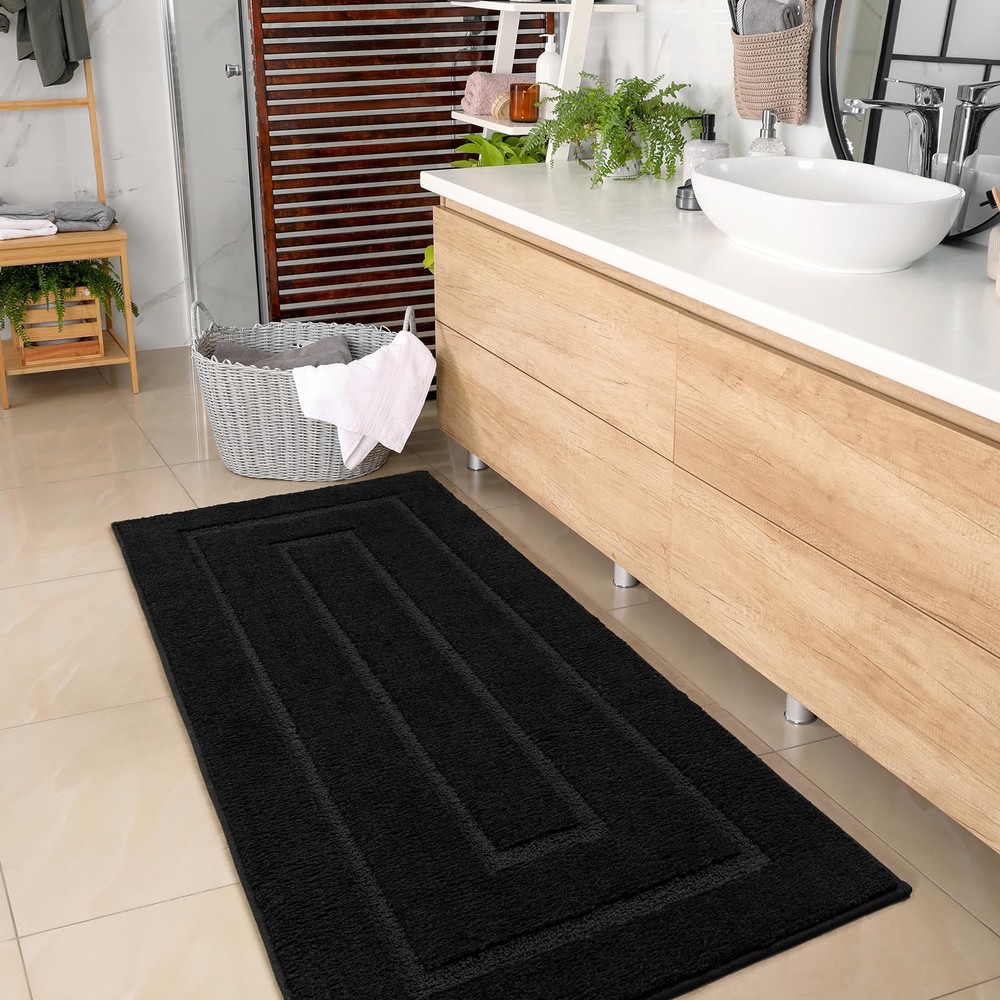 Super Absorbent: The bathroom rug is made of high dense plush microfiber, which can wicking water quickly and dry fast, cushion and warm your feet with soft the bathroom rugs after stepping out of a steamy shower Machine Washable:The unique stitching and dyeing techniques allows the bathroom rugs to be washed many times on low power with cold water and mild detergent without fade and sheding, hang and air dry Utra Soft and Versatile: The black bath rug with high density microfiber provide a comfortable to your feet, 24x60 inch long runner suitable for bathroom kitchen bedroom laundry room use Non Slip Backing: Made of sturdy and expensive TP rubber, which is much more strong grip on the floor, keep the bath area rug in place, and durable for long lasting use Luxury and Practical Gift : The bathroom rug runner has a unique solid color design that provides a beautiful accent to almost any space in your bathroom, sink, shower, tub or anywhere you want to provide support and warmth for your feet, as a frequently used everyday item, it can be given as a gift on any holiday or anniversary
