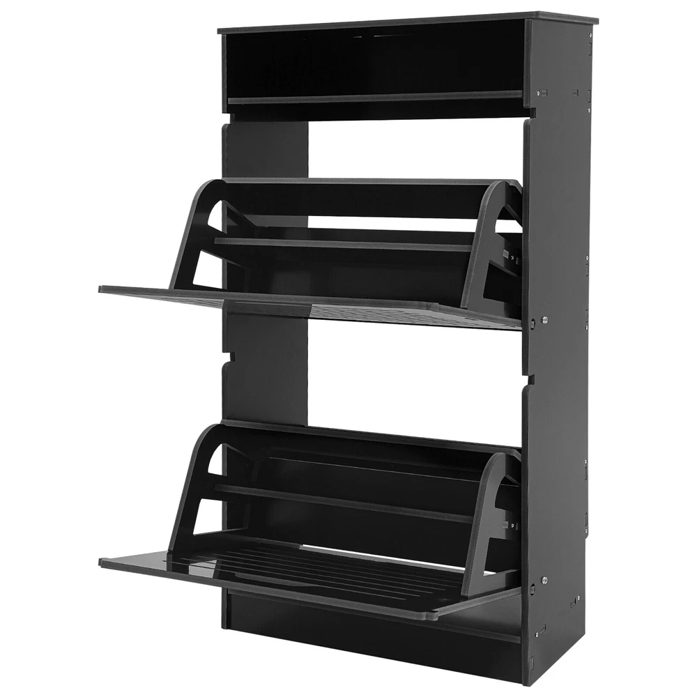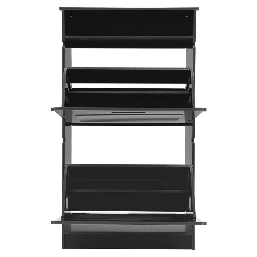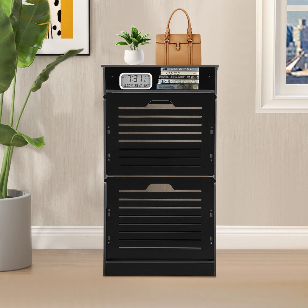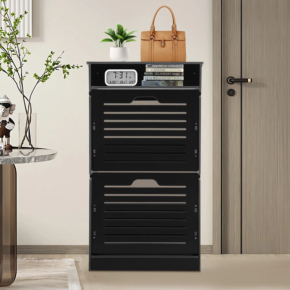 This shoe storage cabinet is a game-changer for small spaces! The sleek black design fits perfectly in my entryway without looking bulky. It holds 8 pairs securely, and the flip-down doors make grabbing shoes super easy. Assembly was straightforward, and the PVC material feels sturdy—no wobbling even when fully loaded. Love that it hides clutter while keeping everything within reach. Perfect for sneakers, flats, or small boots. Highly recommend for anyone needing smart, stylish storage!