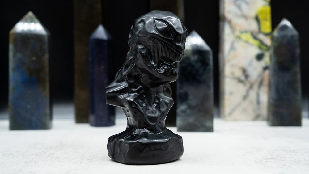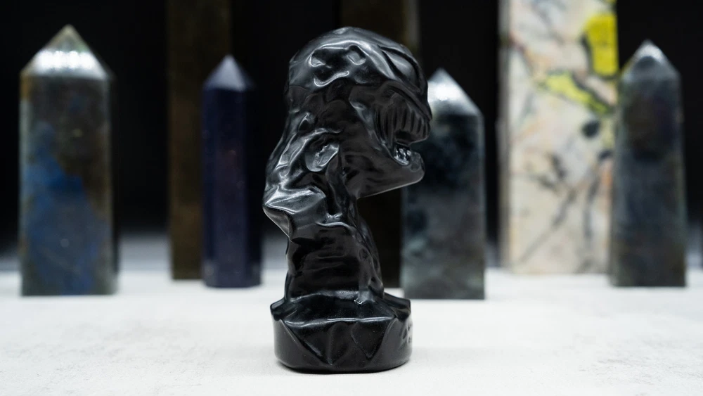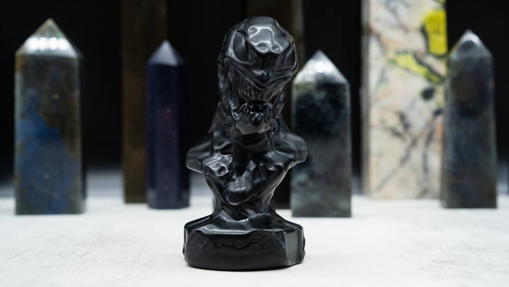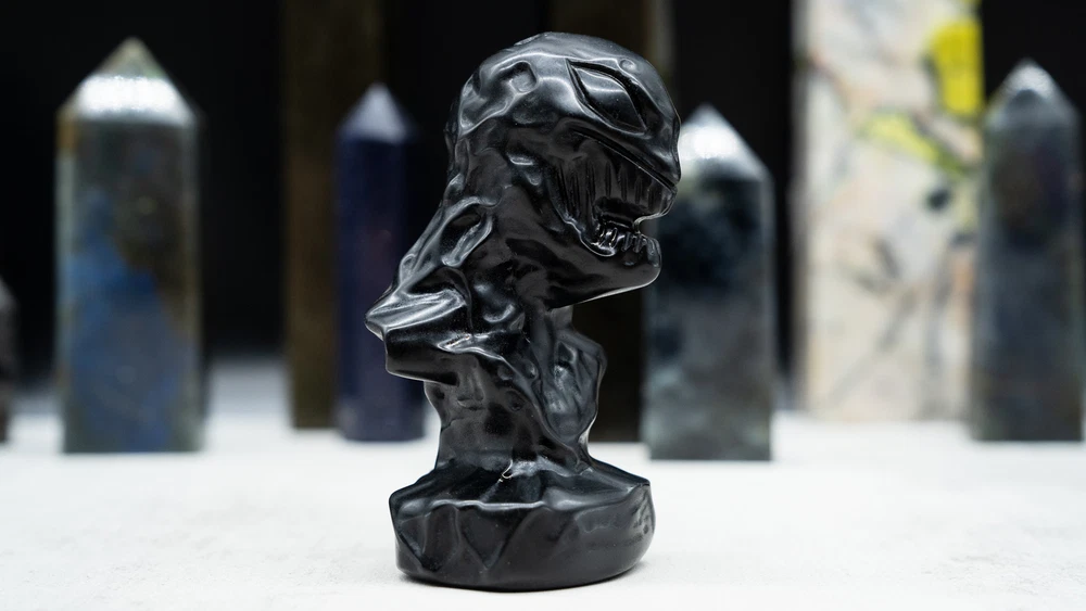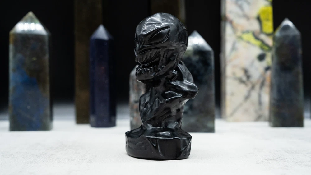 These cute black obsidian Venom character-inspired fanart carvings are the perfect gift to celebrate the comic book or Marvel lover in your life - Perfect addition to any collection! You will receive (1) intuitively chosen carving that measures approximately 3.5" tall. Gems and crystals are great for altars, grids, terrariums, pocket stones, gifts, home decorating, jewelry, collecting and more! They are also wonderful additions to meditation, spiritual, and chakra work. Obsidian, or volcanic glass is a natural crystal which is believed to offer protection and encourage healing within the body. Often used as a self-care item or spiritual aid in avoidance of negative energies. *This listing uses professional photography to provide samples of our collection of products. Each stone is natural, unique and beautiful so please expect slight variations in color, texture, and size. You will receive a product similar to that of the picture, but not the exact product. **Please note that healing crystals are not a replacement for traditional medical treatment and are not meant to replace consulting with a medical professional and do not guarantee any medical cure for any condition. ***This is not a licensed Disney, Sony, or Marvel product and only features the likeness of the character Venom on a fan art basis.