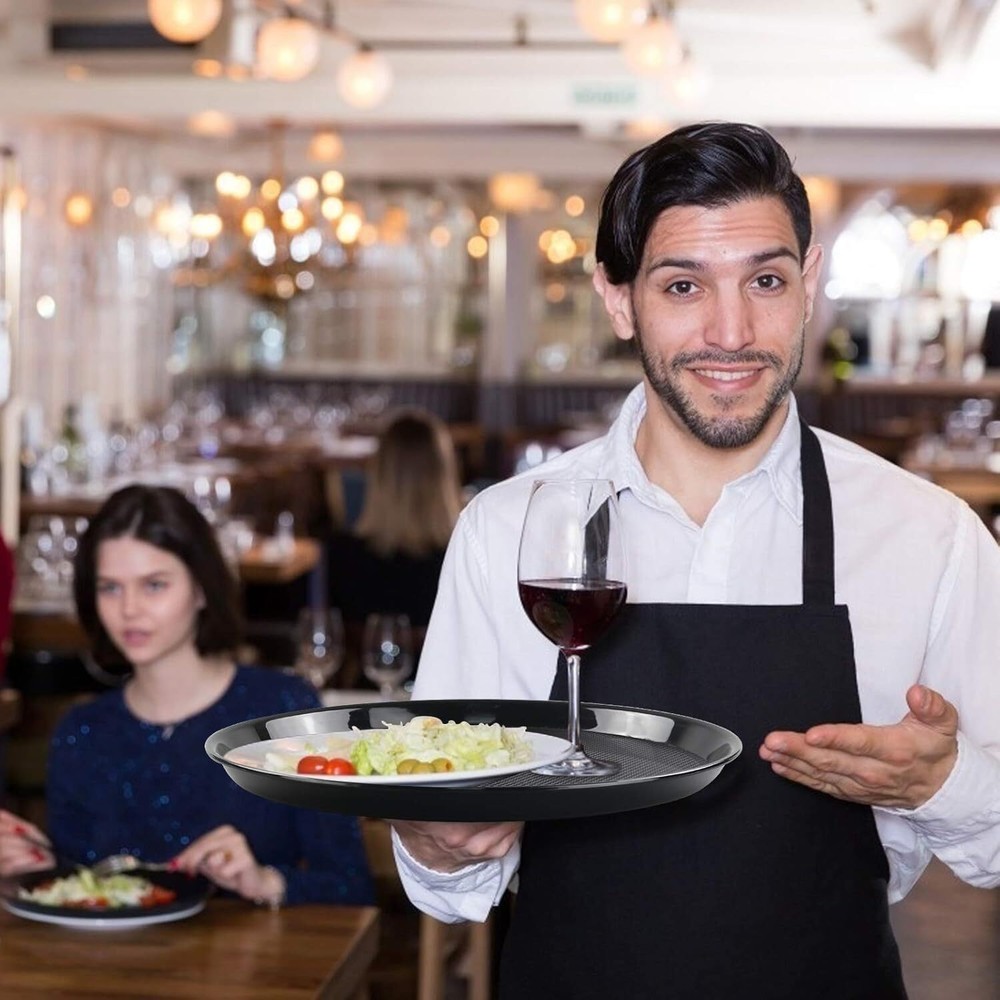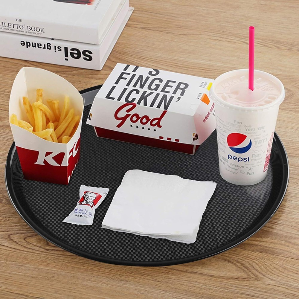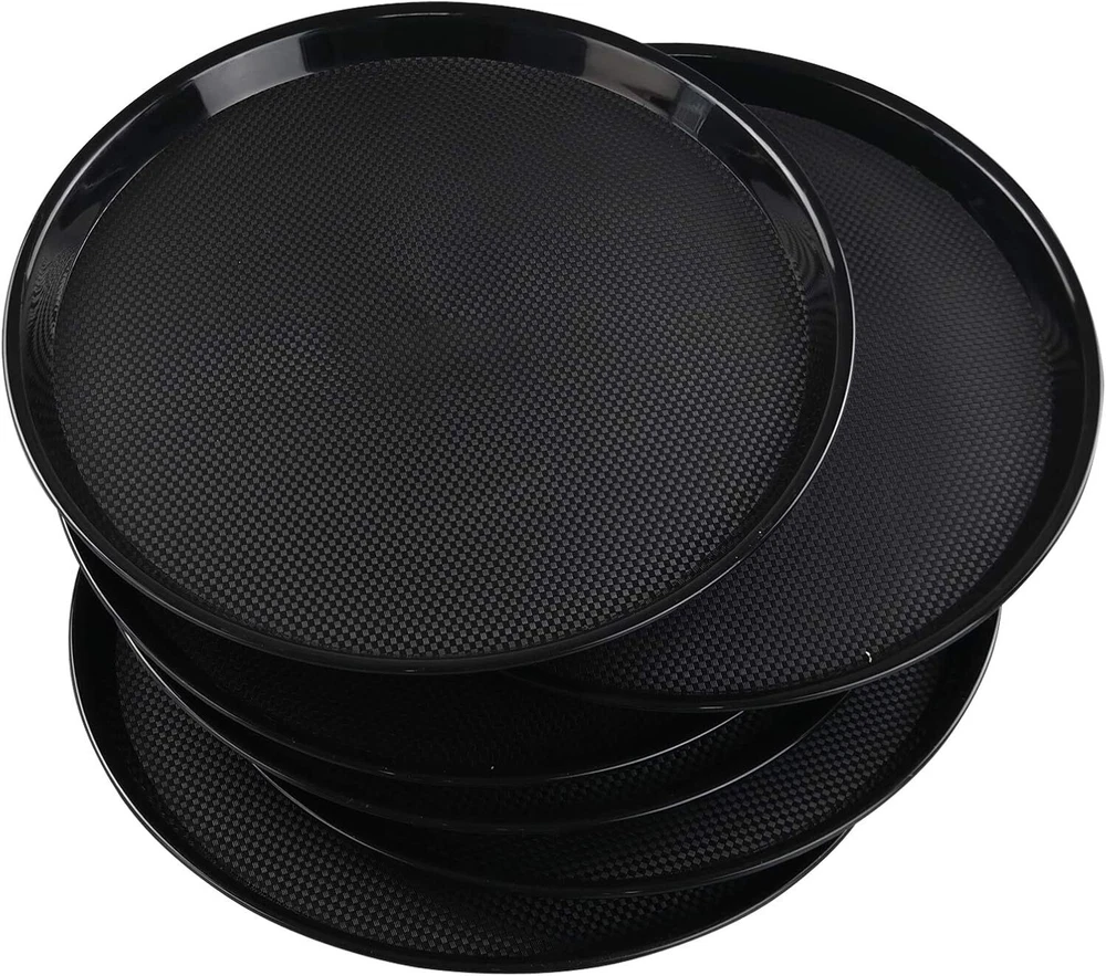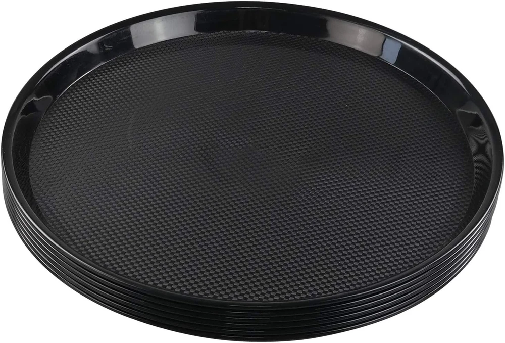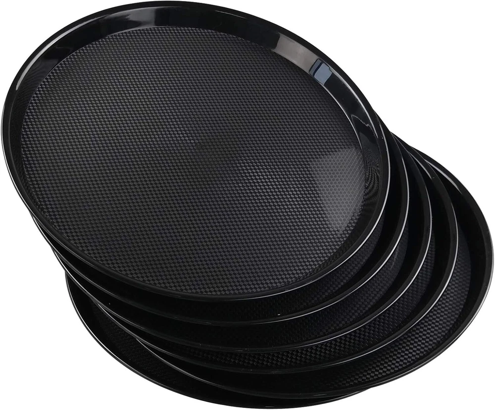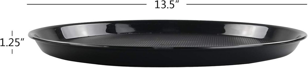 Features : Include 6 round serving trays 13.5-inch diameter, 1.25-inch high Made of durable plastic. Perfect for restaurant, cafeteria and canteen.