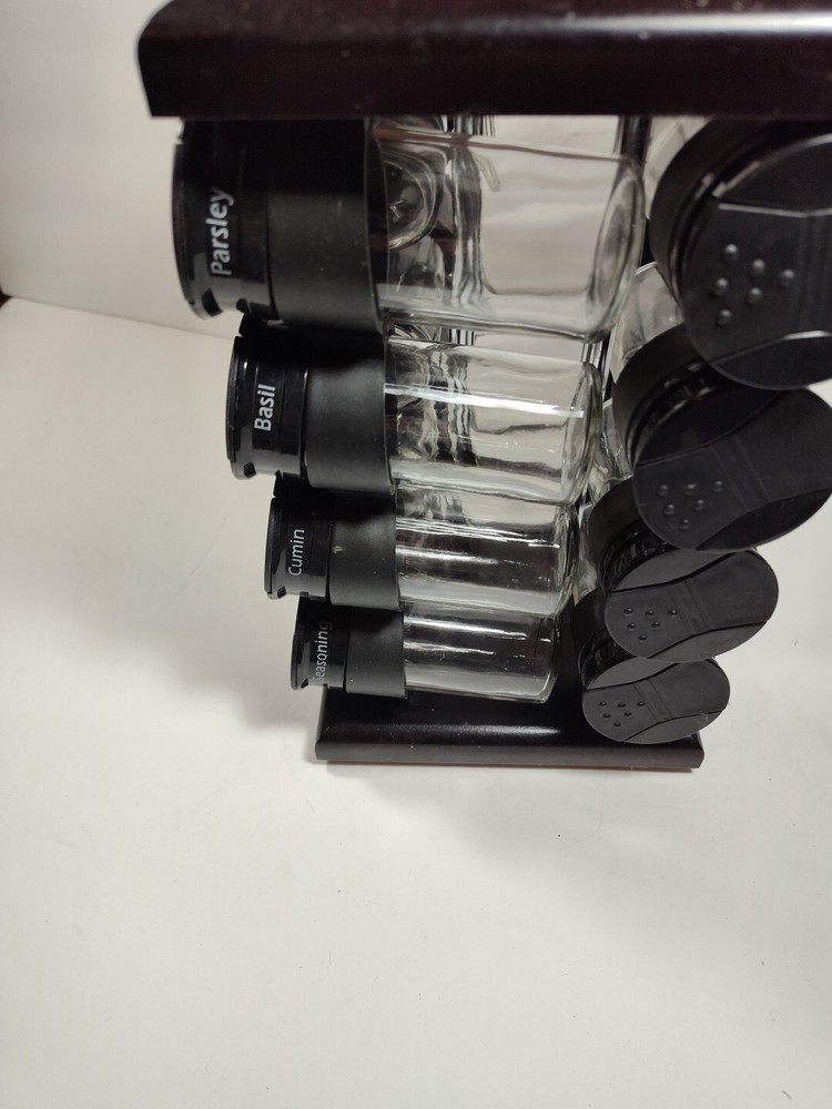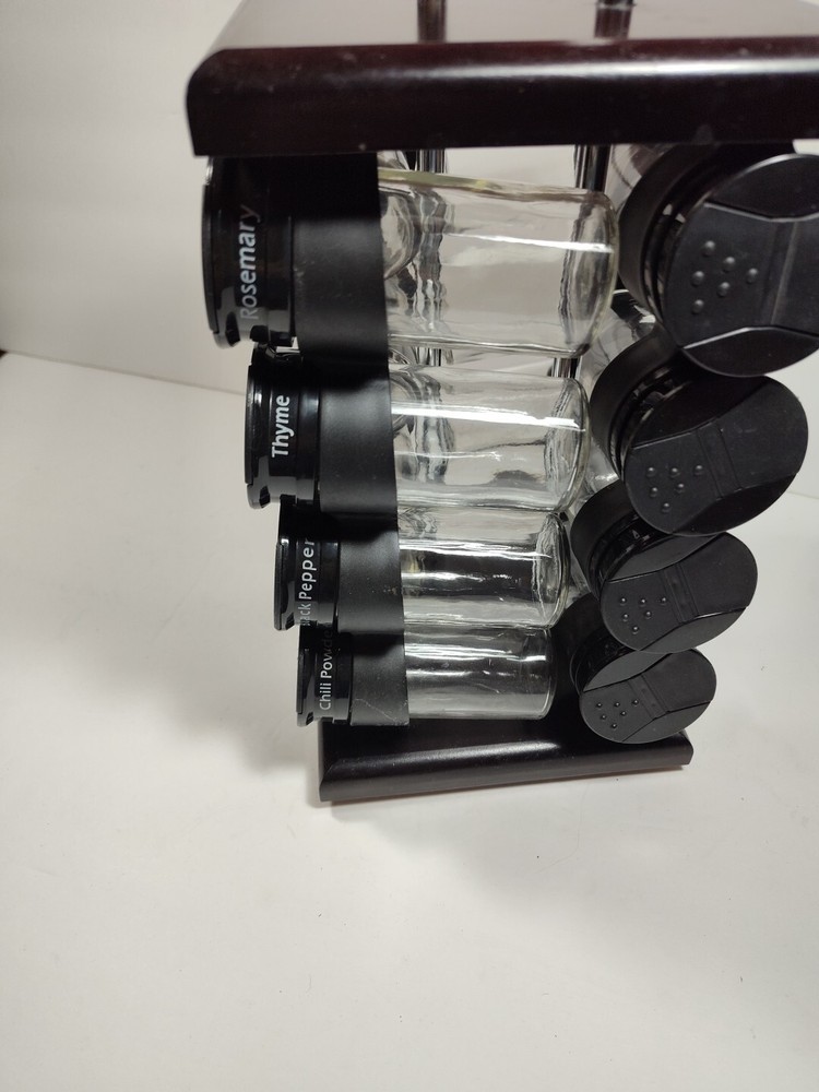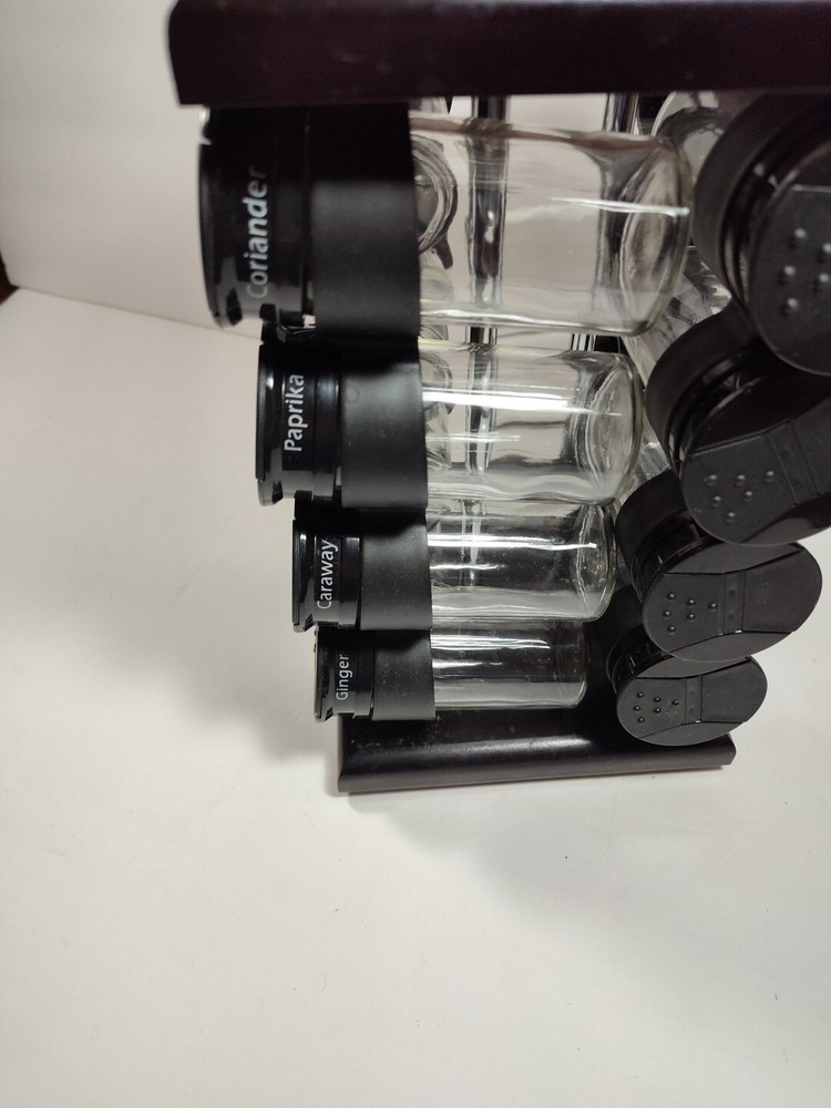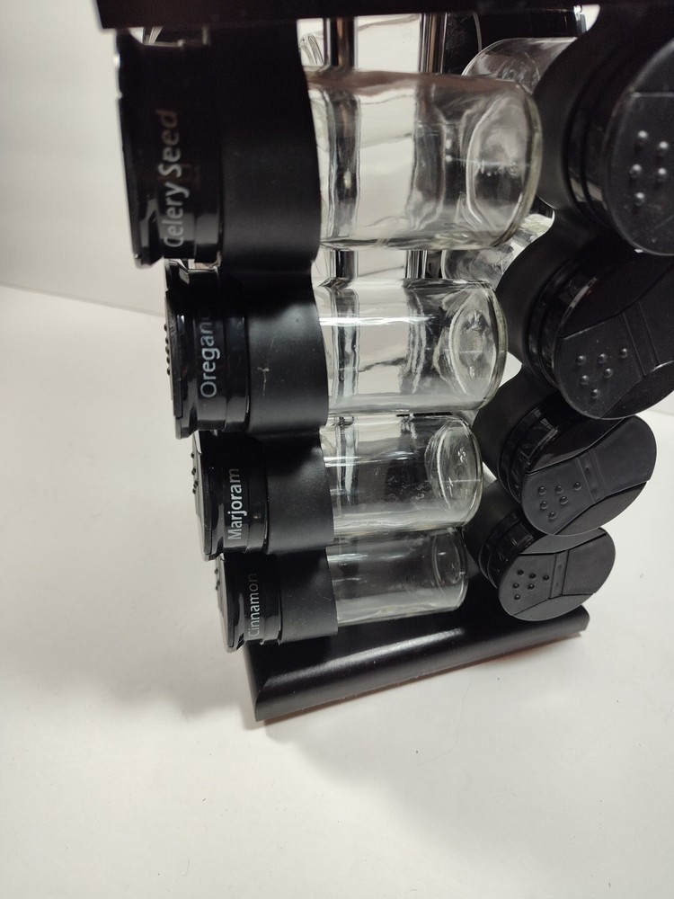 Spice up your kitchen with this rotating spice rack organizer! With 16 compartments and a carousel/revolving rack type, you can store all your favorite seasonings in one convenient place. The set comes with 16 spice jars and a stable performance and high quality feature make it a must-have for any modern kitchen. The black color and rectangular shape of the rack make it a sleek addition to any tabletop or free-standing mounting type. The rotating base and jar labels add to the functionality and organization of the set. Made with stainless steel, glass, and plastic materials, this spice jar and rack set is perfect for any home. This rotating rack has never been used. The jars still have the protective inner liner and there is no odor or stains in any of the jars.