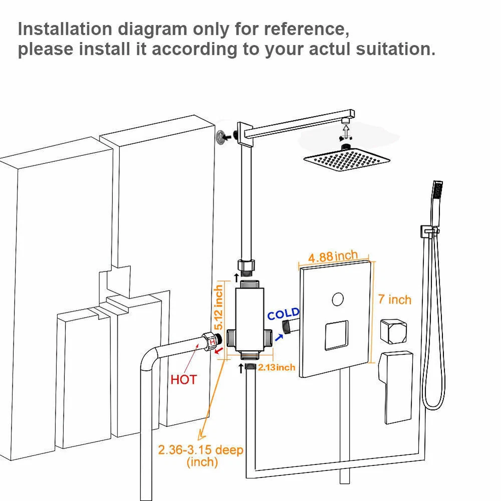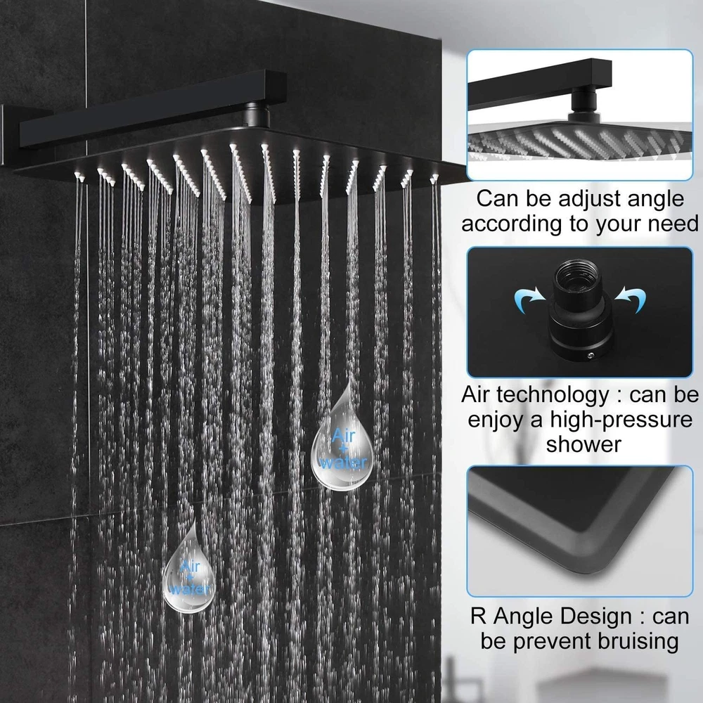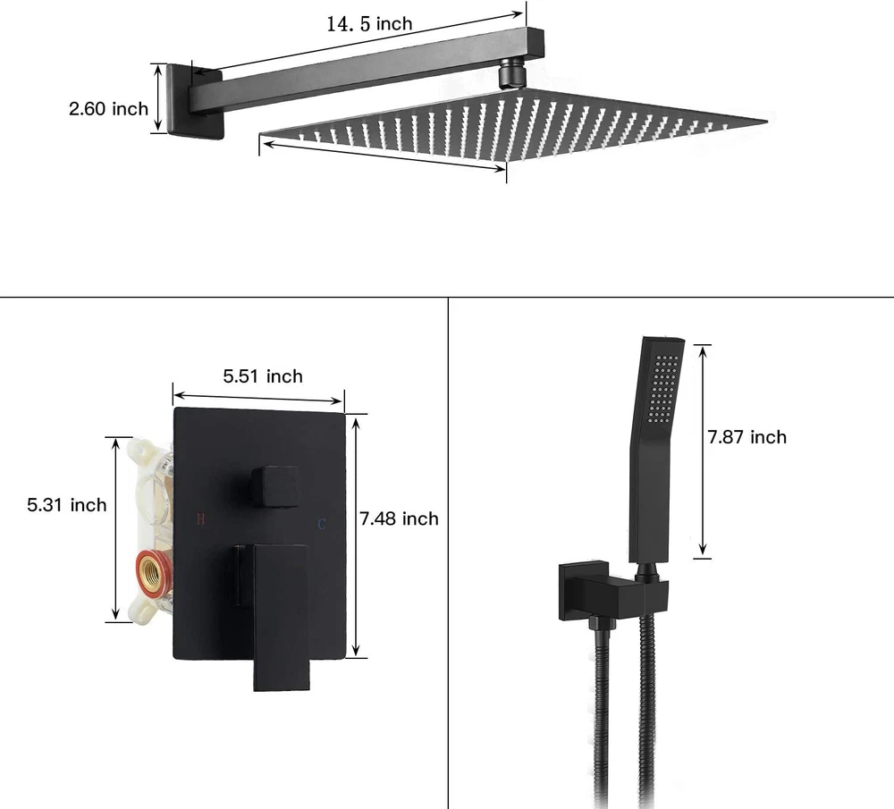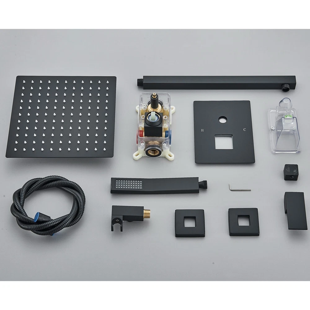 Black Shower Faucet Set 8"Rainfall Shower Head Combo System with Mixer Valve Kit The shower system include: 8 inch Square rain shower head(304 stainless steel), handheld shower head(Brass), 14.5 inches Wall mount shower arm(Brass), 1.5M shower hose(304 stainless steel),shower holder(Brass), shower mixer valve(Brass) This shower set made of high quality metal.The matte black and brass combination are non-corrosive and give an elegant look to any bathroom . 8 inches square rain shower head and handheld shower head increases the water pressure by 100%,offer consistent powerful shower even under low water pressurewe guarantee that this will bring you an unexpected high water pressure Matte Black finish offers a sleek look shower kit, ensuring corrosion resistance and durable Our shower faucet set provides 5 years warranty. Our friendly support team are on hand to take care of you, and if for whatever reason you’re not completely satisfied with your purchase, we will provide you with a full refund. Product Description Function: Shower Faucet Set Feature:Wall Mounted Style: Modern Finish: Matte Black Rain Shower Head Size:20cm*20cm (8 inch) Shower Arm Length:14.5 inch Mixer Valve Material: Brass Rain Shower Head Material:Stainless Steel Hand Shower Material: Brass Hand Shower Bracket: Brass Hand Shower flexible hose: Stainless Steel Includes: 8 inch 304 Stainless Steel Rain Shower Head and 14.5 Inch Solid Brass Shower Arm 2-ways mixer valve Brass Handheld Shower Head with 59 Inch (1.5m) 304 Stainless Steel Shower Hose Shipping Usually shipment can be arranged within 1 working days after receiving payment. Mail transit time is best estimated, but not guaranteed. As transit time varies. Buyer is responsible for return shipment. International Buyers – Please Note: Import duties, taxes, and charges are not included in the item price or shipping cost. Working time Sunday to Friday,17:00-Next Day 2:30 PST Monday to Friday,1:30-10:30 GMT Monday to Friday,11:30-20:30 AEST Contact us I describe items as well as I can. If I have missed something or wrote something wrong, please let me know. Please contact us if you have any problems and suggestions. Usually, you will get reply in 24 hours. In case any broken problem happens, contact us without hesitation, we will solve the problem until satisfaction. Customers can return and get refunded for any reason. We provides 5 years after sale service for all our faucet. ????? We hope our products and our service can give you a wonderful experience ?????