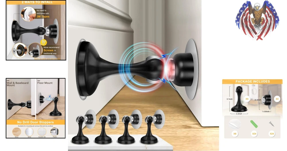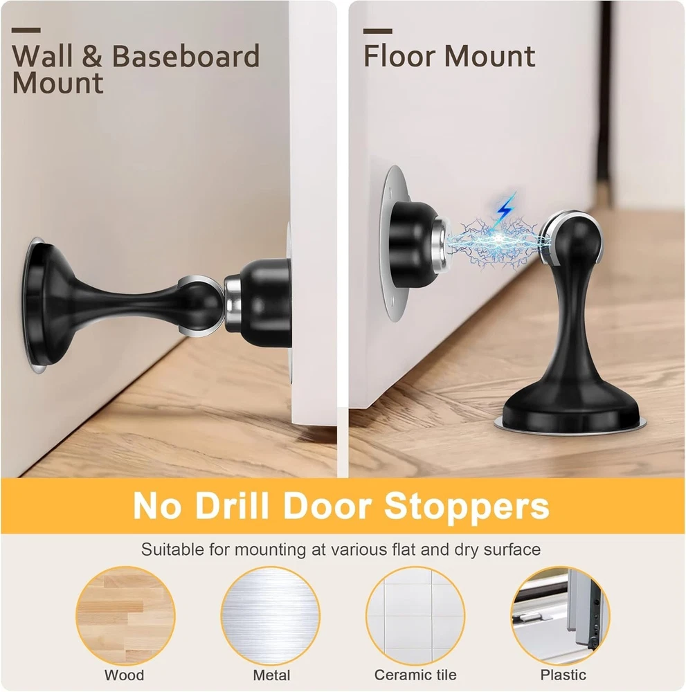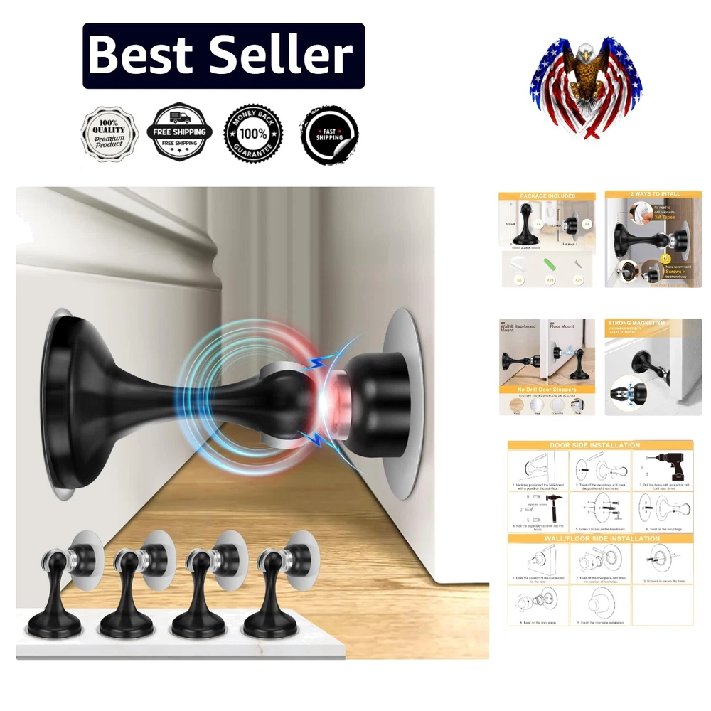 Black Stainless Steel Magnetic Door Stopper Set with Adhesive Tapes - 4 Pack ‹ › ‹ › ‹ › ‹ › ‹ › ‹ › ‹ › ‹ › ‹ › ‹ › Black Stainless Steel Magnetic Door Stopper Set - 4 Pack Transform the way you manage doors with our elegant and functional Magnetic Door Stopper Set. Crafted from high-quality black stainless steel, this door stopper set not only ensures your doors remain securely open, but also adds a touch of sophistication to your space. Features: Strong Magnetism: Features an ultra-strong magnet that securely holds doors open, even in howling winds. Perfect for heavy doors. Wall and Door Protector: Prevents doors from slamming shut to protect your walls and doorknobs from damage. Drilling & Non-drilling Installation: Includes adhesive tapes for easy installation without drilling, as well as screws for a more permanent solution. Versatile Compatibility: Ideal for various smooth surfaces such as wood, glass, metal, and marble walls. Premium Material: Made of stainless steel with an anti-oxidation layer to prevent rust and ensure durability. 2-Year Warranty: We stand by our product with a generous two-year after-sale service for your peace of mind. Benefits: Securely holds doors open, allowing for airflow and hands-free convenience. Protects your walls and doorknobs, reducing repair costs and enhancing longevity. Flexible installation methods cater to your preferences and convenience. Stylish, modern design complements any interior décor. Durable construction ensures long-lasting use with minimal maintenance. Why choose our Magnetic Door Stopper Set? Elevate your home or office with our Black Stainless Steel Magnetic Door Stopper Set. Designed to provide exceptional strength and stability while preventing damage to both your doors and walls, this set is perfect for anyone looking to enhance their living or working space with functional ease. With simple installation options and a robust design, you can trust this door stopper to facilitate a graceful balance of aesthetics and utility. Embrace the harmony between style and functionality – order your Magnetic Door Stopper Set today! Shipping Free & Fast Shipping - We offer free shipping to most of the USA with a normal delivery time of 3-7 days. However, due to the current situation, additional delivery time (up to 3 weeks) may be required for some items. Alternative Carriers - We may use alternative carriers (e.g. USPS, FedEx, UPS, etc.) to ensure your package arrives safely and on time. Due to the use of multiple carriers, we are unable to provide a tracking number automatically. Handling Time - Orders are processed and shipped within 1-2 business days of receiving cleared payment. Shipping Restrictions - Shipping to Alaska, Hawaii, Puerto Rico, Guam, and other US territories may incur shipping charges or delivery restrictions. Please contact us before ordering, or your order can be refunded/cancelled. State Restrictions - There may be restrictions based on your state of purchase. For example, certain items may not be shipped to California due to state regulations. Contact for Tracking Updates - If you require tracking updates or have any concerns about the delivery of your order, please feel free to contact us, and we will be happy to assist you. Return 30-Day Hassle-Free Returns - We want you to be completely satisfied with your purchase. If you are not, you can return the item within 30 days of receiving it for a full refund or exchange. Easy Return Process - To start a return, simply contact us and we will provide you with a prepaid return shipping label and detailed instructions. Restocking Fee - There are no restocking fees for returns. However, the buyer is responsible for return shipping costs if the return is not due to a seller's error. Refund Processing Time - Refunds will be processed within 5 business days of receiving the returned item in its original condition. Payment We accept all major credit cards, PayPal, and Apple Pay for your convenience. Your payment information is secure and encrypted to ensure a safe and seamless transaction. Please complete your payment within 3 days of purchase to avoid any delays in shipping. Feedback Your feedback is extremely important to us. We strive to provide the best products and customer service possible. If you are satisfied with your purchase, please take a moment to leave us a positive review. If you have any concerns or issues with your order, please contact us before leaving negative feedback. We are committed to resolving any problems and ensuring your satisfaction. Contact Us If you have any questions or concerns, please feel free to reach out to our customer support team. You can contact us through the eBay messaging system. We are available Monday to Friday, 9:00 am to 5:00 pm EST, and we will do our best to respond to your inquiry within 24 hours. Buy it now and enjoy a pleasant shopping experience! UPC: Not Set Material: Metal,Stainless Steel,Wood Features: Magnetic,Door Holder,Door Stopper,Wall and Door Protector,Keeps Doors Open,Prevents Slamming,Air Flow Maintenance Installation: Screw-In,Adhesive Compatible Brand: Magnetic Door Stoppers Compatible Model: Various Doors and Walls Brand: Unbranded Color: Black Type: Door Stopper Finish: Brushed Item Width: Not Set Item Diameter: 0.5 in Item Length: Not Set MPN: Not Set Item Depth: 2 in Design: Modern Style: Modern Number in Pack: 4 Country/Region of Manufacture: Not Set Model: Not Set Item Weight: 1.48 lb Manufacturer Warranty: Not Set