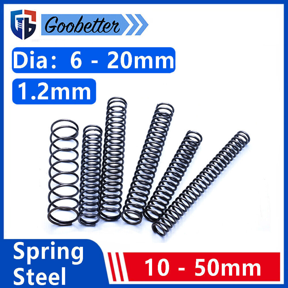Product description Specifications: 【Features】- Springs occupy an important position in various markets. Stainless steel spiral compression spring, waterproof, rust-proof, durable. 【Application】- Widely used in shipbuilding, computer, electronics, automobile, chemical industry, aerospace, railway, wind power, thermal power, construction machinery, mining machinery, construction machinery, elevators and other fields. Wire diameter:1.2mm Diameter:6mm - 20mm Length:10 - 50mm Material:Spring Steel Colour: Black Surface Treatment: Blackened
