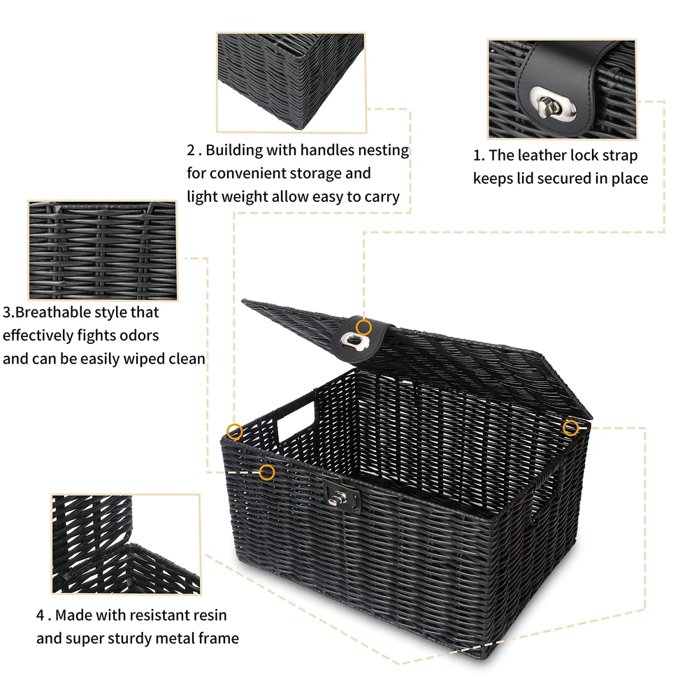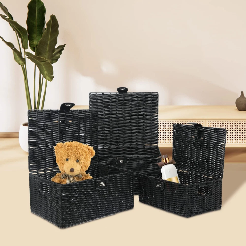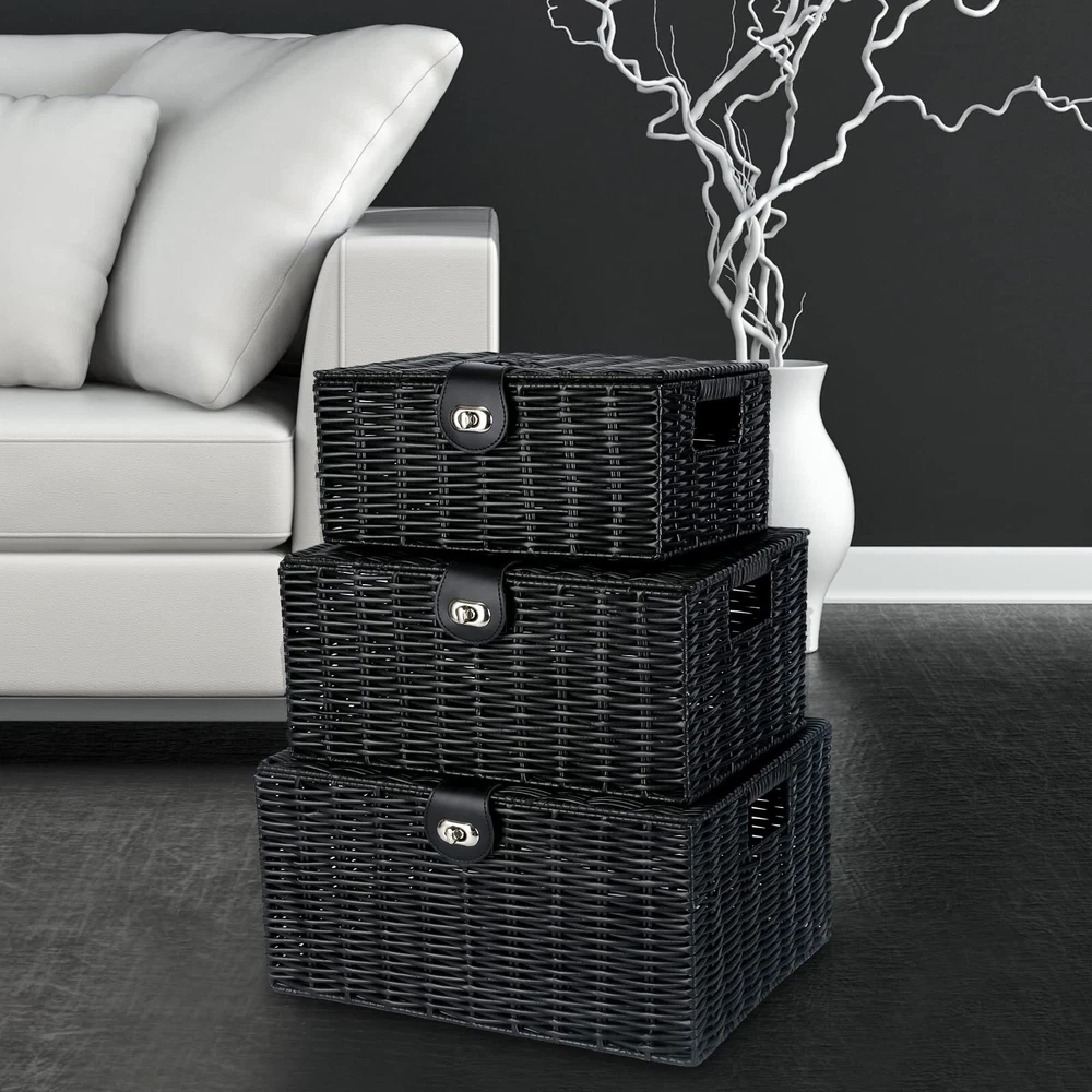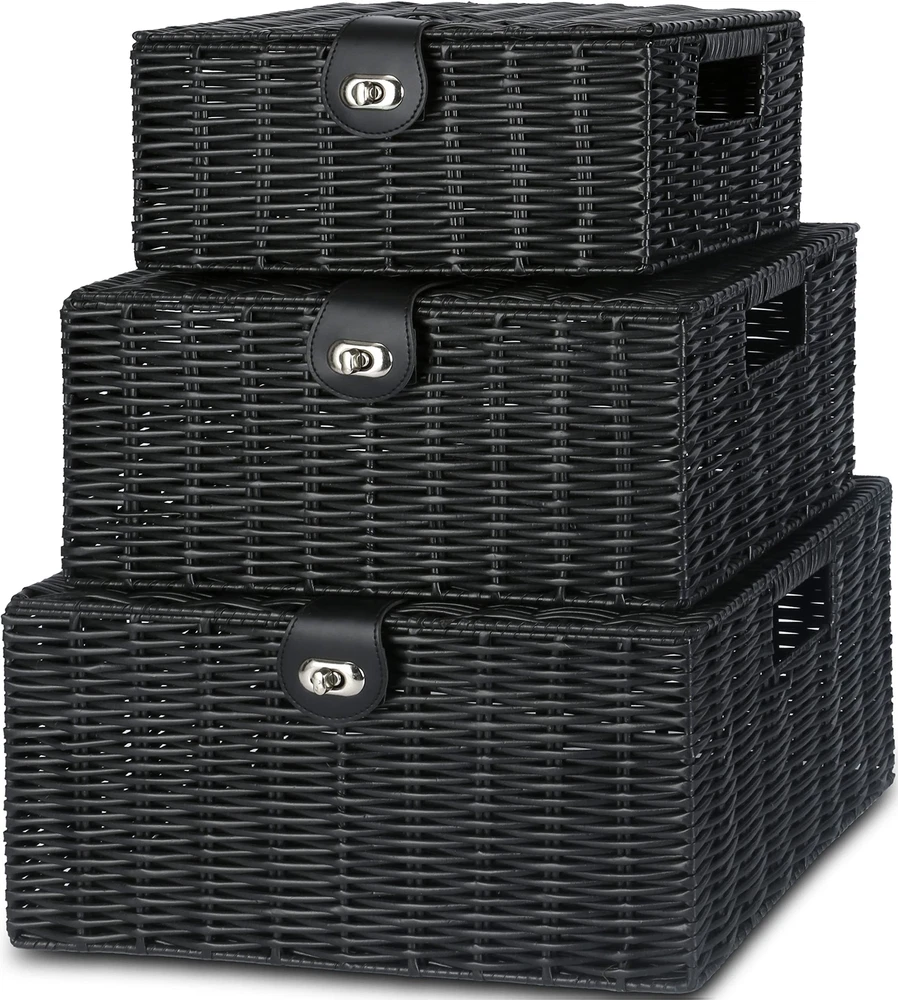 ๐๐น๐ฎ๐๐๐ถ๐ฐ & ๐๐๐๐ฟ๐ฎ๐ฐ๐๐ถ๐๐ฒ ๐ฉ๐ฒ๐ฟ๐๐ฎ๐๐ถ๐น๐ฒ ๐๐ฎ๐บ๐ฝ๐ฒ๐ฟ๐ - Large Wicker Basket with Lid adds a modern contemporary style look to Home Household Dรฉcor. Ideal for bathroom, bedroom, kitchen, living room and other places to use. It is not only an amazing decoration, but also a versatile storage boxes with locks ๐๐ฎ๐๐ต๐ถ๐ผ๐ป๐ฎ๐ฏ๐น๐ฒ ๐ฆ๐๐๐น๐ถ๐๐ต ๐๐ฟ๐ ๐๐ฒ๐ฐ๐ผ๐ฟ - The fashionable, chic woven style of the rectangular woven baskets mean that organizing your stuffs doesnโt have to be an ugly feat, with a leather-look strap and metal lock for that sleek, premium quality storage bins ๐ฆ๐๐ฝ๐ฒ๐ฟ ๐ฆ๐๐๐ฟ๐ฑ๐ & ๐๐๐ฟ๐ฎ๐ฏ๐น๐ฒ ๐ช๐ผ๐๐ฒ๐ป ๐ช๐ถ๐ฐ๐ธ๐ฒ๐ฟ - Made of metal frame which is sturdy, durable and long lasting, the lids basket are attractive and well made, can go with any decor. They are not also as much a practical tool but also as a piece of art. The basket surface made of wicker but it is smooth and can be easy clean. With Nesting handles make for easy storage on the move ๐๐น๐น-๐ข๐ฐ๐ฐ๐ฎ๐๐ถ๐ผ๐ป ๐ ๐๐น๐๐ถ-๐ฃ๐๐ฟ๐ฝ๐ผ๐๐ฒ ๐ฆ๐๐ผ๐ฟ๐ฎ๐ด๐ฒ - Available in a versatile grey woven basket, they are suitable for use in a variety of room in your home, securely storing anything from kidโs toys to food, books to bathroom toiletries, bedroom to kitchen, living room to entry way. With three different large/medium/small sizes, you can use in stylish stacked form or as storage in different room around the house ๐ฆ๐ฒ๐ ๐ผ๐ณ ๐ฏ ๐๐ฎ๐๐ธ๐ฒ๐ ๐ฆ๐ถ๐๐ฒ - When three different size rectangle baskets not in use, they can stack inside of each other. Large Basket: 14.2"W x 11"D x 7.3"H (36cm x 28cm x 18.5cm) ; Medium Basket: 13"W x 9.5"D x 6.1"H (33cm x 24cm x 15.5cm) ; Small Basket: 11"W x 7.9"D x 4.9"H (28cm x 20cm x 12.5cm)