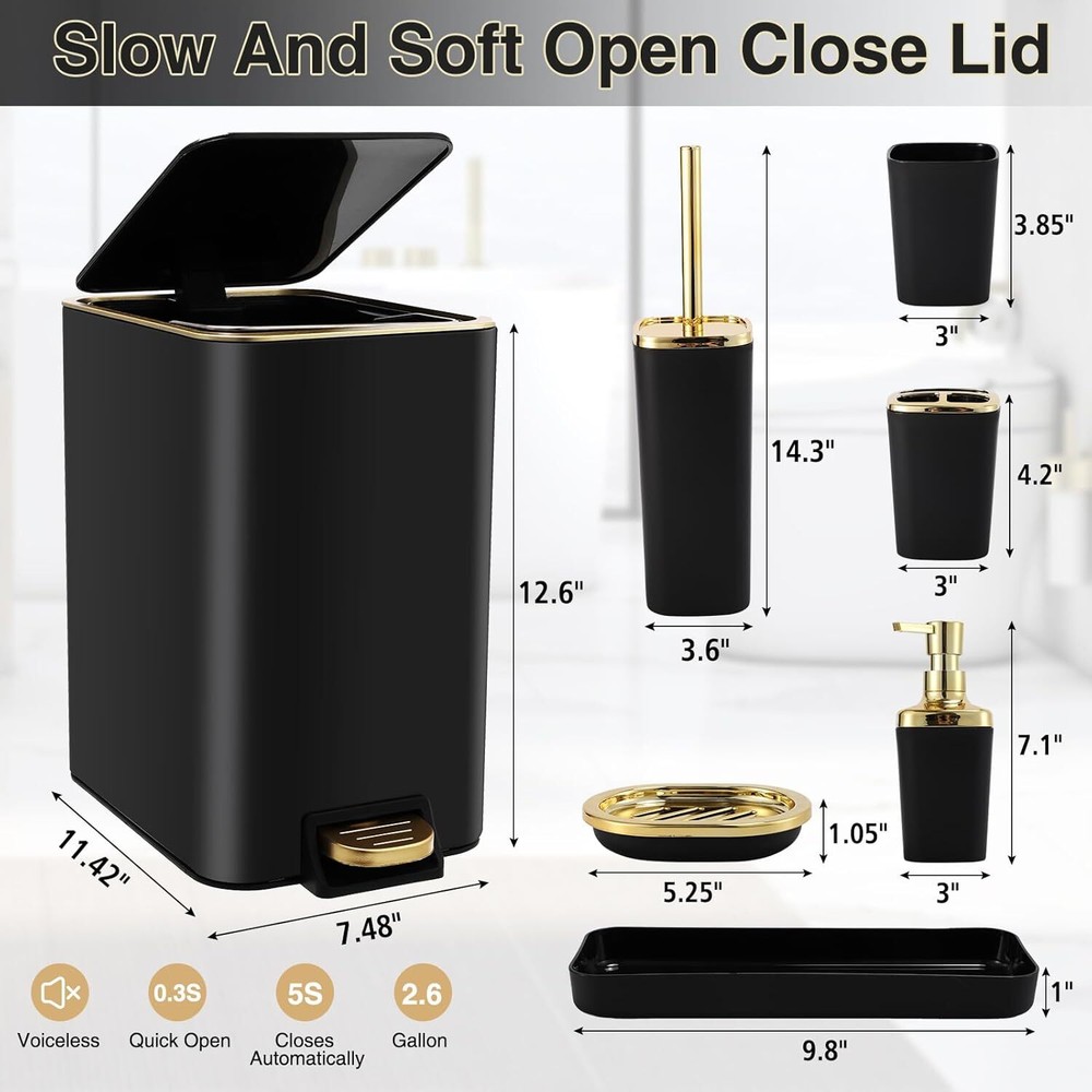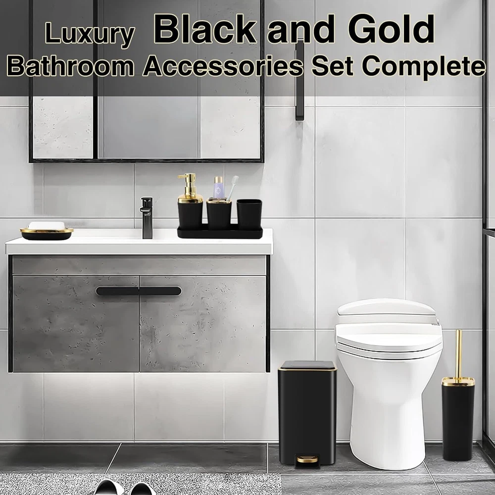 Luxury Bathroom Upgrades-we have carefully designed this black and gold bathroom set. Our bathroom kit accessories set complete including black and gold trash can with pedal, a Lotion Dispenser,Toothbrush Holder,Toothbrush Cup,toilet brush,Vanity Tray,Soap holder. Bringing the ultimate in quality and convenience to your bathroom. Durability Materials-Black and gold bathroom accessories Set Made of selected durable stainless steel materials and plastic materials are selected to ensure durability and rust resistance. Whether you use it daily or for a long period of time, it will keep its original appearance and add a touch of timeless splendor to your bathroom. Easy to clean-Our black and gold bathroom accessories sets complete not only provide high quality stainless steel trash cans and beautiful plastic accessories set, but also focus on easy-to-clean design. black and gold Stainless steel trash can has a smooth surface that is easy to wipe down, plastic accessories set are simple to maintain, and the waterproof design. Fully functional set-From black and gold trash cans to toilet brushes, from toothbrush holders to soap holder, each accessory is carefully selected to meet your daily needs. Our black and gold bathroom set complete not only practical, but also beautiful, make your bathroom space more neat and comfortable. Plus, with our exquisite bathroom accessories toothbrush holder set, your dental care essentials will be elegantly organized, adding both functionality and style to your daily routine. Create a new bathroom experience-This black and gold bathroom trash can set provides you with an all-around bathroom experience and gives your bathroom a new look. The black and gold bathroom accessories set complete not only a simple trash can, but also a thoughtful assistant for your life, adding more convenience and comfort to your life!