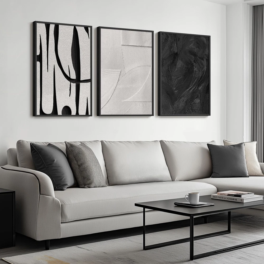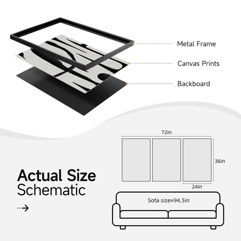 Black and White Abstract Wall Art for Living Room, Large Framed Canvas Black Abstract Pictures Wall Decor, 3 Piece Modern Minimalist Black & White Art Work Painting for Home Office Guest Room Hallway 24x36 Inch Product Details Size: 36" H x 72" W Color: Black and White Dialogue Brand: VAN GOGH ART MPN: Does not apply UPC: Does not apply EAN: Does not apply Product Dimensions: 36 x 24 x 0.2 inches Item Weight: 13 pounds Manufacturer: VAN GOGH ART Date First Available: June 27, 2024 FRAMED MODERN WALL ART: A set of 3 abstract black and white paintings, each 24x36 inch the framed with a sturdy, durable and rust-proof metal aluminum frame, paired with a high-end luxurious black frame, which can enhance the grade of the entire space. HIGH-QUALITY WATERPROOF CANVAS: These paintings are made of high-quality waterproof and anti-fading properties of the canvas ensure longevity and make these paintings suitable for various indoor environments, including bathrooms and kitchens. AS GREAT AS THE PICTURE: Our wall art prints use high-quality inks to ensure that the product you receive is an exact match to the advertising image, providing a true representation of the design. This trio of abstract artworks features a rich dark monochrome on the left, sinuous white lines on a black backdrop in the center, and striking geometric forms with bold black-and-white contrasts on the right. Bask in minimalist allure.(Note: These are 2D giclee canvas prints.) ORIGINAL DESIGN: Each piece is an original design, so the clarity is extremely high, bringing a personalized decorative experience to your home. READY TO HANG: Each painting is framed for you. After receiving it, you only need to hammer two nails into the wall to hang it up and decorate your beautiful home.