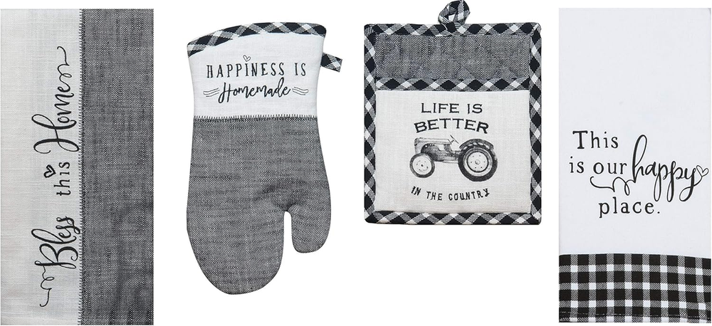 Absolutely love this farmhouse kitchen set! The linen is soft yet durable, and the black-and-white design so chic. The towels absorb well, the mitt protects my hands, and the potholder is super handy. Perfect for both style and function—feels like a cozy upgrade to my kitchen. Highly recommend!