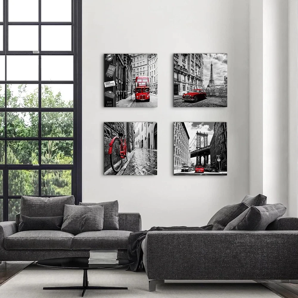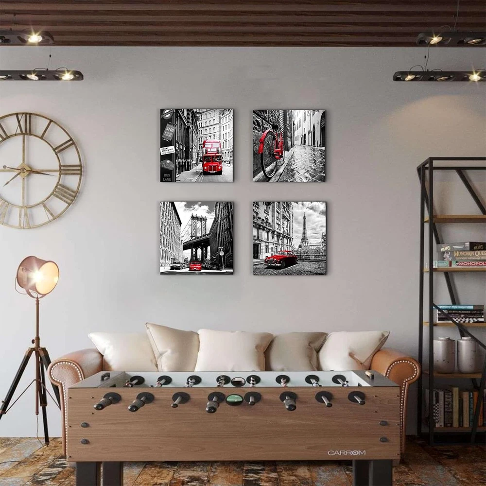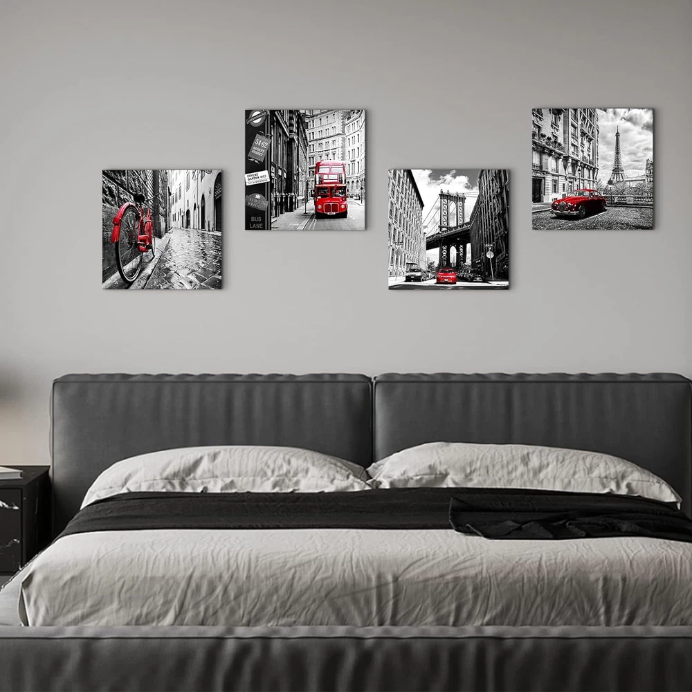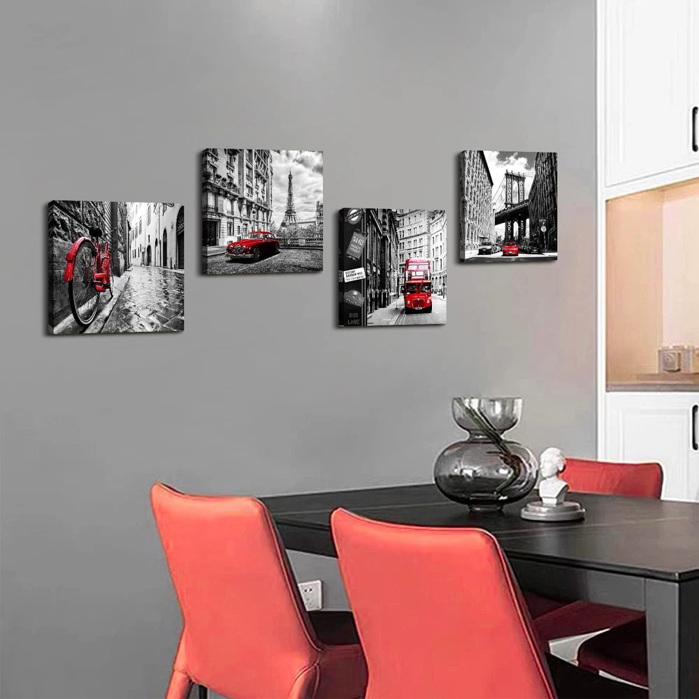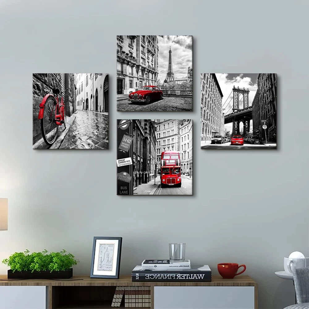 ❤【Paris Decor Wall Art for Bedroom】: black and white framed canvas artwork for walls prints perfect for office, bedroom, kitchen, apartment, hotel, house, dining room, bar, restaurant, coffee shops, library, nursery, study room, living room. Black and white wall pictures take you to explore a romantic trip to Paris/England/London/New York. It can brighten and complement your space with a subtle sense of love and joy, keep you enthusiastic and romantic about life. ❤【Red Wall Decor for Living Room Premium Art】: high definition giclee prints black and white paintings: ECO solvent-ink print on canvas, easy to clean and no smell compare with oil paintings. High-gloss, vivid color, waterproof and UV resistant, each black and red pictures canvas print is stretched and wrapped extends over the solid wood frame, and already with hooks and accessories on the paintings that can be hung at any time. ❤【Black and White Pictures for Bedroom Wall Decor Special Gift】: Those minimalist modern home decor who want to add some texture to their room space, it is the nice ideal choice for a meaningful and creative look for your family and friends, colleague or partner on Thanksgiving Day, Valentine's Day, Halloween, Christmas, New Year and Anniversary and other special holidays. ❤【Black and White Wall Pictures appearance】: Black and white Eiffel Tower, Telephone Booth, bicycle photo prints take you to explore a romantic trip to Paris. Black and white city canvas wall art pictures office decor for men, office decor for women, office accessories, gifts for the office, Christmas decor, desk decorations for women office,mens office decor, office themed gifts, office decorations for work, wall decor for office, inspirational wall art for office, office pictures for wall, the office is always popular. ❤【Black and White Bathroom Decor Please Note】: This black and white wall art product is packed in cartons ,each product is packed in clear plastic which to protective products can better avoid breakage. Due to the light and screen setting difference, the item's color may be slightly different from the pictures.Prints are waterproof, paintings can be cleaned by wet cloth, please avoid long time directly strong sunlight and any possible oily stain. Product Description Black and White Wall Art Famous City Landscape Canvas Picture for Bedroom Decor It's time to pick up your passion for life! Popular transport element: bicycle, car and double bus,perfect for a avid biker. Each panel picture is carrying a story, makes your home be full of restore ancient atmosphere. Classic white and black , red, warm and unrestrained,adds extraordinary colors to our busy life,shows owner's active enthusiasm for the future life. 4 Pieces Framed City Landscape Prints Black And White Wall Art Paris Eiffel Tower, NYC Brooklyn Bridge, London Big Ben Phone booth and Rome Street,compare with the colorful pictures,this contemporary black and white artwork brings the old days style.It is also a nice wall art for Bedroom,Bathroom,Living room,home ,office, hotel, restaurant, Bar and more places. Original design The artist's artistic inspiration produces a stunning, top-quality visual impact artwork. Canvas professional stretches in wood frame,with a metal hook on the back of each panel that has been mounted, ready to hang. The extra mirror edge of the canvas on each panel extends to the side to produce a first-rate 3D effect. Each print panel is packed into a plastic bag and placed in a solid main carton for transport. Contemporary Wall Art for Different Scene Black and White Kitchen Wall Decor Brighten up your kitchen walls embellish the space become not boring.Believe your family and friends who visit your home will like it. Paris Decor for Bedroom Wall Art Thanksgiving,Christmas,Anniversary,Mothers day,Fathers day, Valentine's Day gift,New Year perfect ideal gift. Red Wall decor for Living Room School, Hotel,bar, club, restaurant and other public place also good for hanging this nice wall decor to get you a good mood. Important Notes: Please note display pictures are only for illustration purposes. Please measure your wall properly and make sure you pick the right size. They were not taken in real display rooms and do not represent the real size of the print set. They are just as an idea to help you being aware of how this canvas art print looks like in a room.