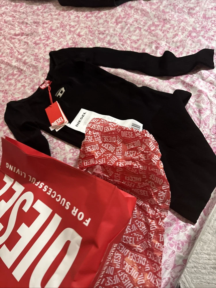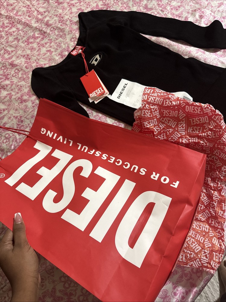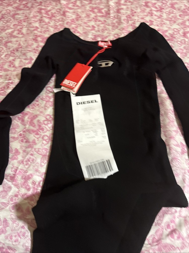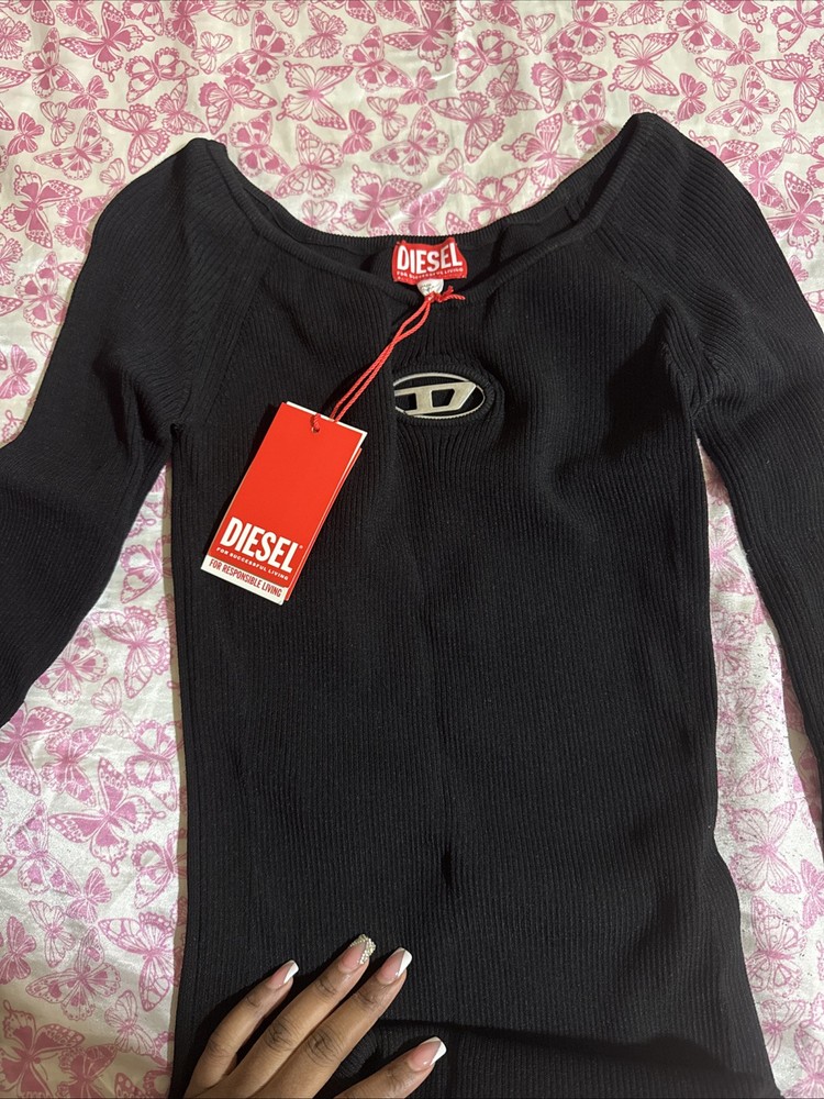 This women’s long-sleeve dress has a metal Oval D plaque nestled in the chest cut-out and a wide neckline that can be worn off-the-shoulder. It’s made from close-fitting ribbed knit containing viscose from responsibly managed forests and falls to a mini length.