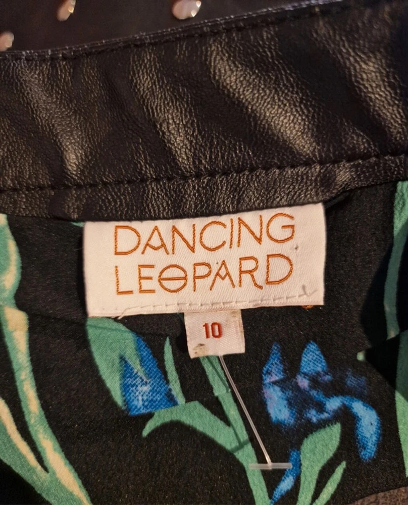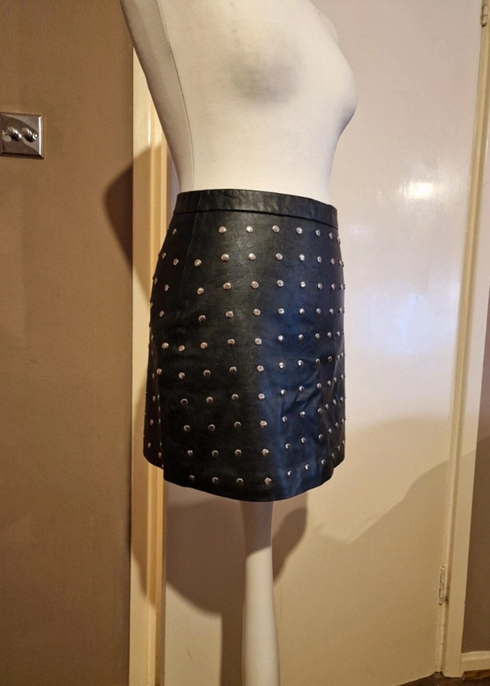 Dancing Leopard faux leather skirt - size 10. Gorgeous silver studding all over. Back zip fastening. Cute floral pattern fully lined fabric. Small scuff under the zip at the back, think it's where I may have caught the zip to the fabric once. Not noticeable when wearing.