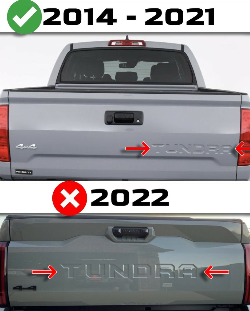 Attachment Type: Self-Adhesive Universal Fitment: No Color: Black Material: Acrylic Manufacturer Part Number: TUNDRA-Black Type: Tailgate Vintage Part: No Finish: Gloss Features: Easy Installation Other Part Number: ` Brand: Advanced Trims Placement on Vehicle: Rear Country of Origin: United States Manufacturer Warranty: 5 Years