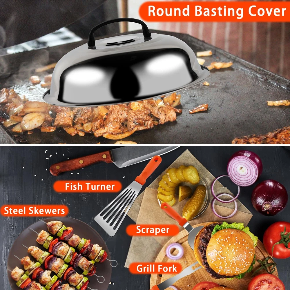 This griddle accessory set offers a collection of versatile tools designed to complete your grilling experience and expand your cooking capabilities. It contains a variety of practical tools such as scrapers, shovels, and brushes to easily solve various grilling tasks. Their design is also very user-friendly and easy to carry and store. This barbecue tool set will bring you more convenient and diverse cooking methods, allowing you to enjoy more delicious meals. Whether you are a new cook or an experienced chef, this set is an indispensable addition to your kitchen. 【Practical 27PCS BBQ Accessories】This griddle accessories kit includes: long griddle spatula, small spatula, slotted spatula, slotted turner, griddle flipper, slant edge scraper, basting cover, grill fork, chopper, sauce brush, cleaning brush, 2 squeeze bottles, 2 egg rings, 5 hanging hooks, 5 kabob skewers, carry bag and gift box. 【Food Grade Stainless Steel】The griddle tool kit is made of high quality stainless steel, so you can enjoy your grilling, camping or cooking without worry. It is heat-resistant, rust-proof and dishwasher safe, easy to clean. 【Chef's Choice Griddle Accessories Kit】It includes various necessary tools like scraper, spatulas, which helps you complete all the griddle applications as a restaurant chef. Spatulas are great for flipping burgers, pancakes, veggies, and cutting bread, meat, sausage, while chopper & scraper are easy to dice food and scrape griddles clean. The long griddle spatula can move large amounts of food quickly and accurately. Egg rings and kabob skewers will enhance your griddle cooking experience. 【Easy to Storage & Carry】This grill tools set is packed in a compact carry bag in an orderly manner and under better protection. You can take it anywhere anytime to camping or picnic. 【Great Gift Choice】This barbecue tools set is an ideal gift choice for Fathers Day, Thanksgiving, Christmas, birthday or other holidays. It is also an ideal gift for friends, lovers, family members or camping enthusiasts who love cooking or barbecue.