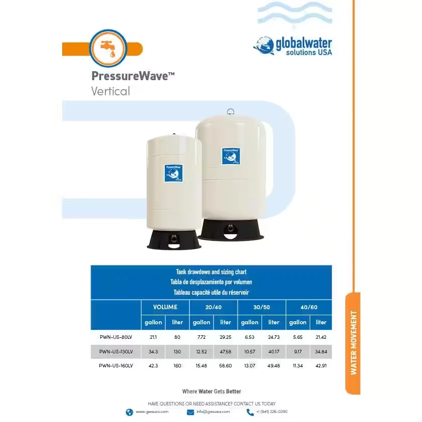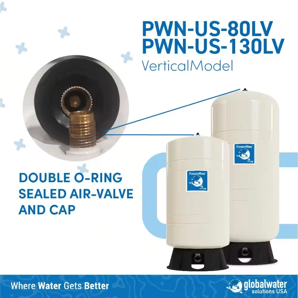 Store New Arrivals Add to Favorite View Feedback Contact Bladder Tank Water 22 Gal Pressurized Well Tank Precharged Air Pump PressureWave Description Features Corrosion Resistant,Pre-Charged Impeller Material N/A Included No Additional Items Included Maximum inlet pressure (psi) 150 Orientation Vertical Pack Size 1 Pipe Size 1 in. Product Weight (lb) 32.8 lb Returnable 90-Day Tank Material Steel Tank Volume (gallons) 21 gal Manufacturer Warranty 5 Year Limited Warranty Equivalent Capacity (gallons) 42 Product Depth (in) 15.3 in Product Diameter (in) 15.3 in Product Height (in) 32.1 in Product Width (in) 15.3 in Industrial strength, long-lasting robust design Professionally engineered to be MAINTENANCE FREE Holds two CERTIFICATIONS for drinking water safety & reliability The PressureWave tank is a premium-quality, industrial-strength pressurized well tank used by top pump companies and installers around the world. The water chamber is constructed of a virgin polypropylene liner and a FDA compliant, high-grade butyl diaphragm which does not impart any taste or odor to your drinking water and keeps the water contaminant-free. The O-ring-sealed air valve and cap and our stainless steel patented water connection ensure no air leakage. The corrosion-free, rugged composite base and rust-resistant exterior paint finish add to the tank's longevity. This is a maintenance-free, pre-charged pressure tank which is backed by a 5-year warranty and can be a direct replacement for most installations. Contaminant-free water chamber WQA certified to NSF/ANSI/CAN 61 and 372 standards Maintenance-free Physical separation of air and water chambers for peak operating performance and improved efficiency Deep-drawn steel construction ensures structural integrity and pressure bearing capability FDA compliant butyl molded diaphragm is secured by a clench ring, reinforced and does not fold, bend or crease - limiting wear and tear and air loss with cycles 100% pure polypropylene liner separates water from the steel tank shell, prevents corrosion and maintains the quality of drinking water 1 in. NPT 100% stainless steel, patented water connection eliminates air loss, corrosion effects and ensures no cross-threading or cracking Leak-free, double O-ring-sealed air valve and cap Anchorable, corrosion-free, replaceable tank base 38 psi pre-charge with 150 psi maximum working pressure Durable, rust-resistant 2-part polyurethane exterior paint Minimum, the tank you choose must be able to hold the amount of water your pump can supply in 1-minute, please see drawdown chart for details, there is no downside to choosing a larger tank as a bigger tank can reduce pump cycles, thereby extending the life of your pump and conserving electricity Note: well tanks should not be used for RO systems or in thermal/hydronic expansion applications 5-year limited warranty 21.1 gallon of total volume; standard AOW, plain or galvanized tank equivalent of 42 gallon ABOUT US We offer the best prices around on high quality products. Our E-store includes tools, general home, garden items and more. SHIPPING We are always working hard to ensure your package arrives as soon as possible. Please understand that some factors like weather, high postal traffic, and the performance of shipping companies are outside of our control. We offer free shipping to the lower 48 states and ship within 4 business days of payment, usually sooner. We do not accept P.O. Boxes. Please provide a physical address. RETURNS We offer a 30-Day Return Policy on items which you are not completely satisfied with. You have the option for a full-refund or an exchange of the item. No returns are available on items shipped outside of the USA. PAYMENT We accept PayPal. CONTACT US This page content is yet to come Please ad us to your favorite seller and visit again later Thank You CUSTOMER SATISFACTION We try our very best to make sure every customer is completely satisfied. If there's a problem, message us! We're happy to help. WE ACCEPT Copyright © 2017 AutoDs. | All Rights Reserved