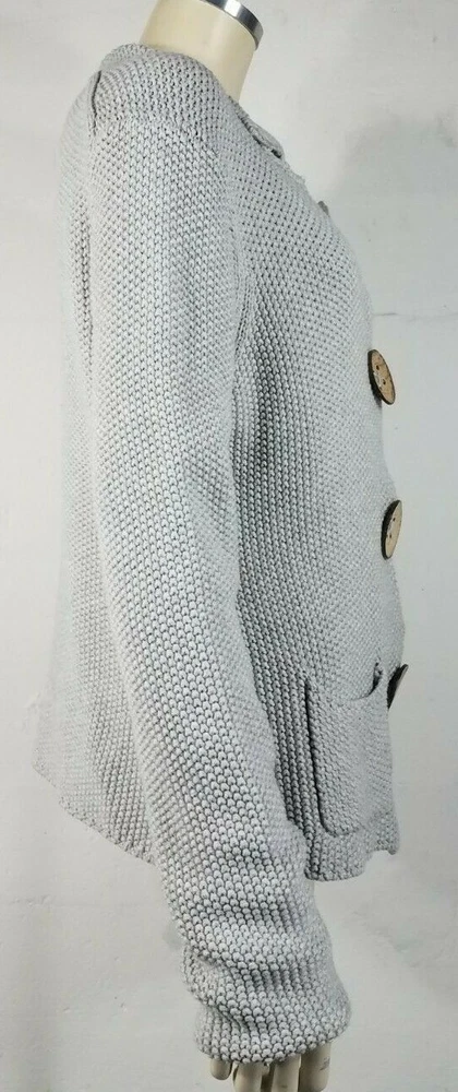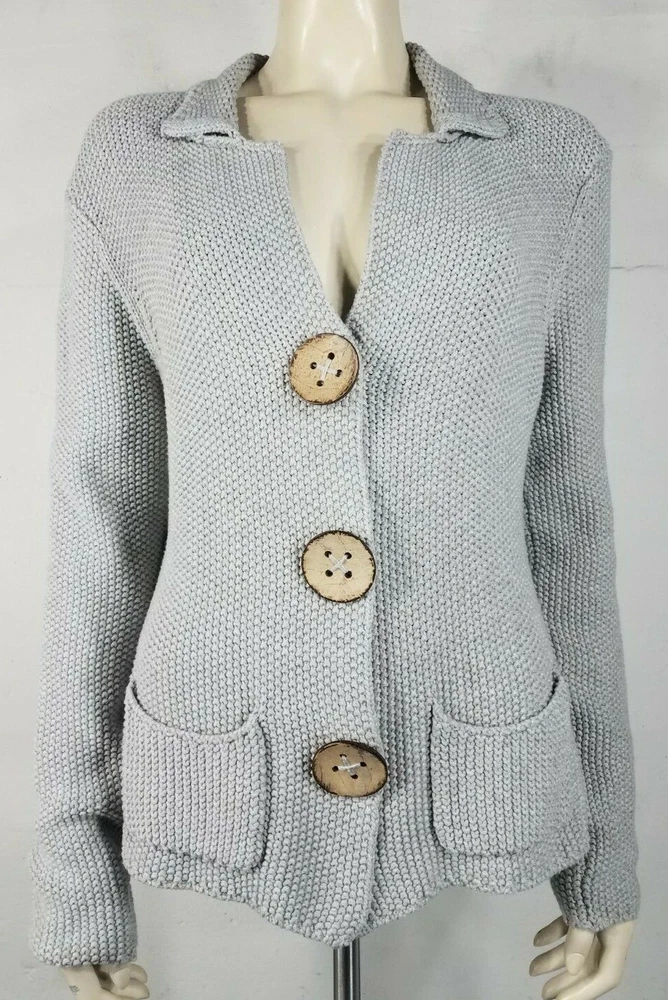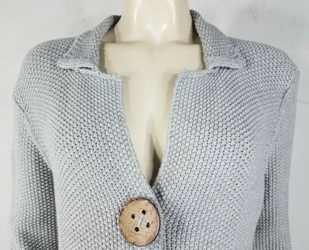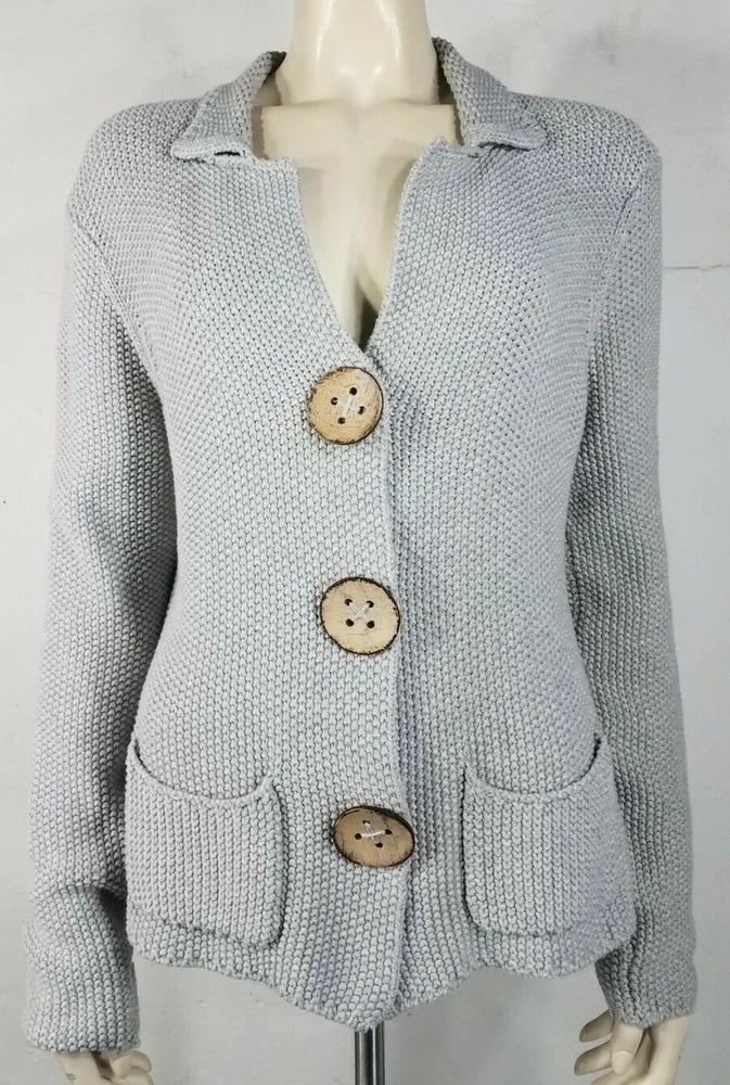 ladies collared V-Neck button front cardigan sweater Blarney Signature brand gray size L (Please refer to measurements below!) 100% cotton Excellent pre-owned condition!! No flaws to speak of. Measurements lying flat: Bust (pit to pit): 21 inches. Length (from nape of neck to bottom hem): 22 inches. Policies and Disclosures: RETURNS: Returns are accepted within 30 days of purchase. Buyer is responsible for return shipping. All items from this store come with an identification tag; Item(s) must be returned in original condition with the I.D. tag intact for a refund. SHIPPING: I do combine shipping when multiple items are purchased. In order to provide you with the least expensive price, you will need to send me a message requesting an invoice with combined shipping. CLOTHING: My goal is to sell only the finest quality new and gently used clothing items in my stores, and I strive for 100% satisfaction with every order. While my home is smoke-free, other pre-owned items from different sources cannot be guaranteed as smoke-free or pet-free. It is assumed that you as the buyer will be cleaning the garment once it arrives to you, so unless there is an obvious stain or odor, the clothing has not been laundered. I felt it was best left up to the buyer so no issues would surface regarding detergent allergies, shrinking, etc. Please note that any must or smoke odors can almost always be completely removed by adding 1 cup of distilled white vinegar to your normal wash cycle. I provide measurements on all my clothing items so that you, as the buyer, can make an informed decision about your purchase. Please use that information to compare it with a garment that fits you well to determine if the item will work for you. Seller will not assume responsibility for return postage on items that do not fit. COMMENTS: Please note that every item I sell is described to the best of my knowledge and ability, however, I am a human being, so occasionally I do make mistakes. Colors may vary slightly between screens and monitors. Sizing can vary from brand to brand. If you have any questions about the item(s), free to ask and I will do my best to get back with you in a timely manner. If you have any issues with your purchase, please do not hesitate to contact me prior to leaving negative feedback so we can try to resolve the issue. I am flexible and easy to work with. If you see something you are interested in, feel free to make a reasonable offer! (On a side note: Lowball offers are insulting and will be declined.) Take a moment to browse my other items for sale. I offer a large variety of items, with new items daily, so there’s something for everyone! Thanks so much for taking the time to look and have a wonderful day!