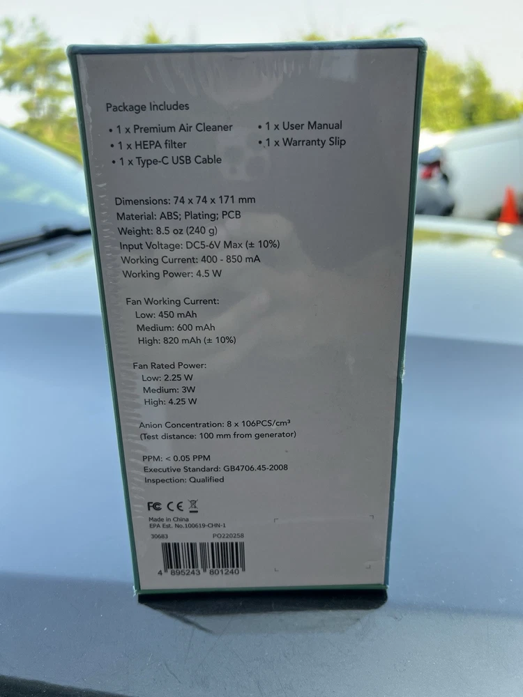 This Blast Auxiliary Premium Air Cleaner is a portable device with push-button control, powered by USB. It is designed in a sleek white color and is ideal for use in cars or bedrooms. The model is Fresh Air Living, made of plastic with HEPA-Type filtration technology for improved indoor air quality.
