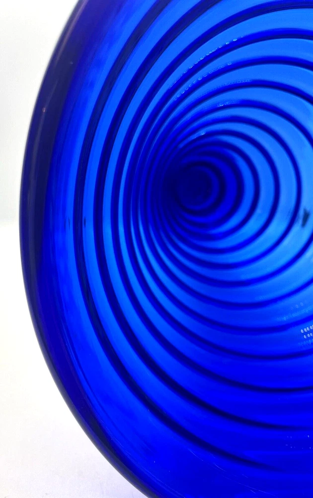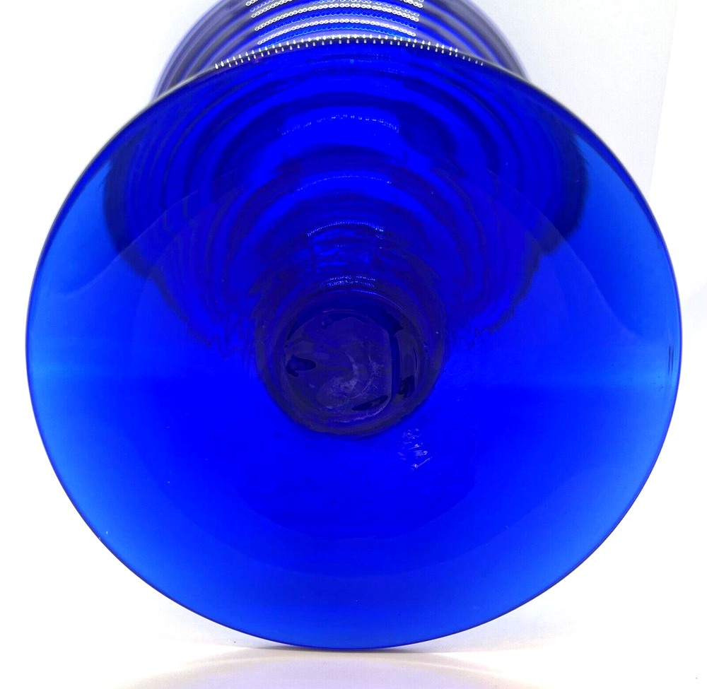 Blenko Handmade Cobalt Blue Ribbed Pedestal Vase This vase is in excellent pre owned vintage condition. There are no chips or cracks. It measures 11" tall. Please note the photos for detail.
