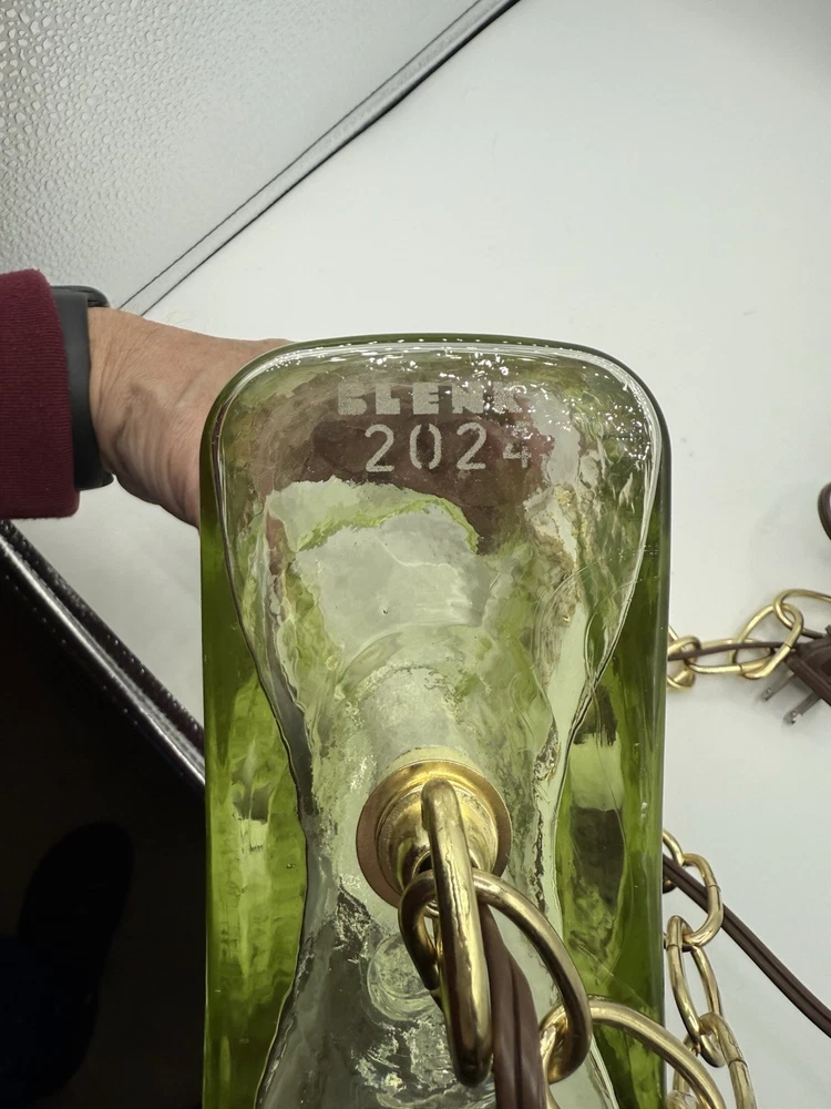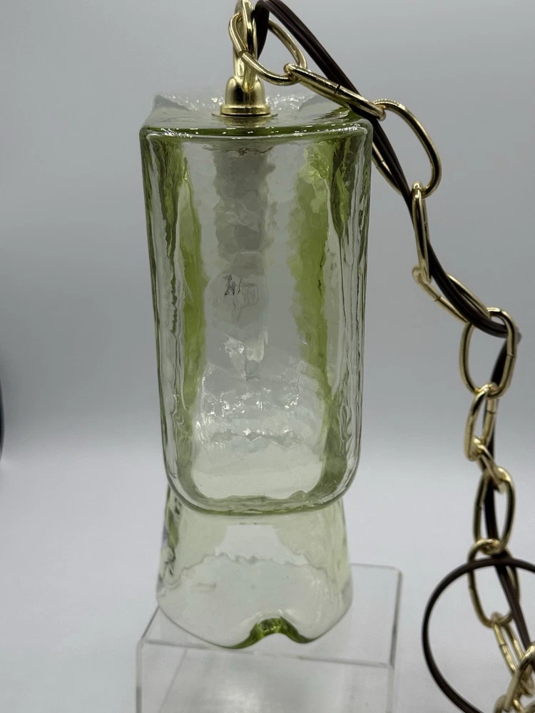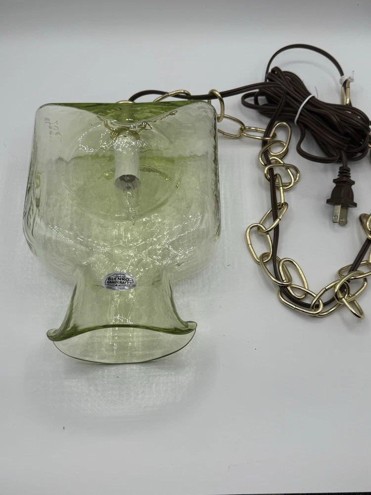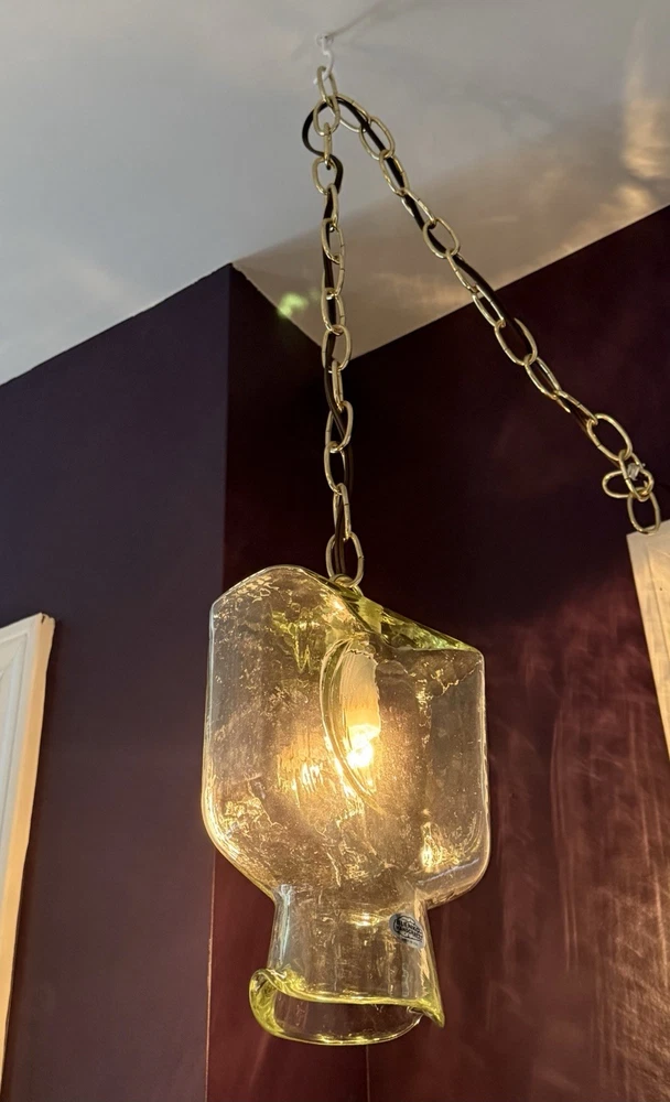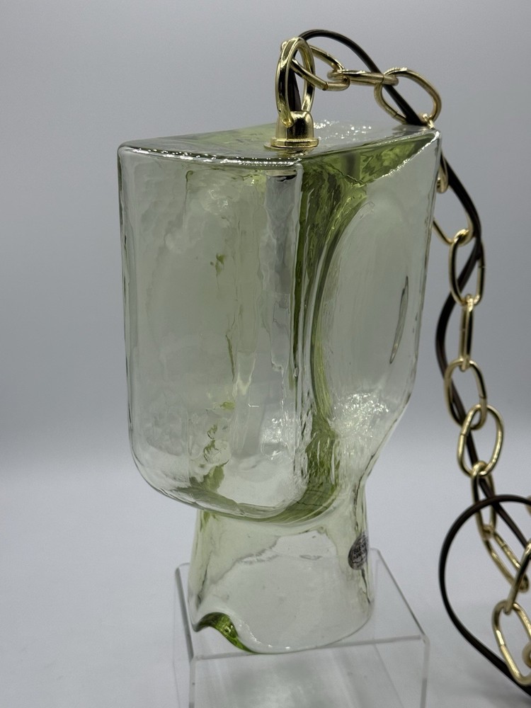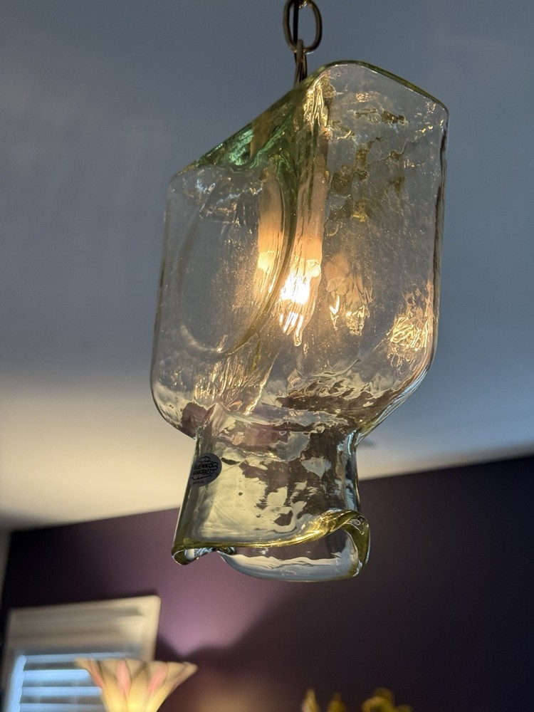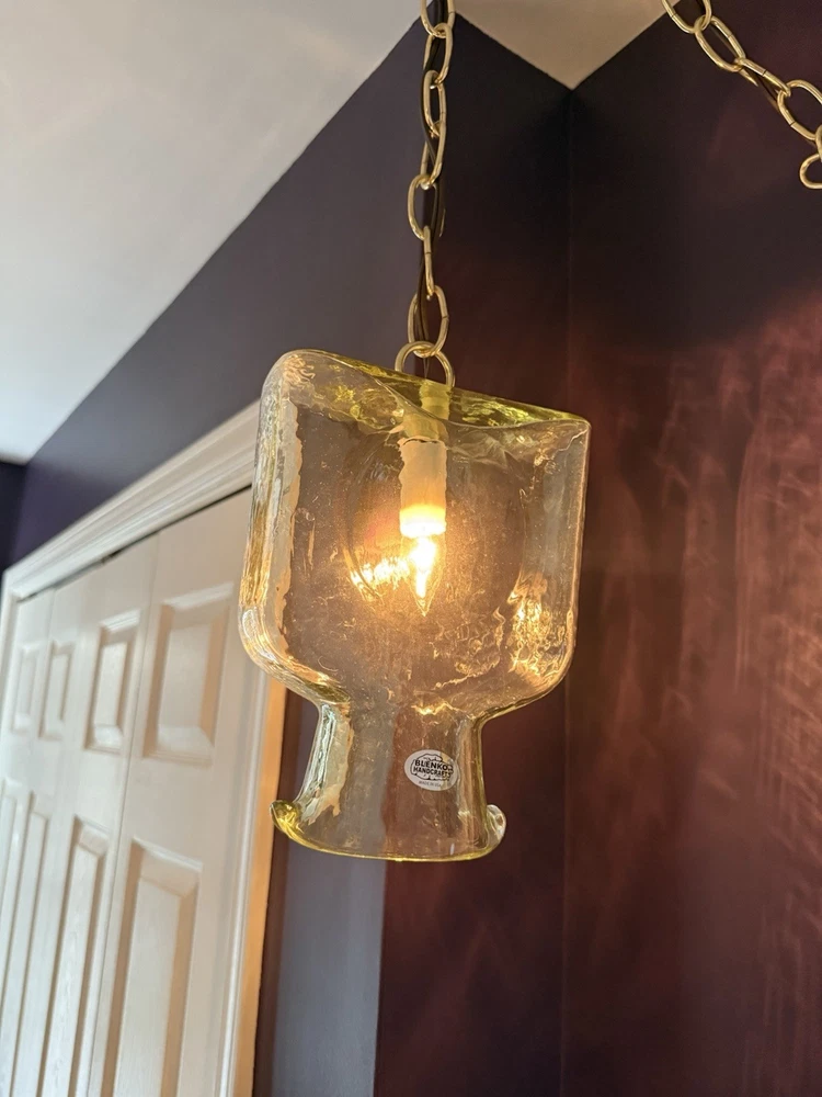 VISITOR CENTER EXCLUSIVE - Hanging 384 Water Bottle Light! Charlie Harshbarger has been working at Blenko since 1979 and is the creative genius behind Blenko’s lighting and lamps for decades. He’s the one who thought of taking the classic Blenko 384 Water Bottle and transforming it into a Hanging Pendant Lamp! When I purchased these, Charlie was helping me put things on my table and proudly let me know that he was the one who made them. A whole was drilled in the bottom of the water bottle to make room for the light assembly and chain/cord attachment. The chain portion is 3 feet long. The total cord length is 15 feet long so you have plenty of cord to plug this up most anywhere. It’s great because it doesn’t take any special wiring, just put a hook in the ceiling and you’re ready to go. I have a few of these available with different water bottles. A few of these were made available at the warehouse sale. It’s really random as to what they may have available in the visitor center, if any at all, and especially with water bottles that are no longer being produced. This one is made from a WORMOOD water bottle. Here is the description of the bottle below. Blenko Limited Edition Wormwood 384 Water Bottle, Double Spout Pitcher Beautiful Wormword 384 Water Bottle. This bottle was briefly available online in First Quality, but sold out in under an hour, and at the Blenko Visitors Center in limited numbers. The bottle is an Absinthe wash - whenever Blenko transitions furnaces from one color to another, they *wash* the furnace with Crystal glass to get all of the color out of the furnace. Absinthe being washed with Crystal resulted in this acid green bottle. It reminds me A LOT of Vaseline glass in appearance (but it does not glow under UV). It's kind of hard to capture the full color in pictures- the green comes across stronger in person than it does in the photos. Absinthe was a limited color, so there will not be any more of these! It is etched Blenko 2024 on the bottom. The only other 384 Water Bottle Blenko used Absinthe for was the Lotus bottle they made for 2025 Water Bottle Week. If you are interested in multiple items, I will combine shipping. Please let me know and I will try to get the best shipping rate for the combined order.