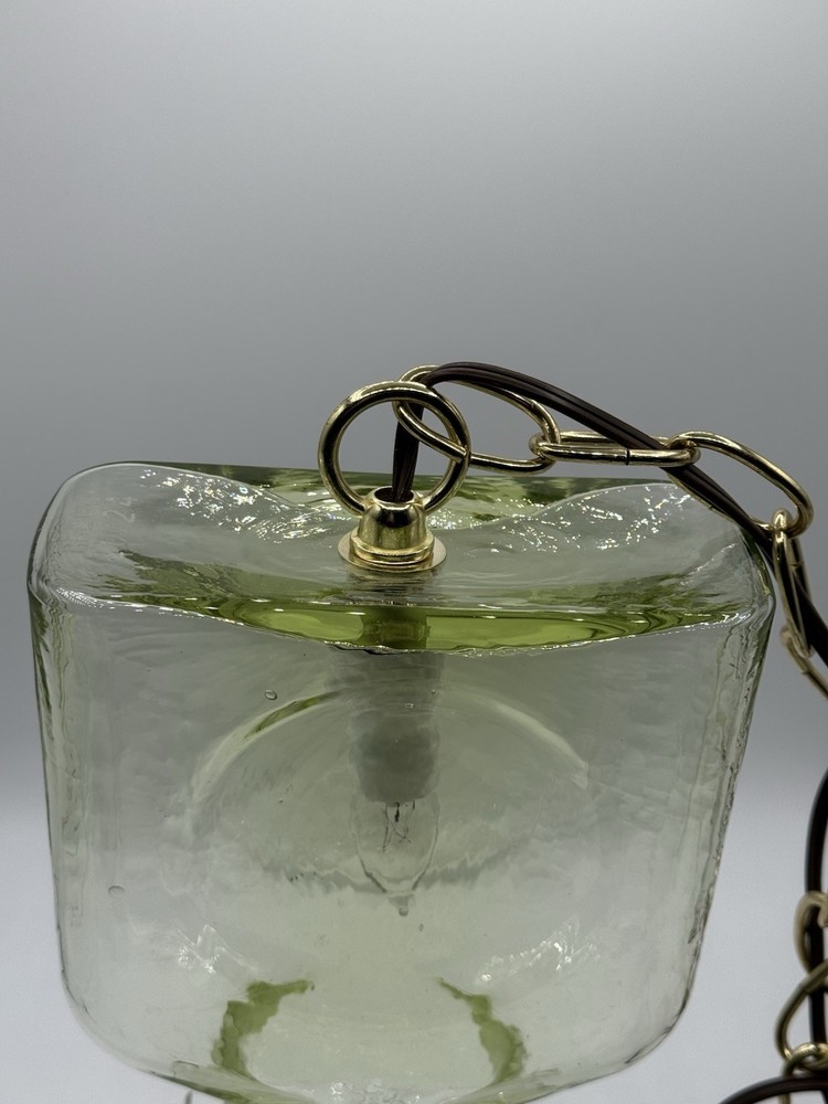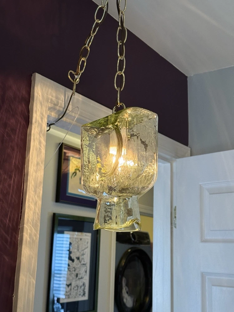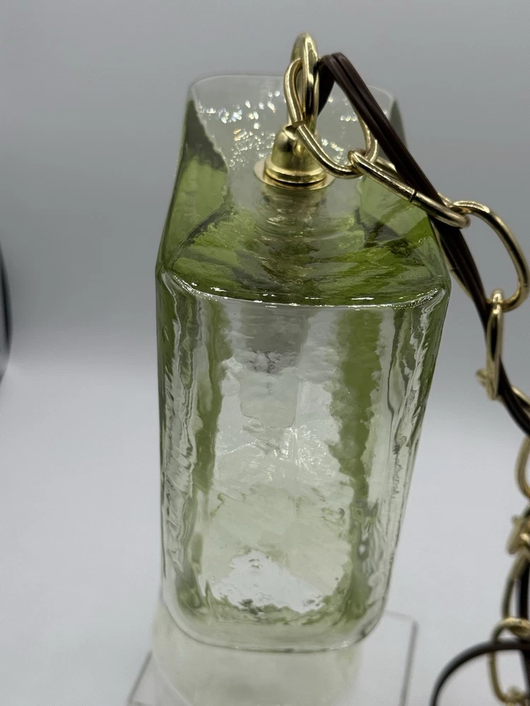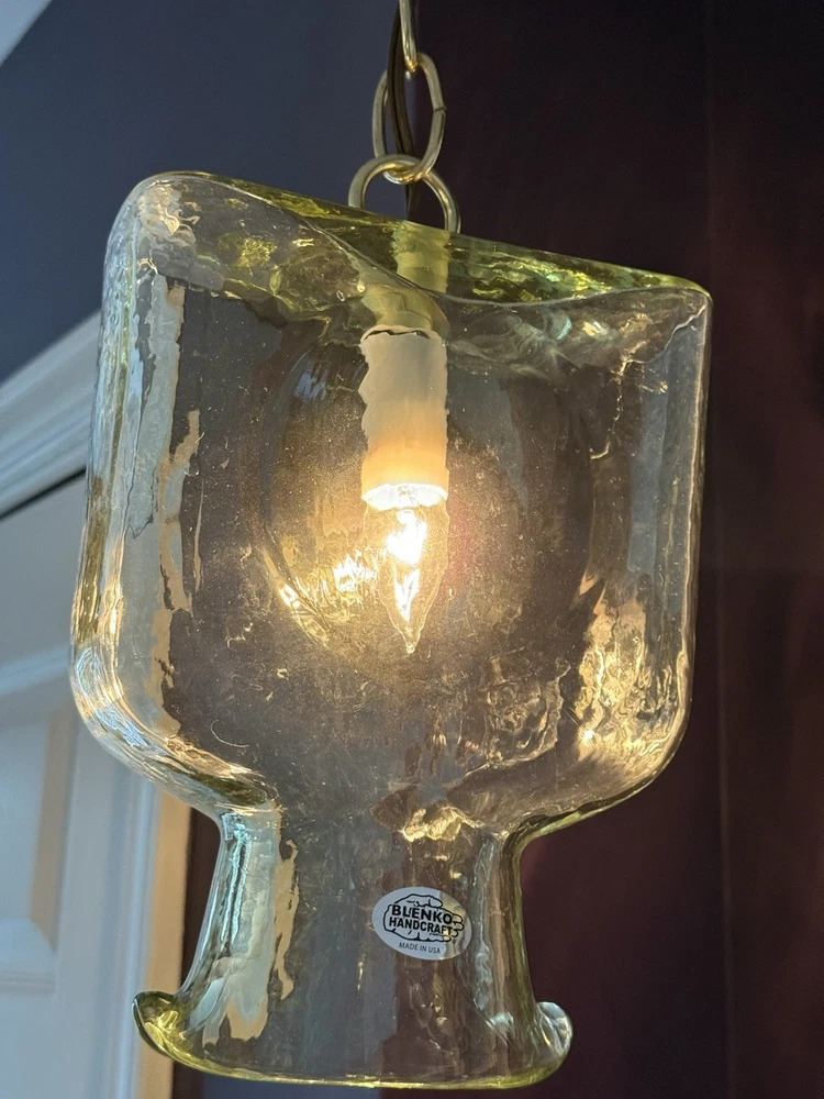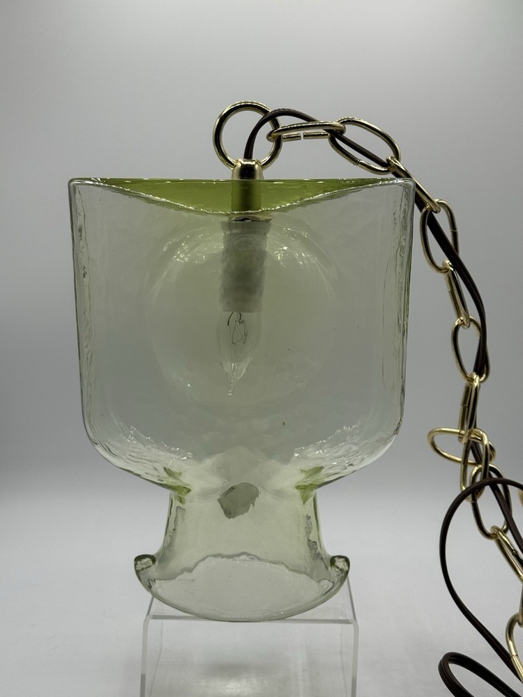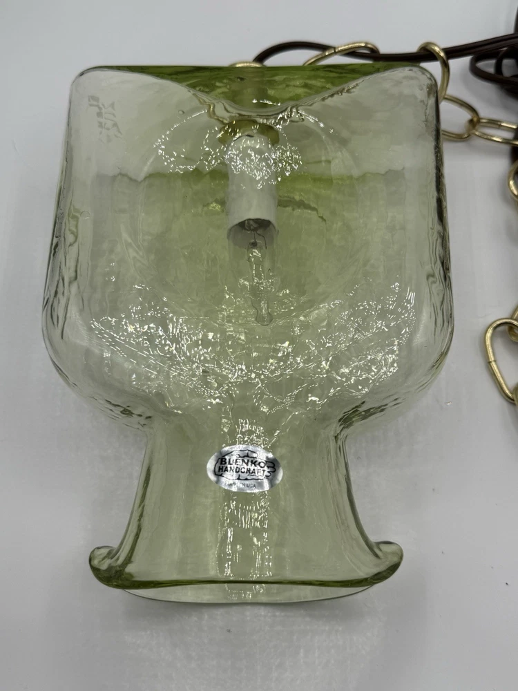 VISITOR CENTER EXCLUSIVE - Hanging 384 Water Bottle Light! Charlie Harshbarger has been working at Blenko since 1979 and is the creative genius behind Blenko’s lighting and lamps for decades. He’s the one who thought of taking the classic Blenko 384 Water Bottle and transforming it into a Hanging Pendant Lamp! When I purchased these, Charlie was helping me put things on my table and proudly let me know that he was the one who made them. A whole was drilled in the bottom of the water bottle to make room for the light assembly and chain/cord attachment. The chain portion is 3 feet long. The total cord length is 15 feet long so you have plenty of cord to plug this up most anywhere. It’s great because it doesn’t take any special wiring, just put a hook in the ceiling and you’re ready to go. I have a few of these available with different water bottles. A few of these were made available at the warehouse sale. It’s really random as to what they may have available in the visitor center, if any at all, and especially with water bottles that are no longer being produced. This one is made from a WORMOOD water bottle. Here is the description of the bottle below. Blenko Limited Edition Wormwood 384 Water Bottle, Double Spout Pitcher Beautiful Wormword 384 Water Bottle. This bottle was briefly available online in First Quality, but sold out in under an hour, and at the Blenko Visitors Center in limited numbers. The bottle is an Absinthe wash - whenever Blenko transitions furnaces from one color to another, they *wash* the furnace with Crystal glass to get all of the color out of the furnace. Absinthe being washed with Crystal resulted in this acid green bottle. It reminds me A LOT of Vaseline glass in appearance (but it does not glow under UV). It's kind of hard to capture the full color in pictures- the green comes across stronger in person than it does in the photos. Absinthe was a limited color, so there will not be any more of these! It is etched Blenko 2024 on the bottom. The only other 384 Water Bottle Blenko used Absinthe for was the Lotus bottle they made for 2025 Water Bottle Week. If you are interested in multiple items, I will combine shipping. Please let me know and I will try to get the best shipping rate for the combined order.
