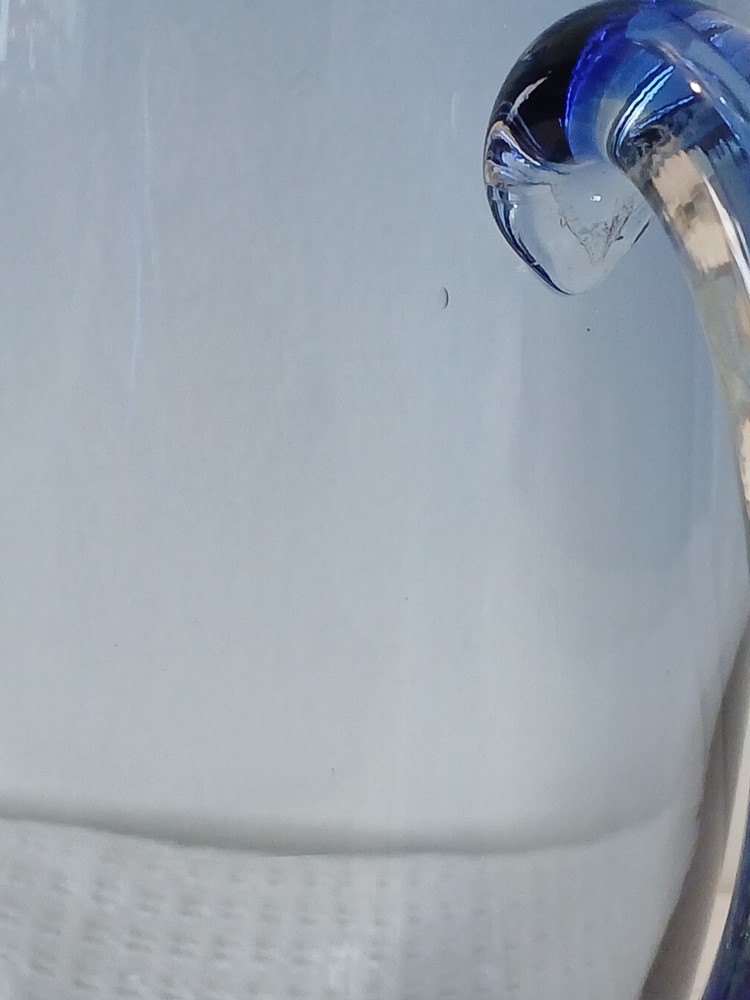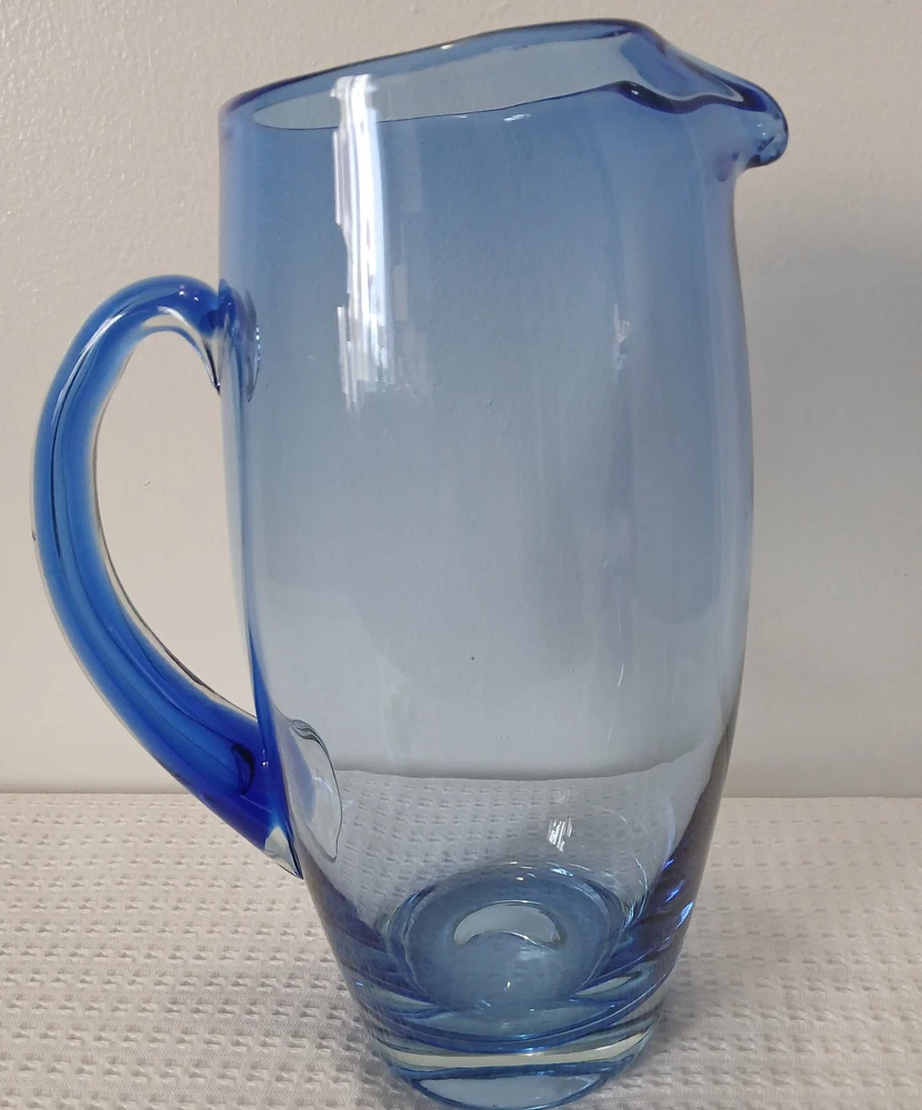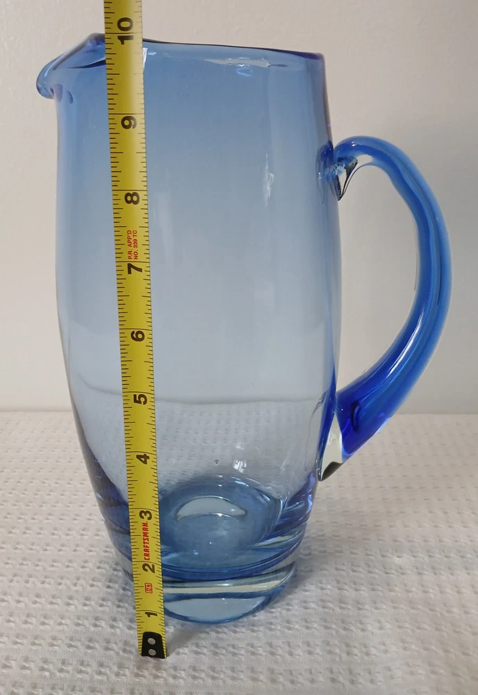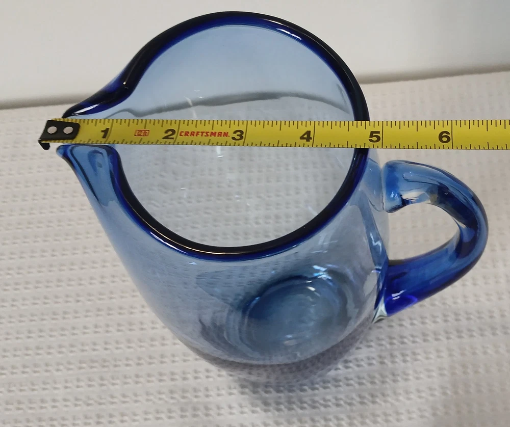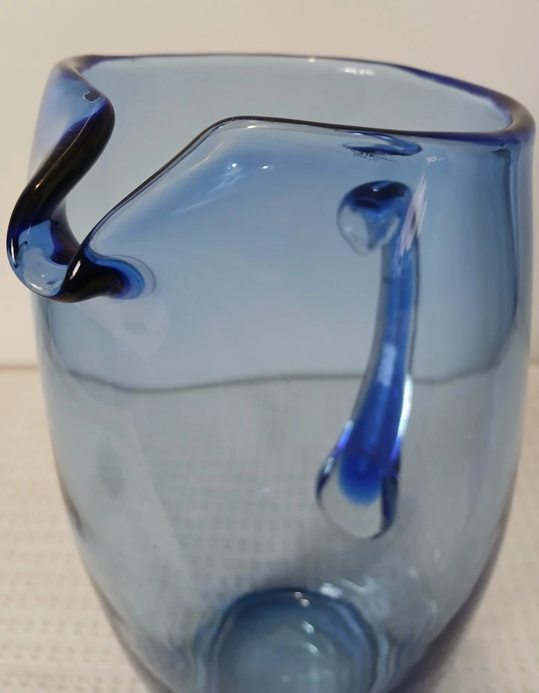 This item is pre-owned, vintage, and possibly antique with no damages chips or cracks. There may be a couple of flea bites and bubbles in the glass as I believe this to be hand-blown it's unmarked but looks to be inspired by Blenko or Bohemia Glass. It's very heavy, weighs about 4 pounds. Approximately 10x8x4 inches. You receive the same pitcher shown. Pictures show all angles and details, and a tape measure for size reference. Carefully packed and shipped to you by the next business day