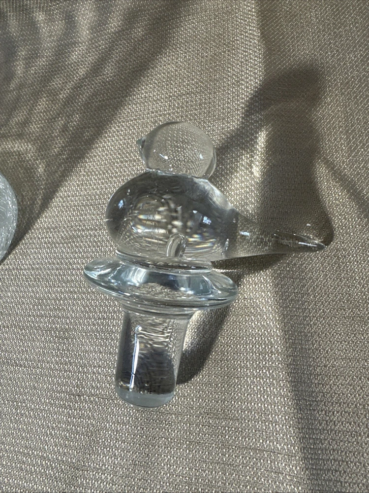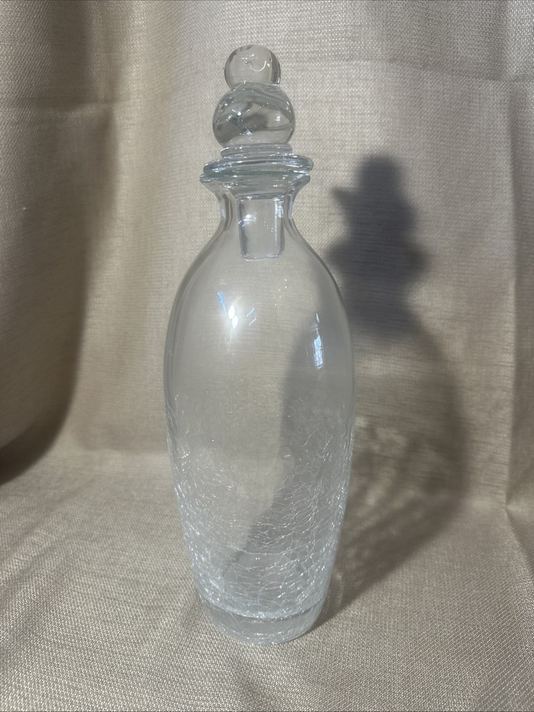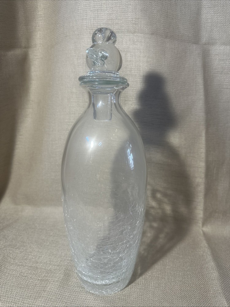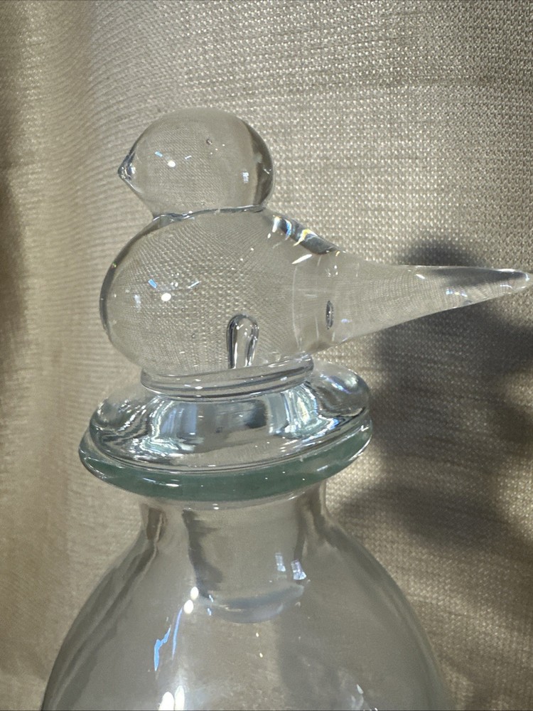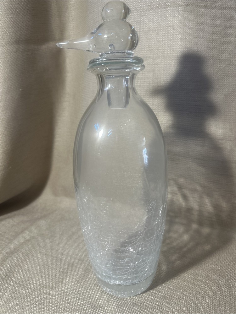 This Blenko Mid-Century Modern Clear Crackle Glass Decanter with Bird Stopper is a vintage piece from the 1960s. Handmade with a glossy finish, it features a round shape and is made of glass. The decanter is designed in a Mid-Century Modern style, making it a unique and stylish addition to any collection or home bar. With its original production technique of hand-blown glass, this decanter showcases the craftsmanship of the era.