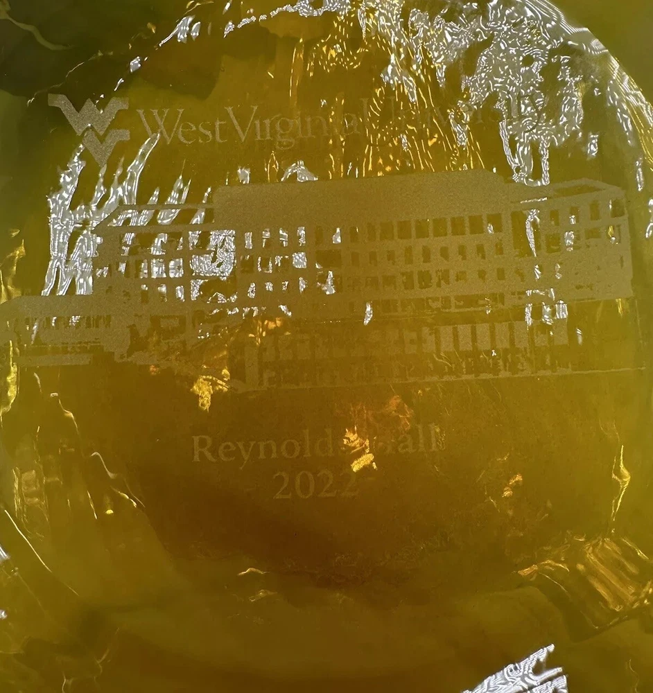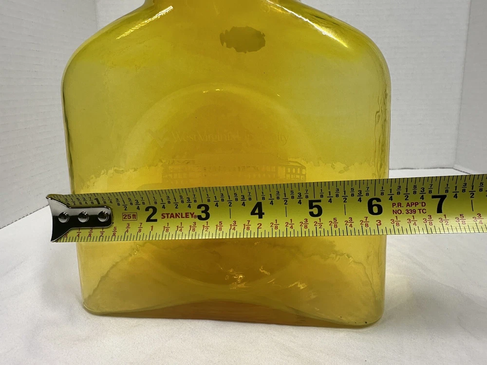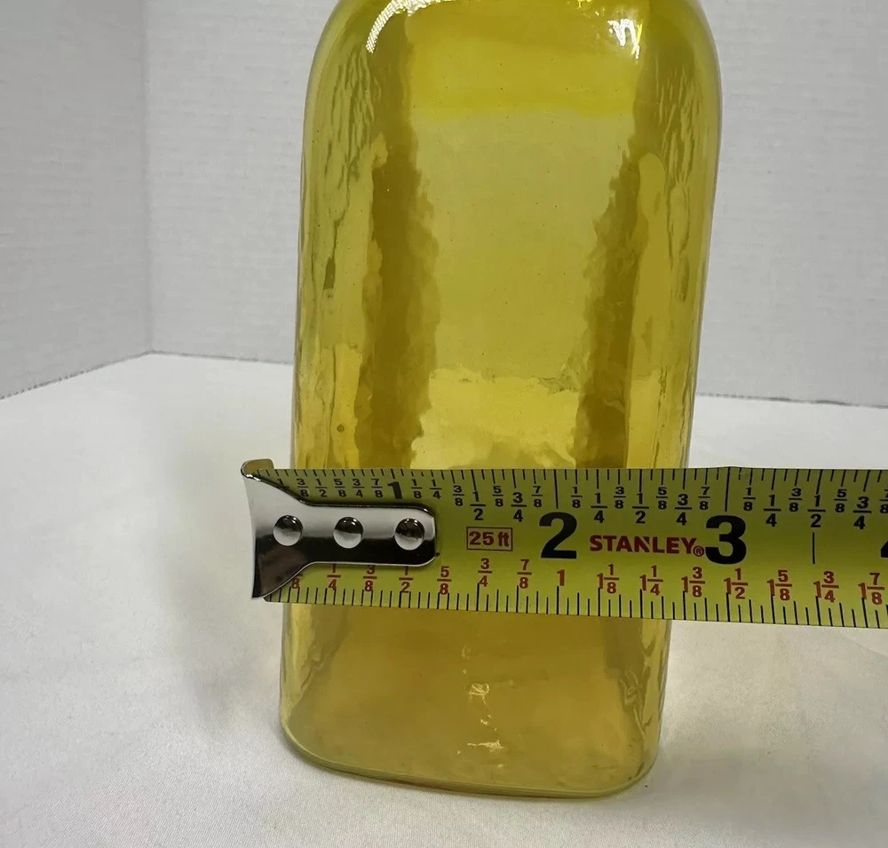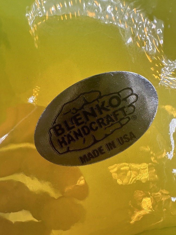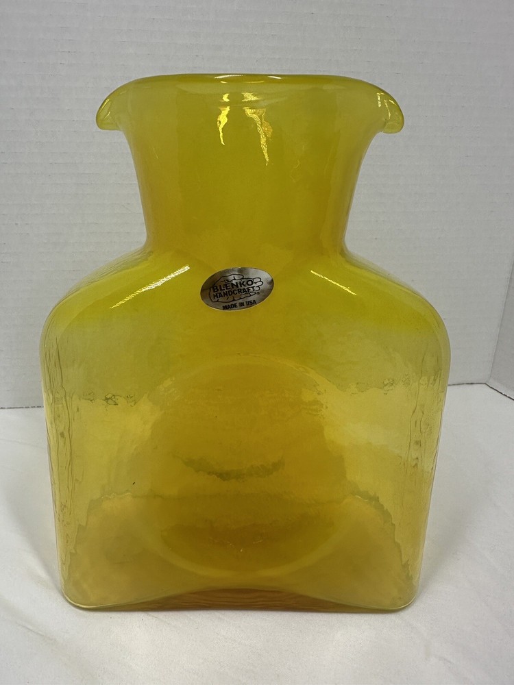 The Blenko Reynold Hall 2022 Yellow Signed Double Spout Water Pitcher is a beautifully hand-blown glass pitcher in a vibrant yellow color. Made by the renowned brand Blenko in the United States, this 2022 model features a glossy finish and is 7.5 inches tall. With its art glass production style and original design, this pitcher is not only functional but also a stunning decorative piece for any home. Perfect for serving water in style, this pitcher is a unique addition to any collection of glassware.