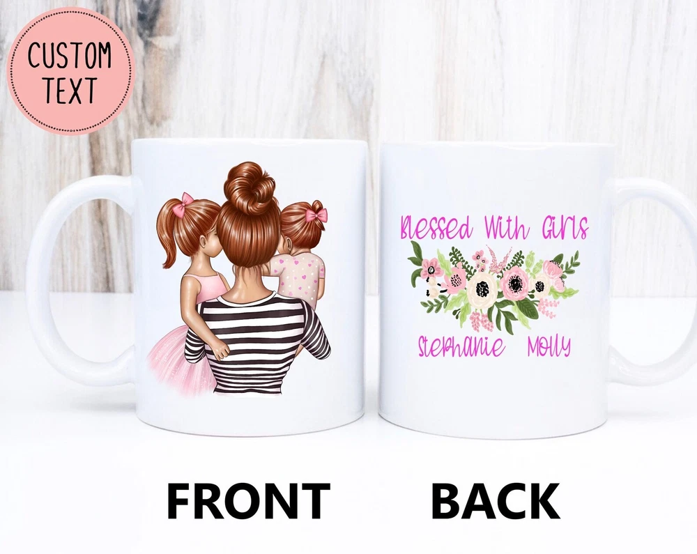 Blessed With Girls Mug Personalized Mothers Day Gift Blessed With Girls 2 Girls Product Details.. This high quality 11oz. ceramic white mug has a premium hard coat that provides crisp and vibrant color reproduction sure to last for years. Perfect for all hot & cold beverages. The highest quality printing possible is used. It will never fade no matter how many times you wash it. Material: 100% Ceramic. Print both sides. Dishwasher and Microwave Safe. High Gloss + Premium White Finish. Printed in the U.S.A. Personalized & Custom. We support personalized and custom mug to add custom, when placing an order, you can add notes to the "order note" in shipping address section. Also you can contact us directly via message. Shipping Info. Ready to ship in 1 to 2 business days, All products are made-to-order and proudly printed in the United States. Shipped by USPS and DHL, You will receive your order in 5-7 days. Replace & Refund. All products are defective during shipping broken, chipped will be replaced free of charge. You are not satisfied with the product, we will refund 100% money to you. If any other issues arise, please do not hesitate to message, we would be more than happy to assist you.