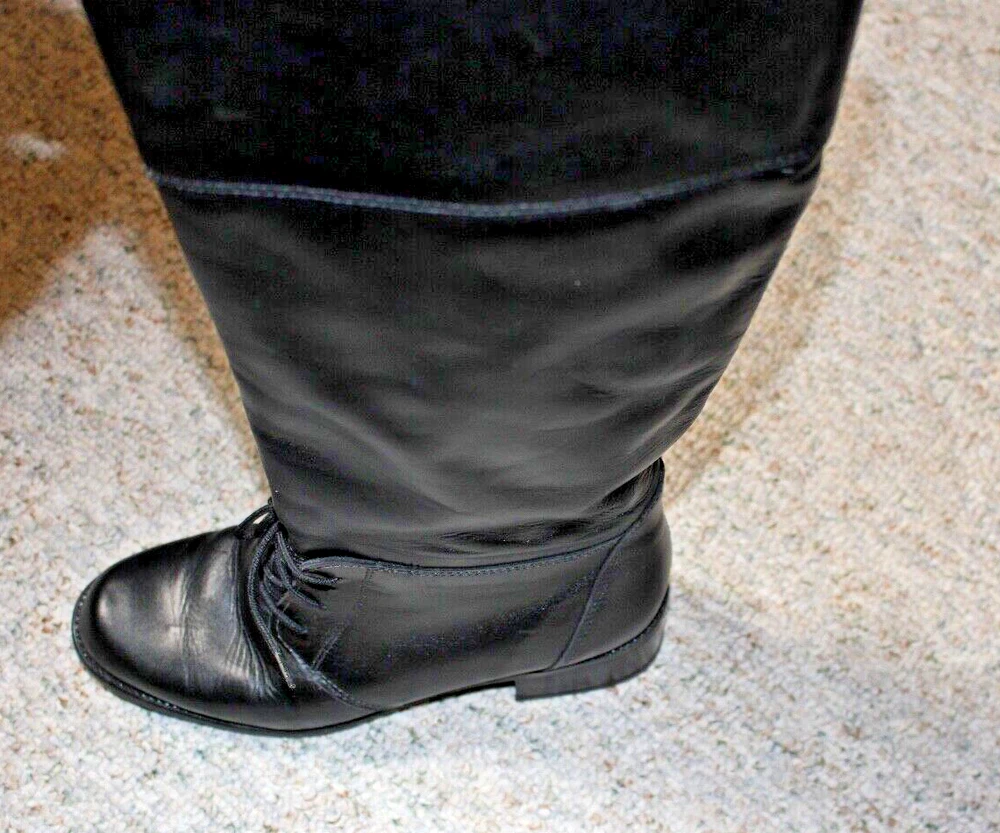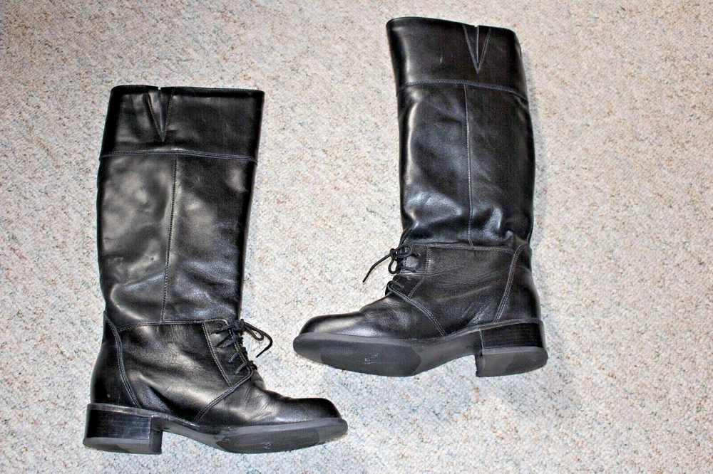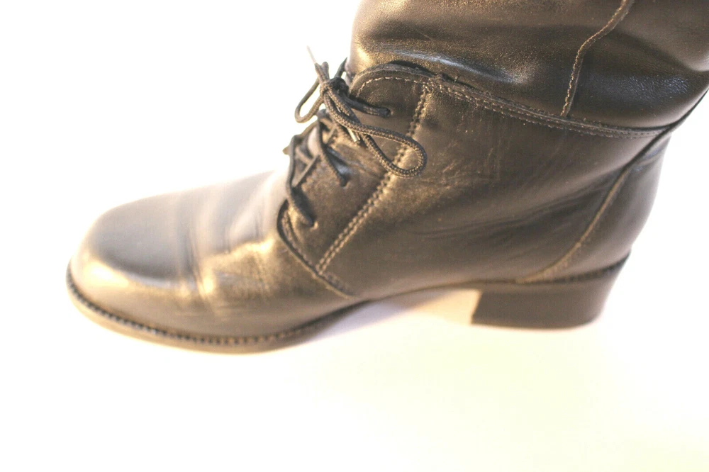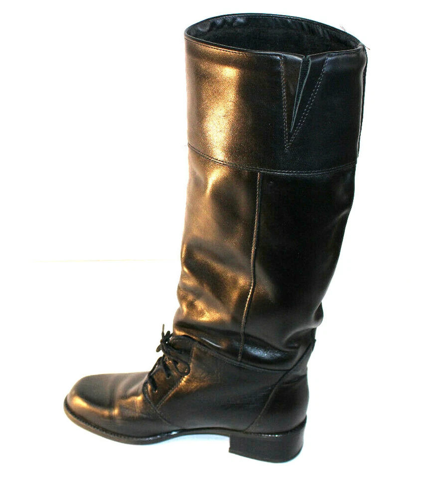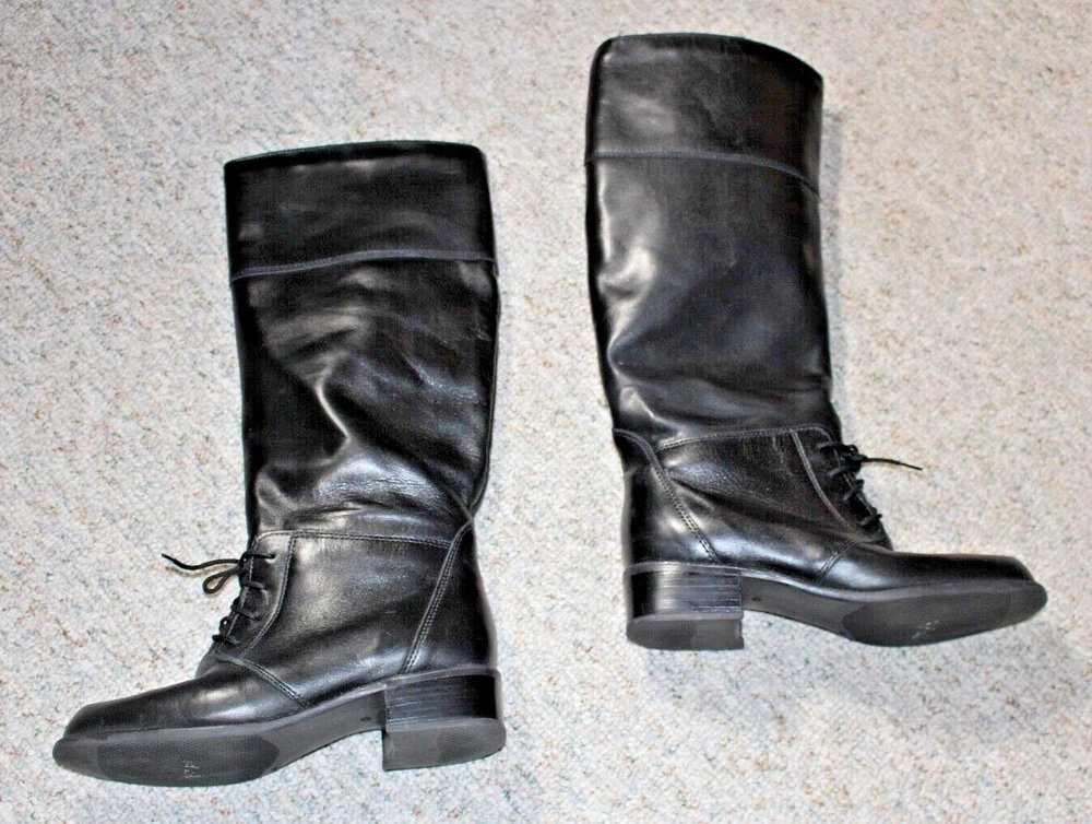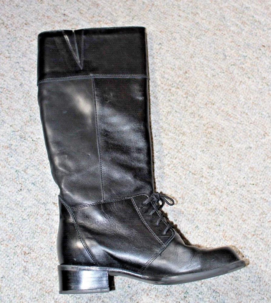 Western Womens Riding Boots Blondo 7 1/2 B Black w Lacing Waterproof...pull on boot with elastic gusset at top of calf, opening is approx 12.5"...height is 16 1/4", widest part of sole is 3 3/8"and 9.75 inches from front to back at wall...very classy style and ready for the equestrian or the woman that likes this style...bottom of boots are stamped 37, label inside of boot says 7.5 B Be sure to see all the New items in the Store...New added daily Thank You!